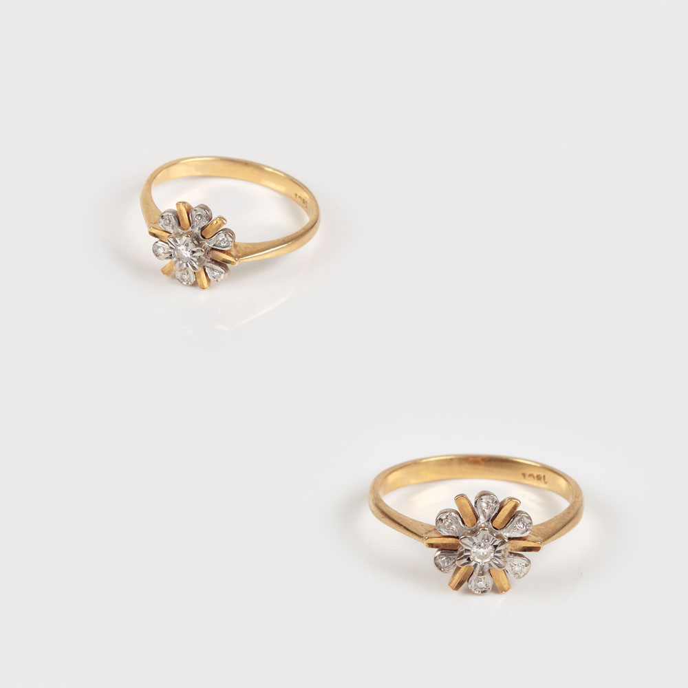 aur galben 18 k; 7 diamante cu tăietură simplă briliant cca. 0,05 ct total; culoare K, claritate SI2