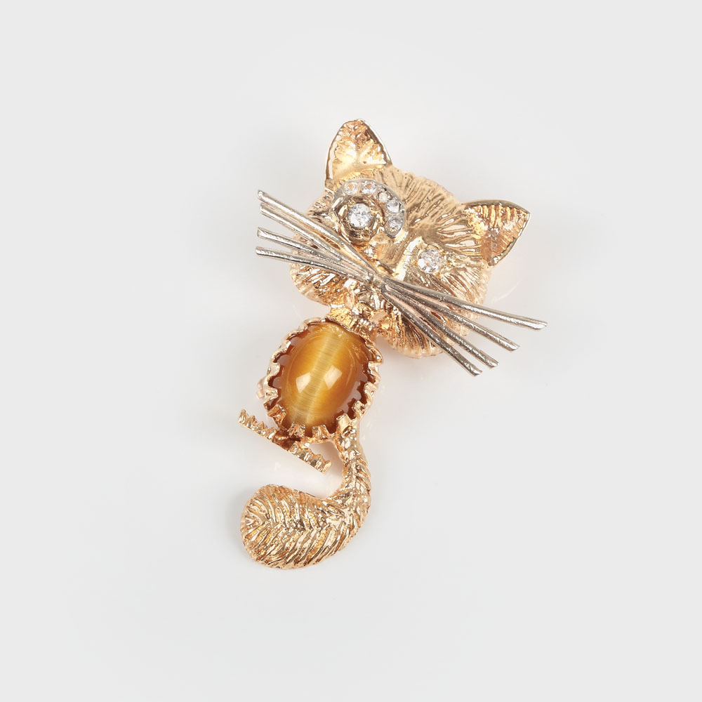 Broșă inedită din aur ce reprezintă o pisică redată naturalist, decorată cu briliante și ochi-de-tigru, ac de prindere cu castagnetă.