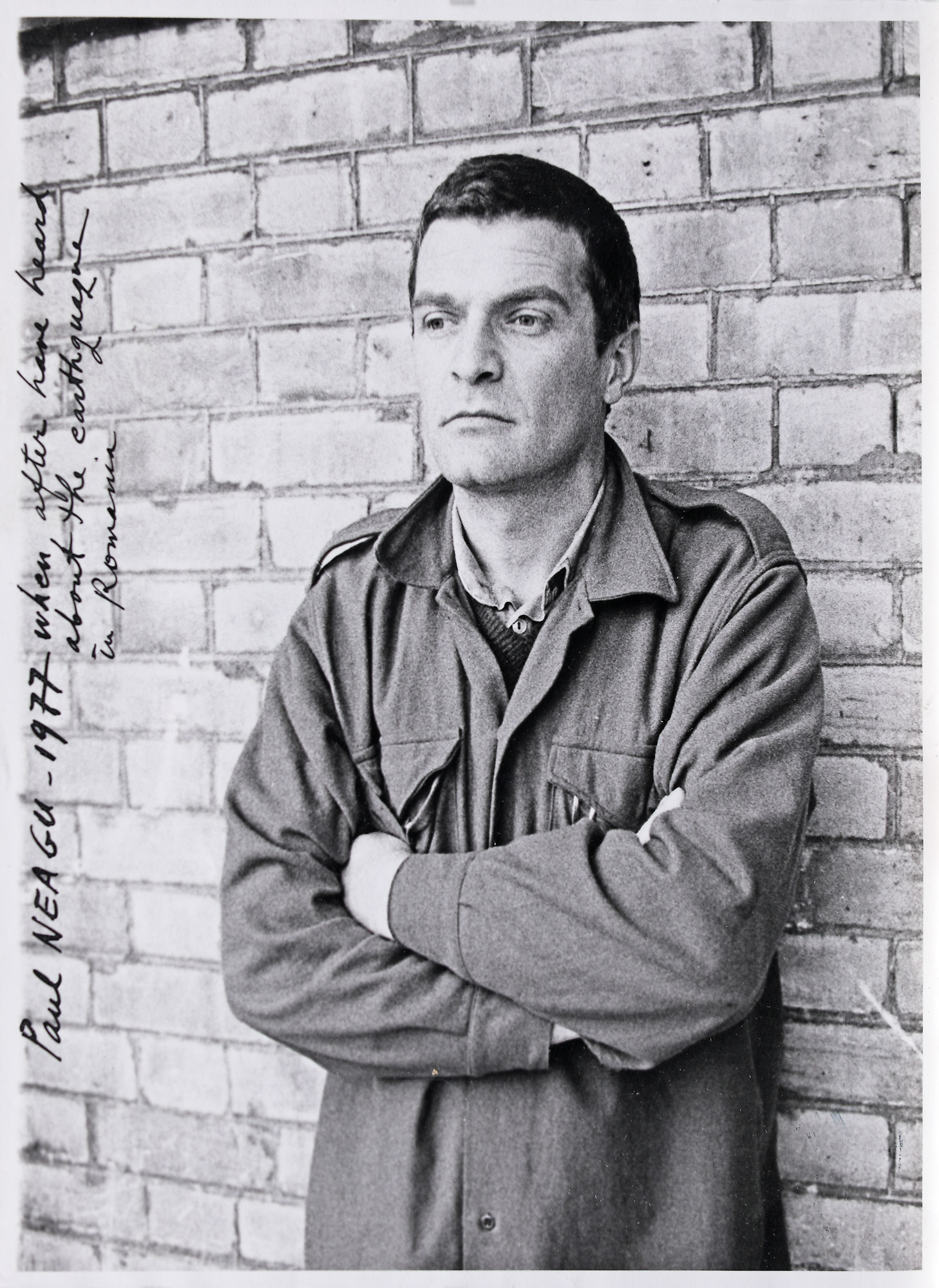 63. Fotografie a lui Paul Neagu, cu adnotări olografe, reprezentându-l pe artist comemorând public cutremurul din 1977, provine din arhiva personală a lui Paul Neagu
