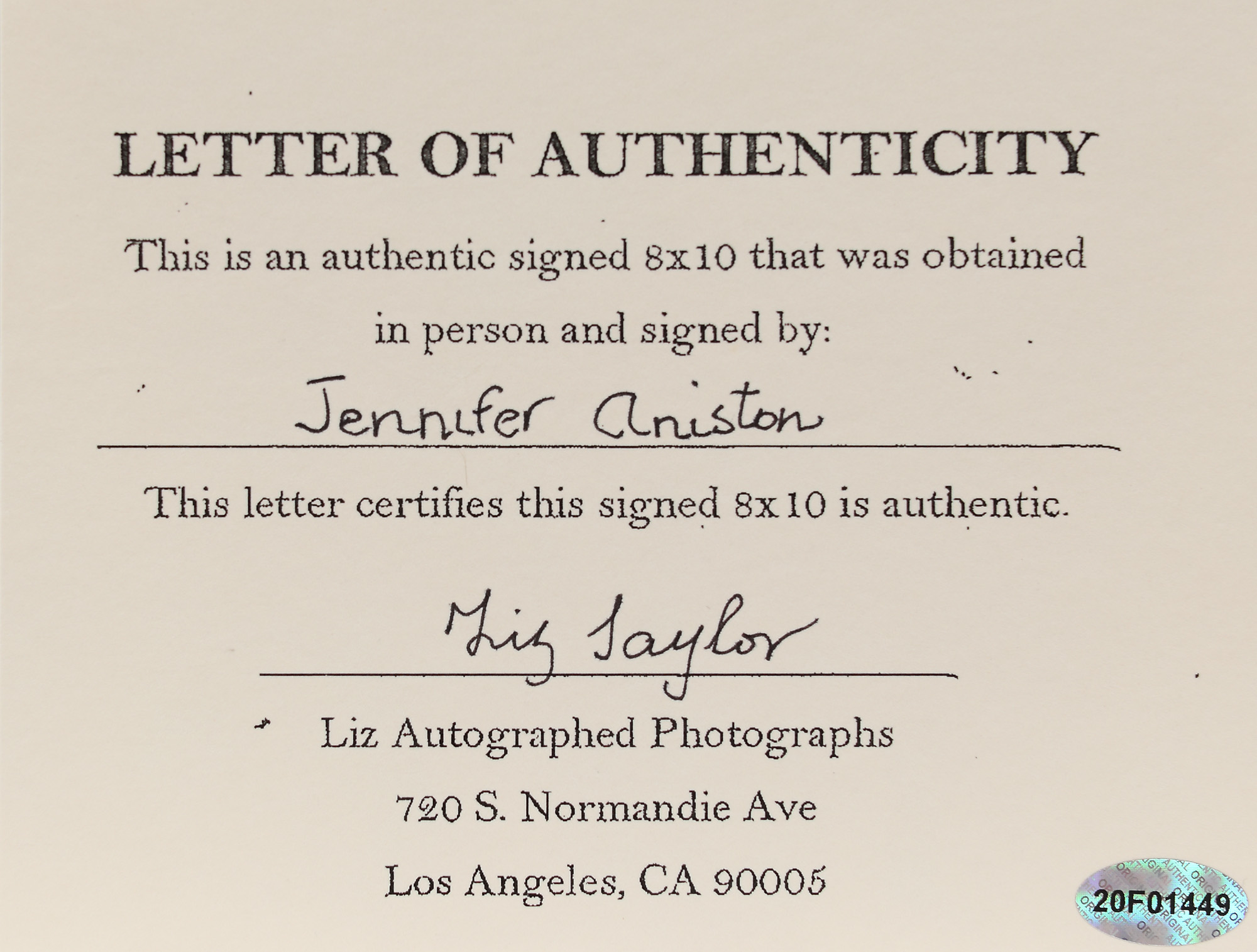 72. Fotografie ilustrând-o pe Jennifer Aniston, cu semnătura olografă a actriței, însoțită de certificatul de autenticitate