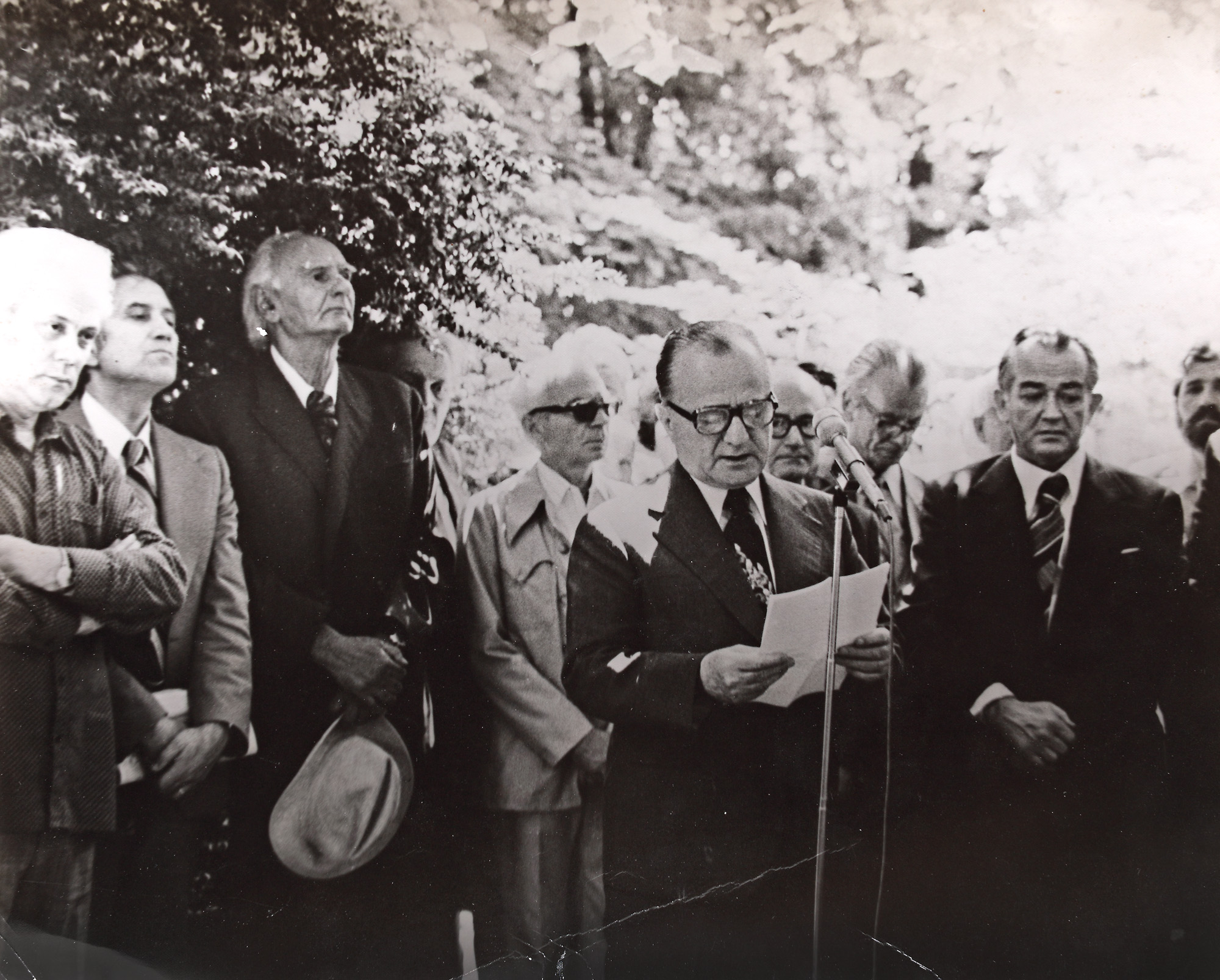 76. Fotografie ilustrându-i pe Geo Bogza, Alexandru Balaci, George Macovescu, Traian Iancu, la mormântul lui Eminescu, fotograf Ioan Negrea, București, 1979, provine din colecţia fostului ministru de externe George Macovescu