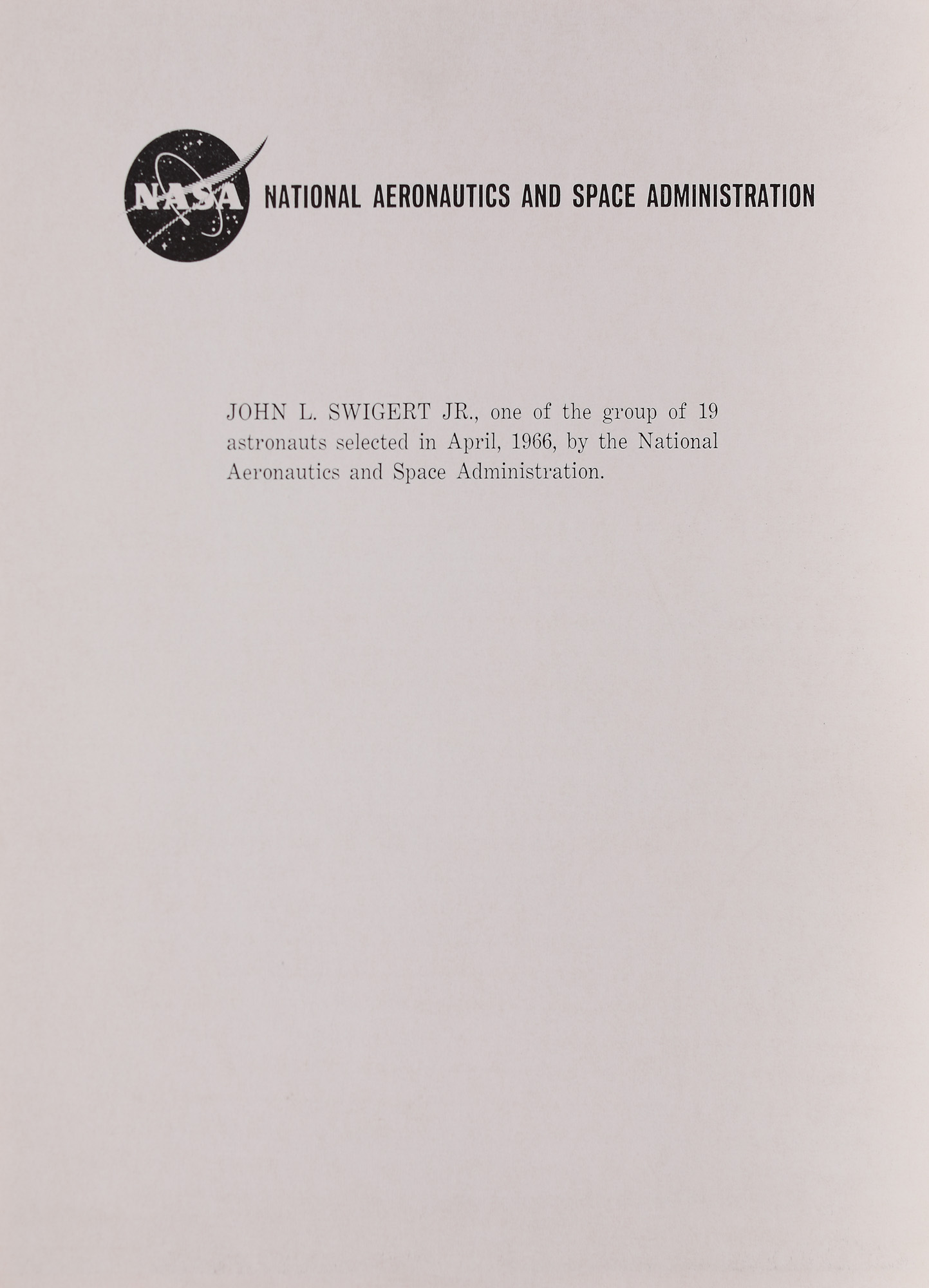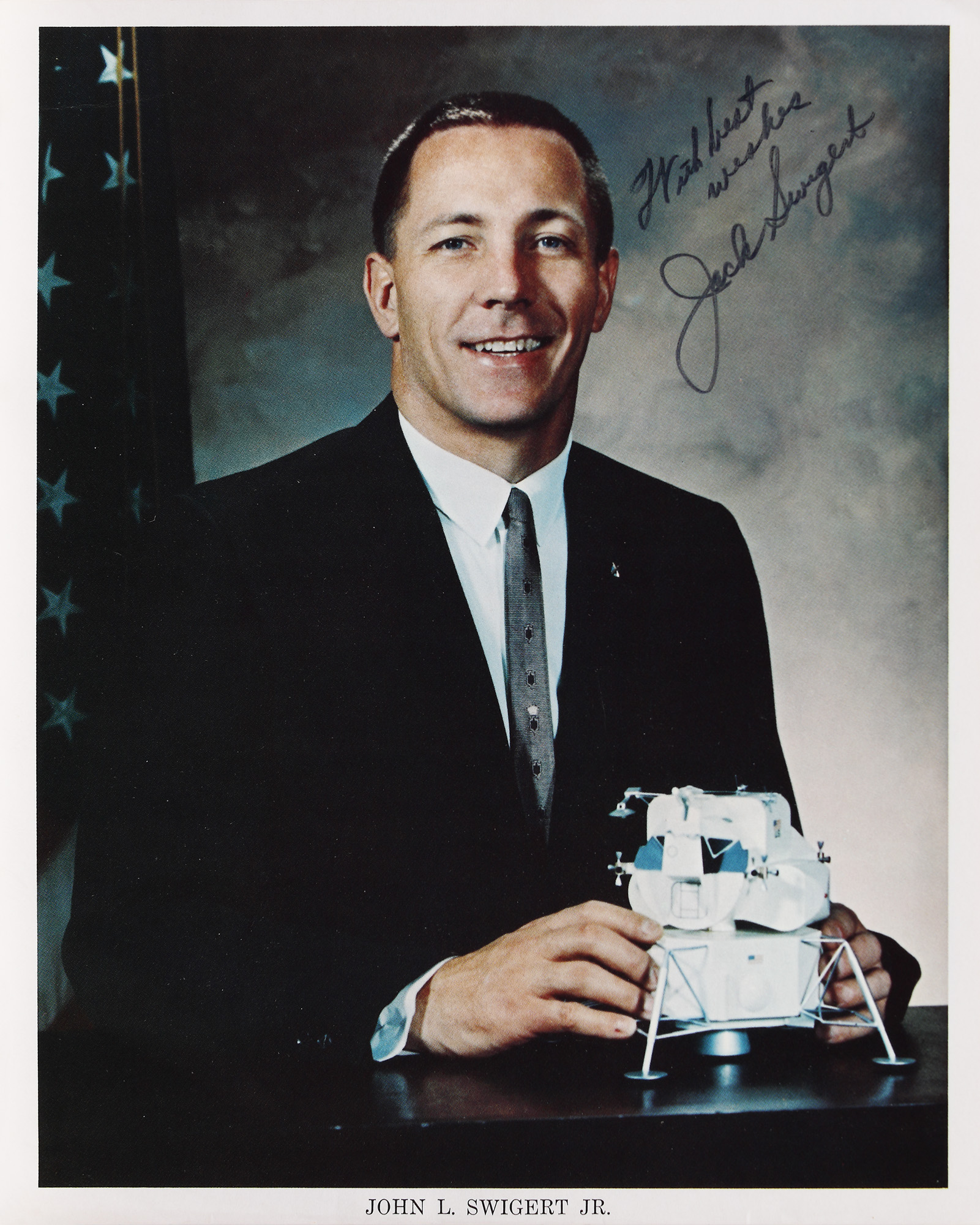 65. Fotografie oficială NASA, ilustrându-l pe astronautul american John Leonard Swigert Jr., pilotul misiunii Apollo 13, 1970, cu semnătura olografă și plicul original