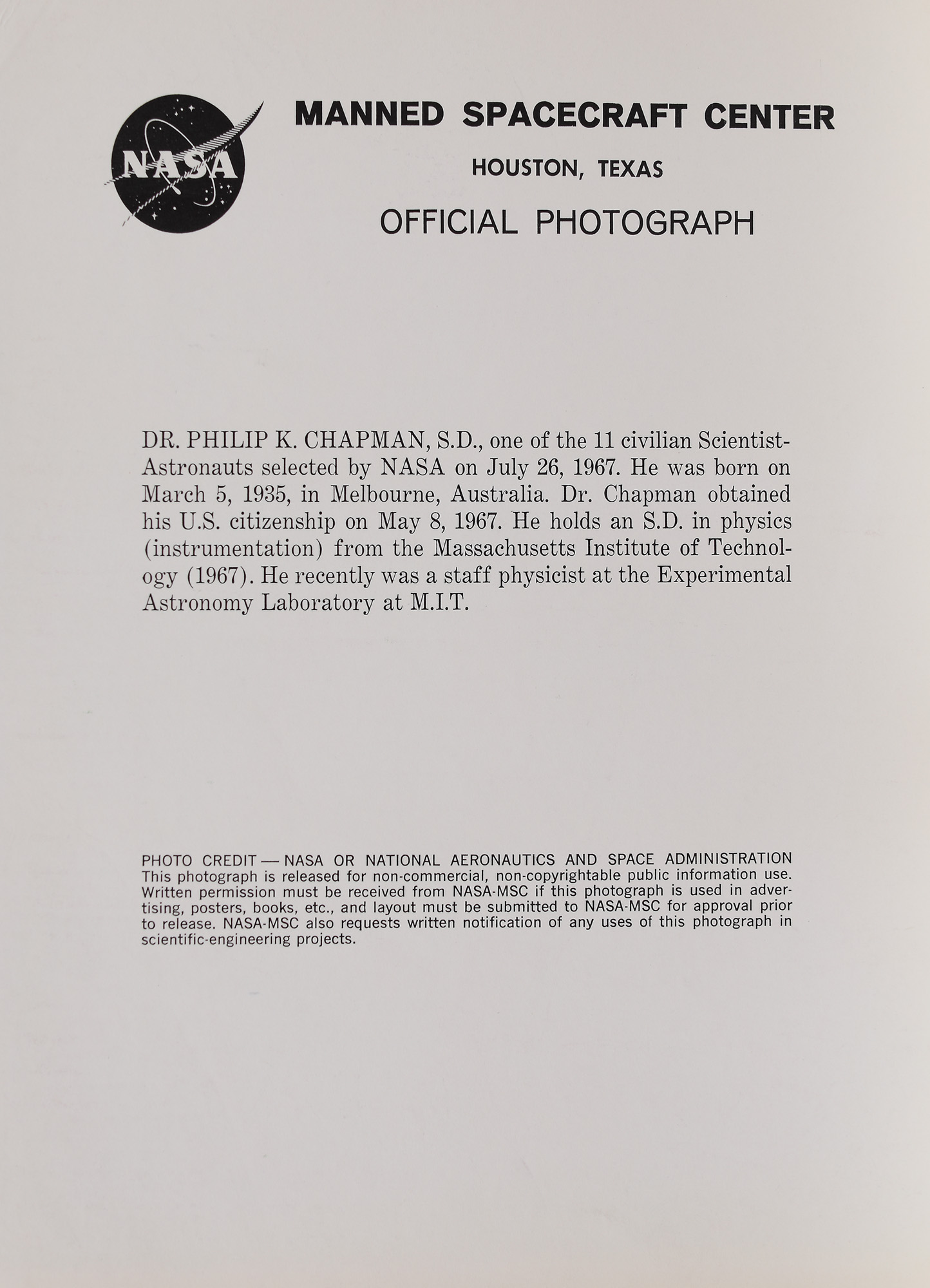 66. Fotografie oficială NASA, ilustrându-l pe astronautul american Philip K. Chapman, primul astronaut american de origine australiană, 1967, cu semnătura olografă și plicul original