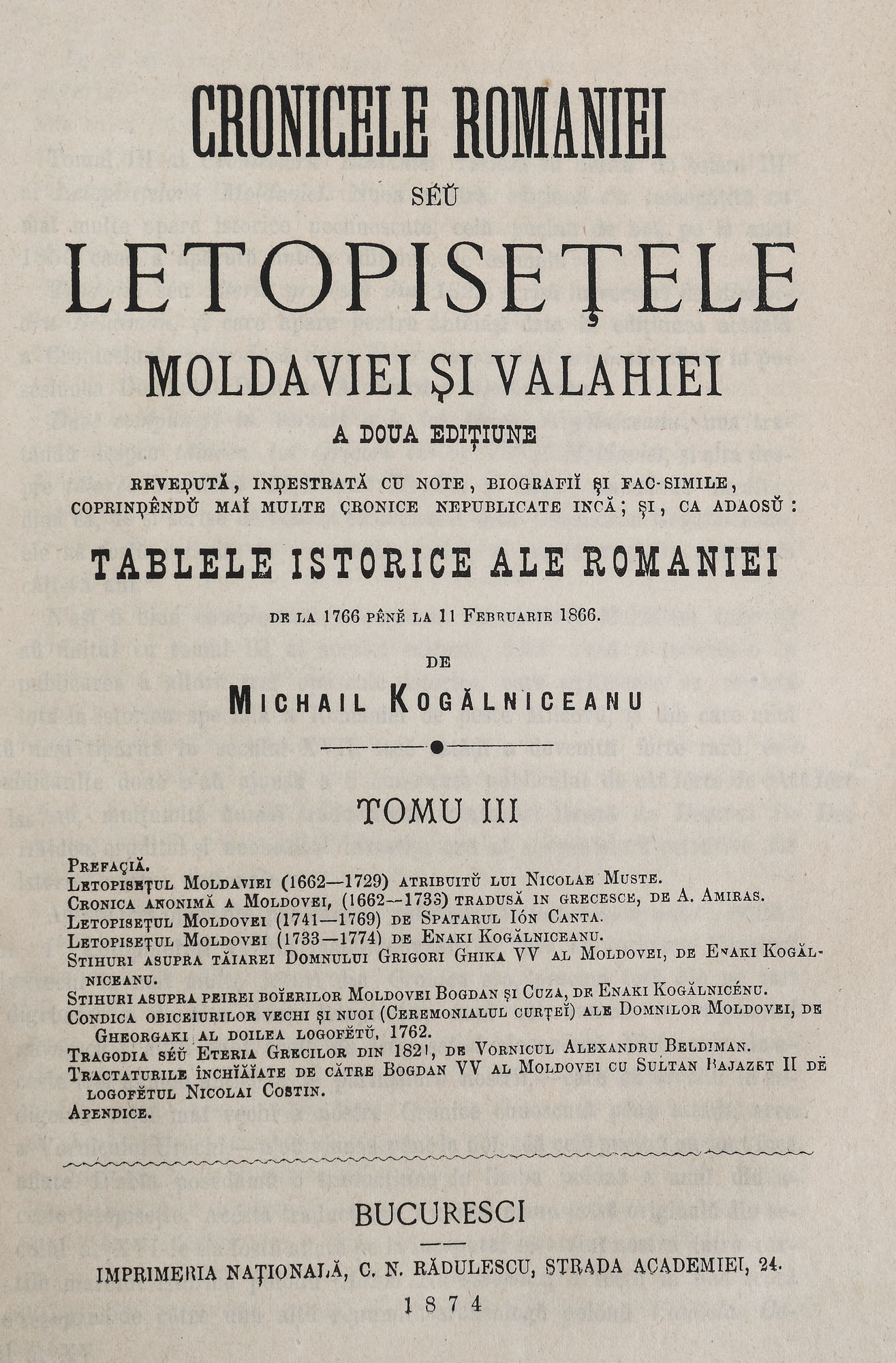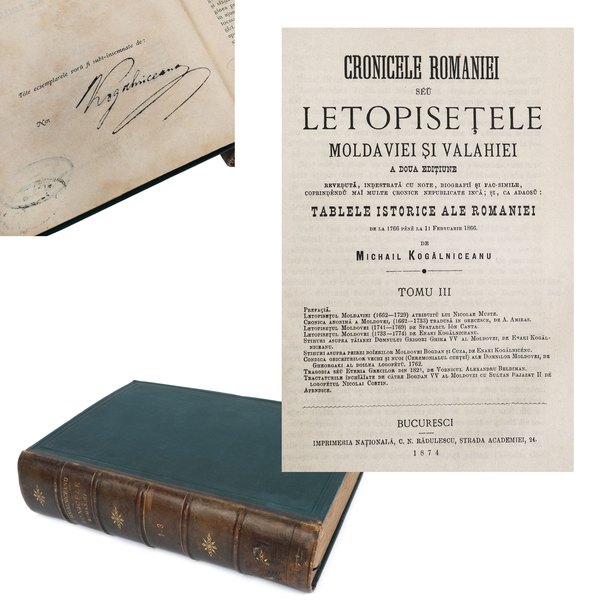 82. Colegat de trei volume "Cronicile României sau letopisețele Moldovei și Valahiei", de Mihail Kogălniceanu, București, 1872