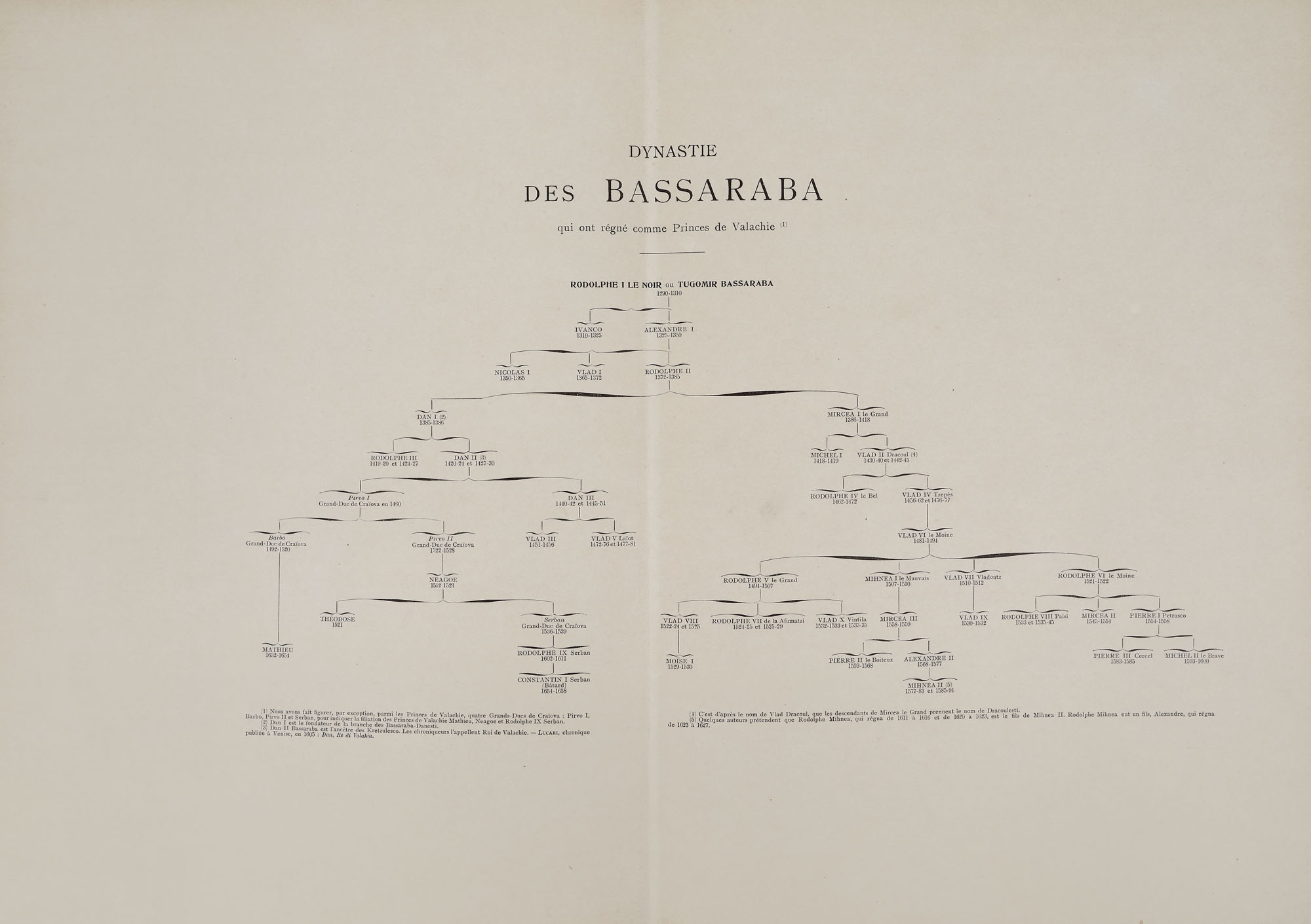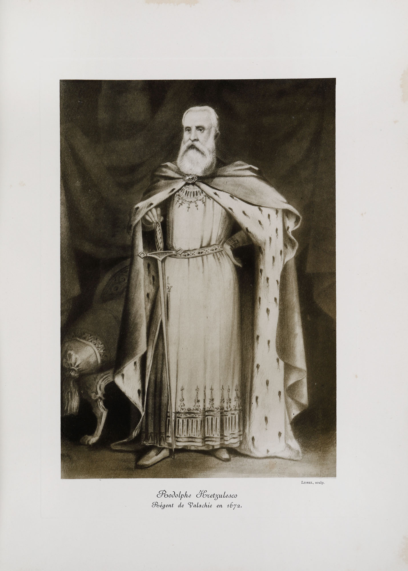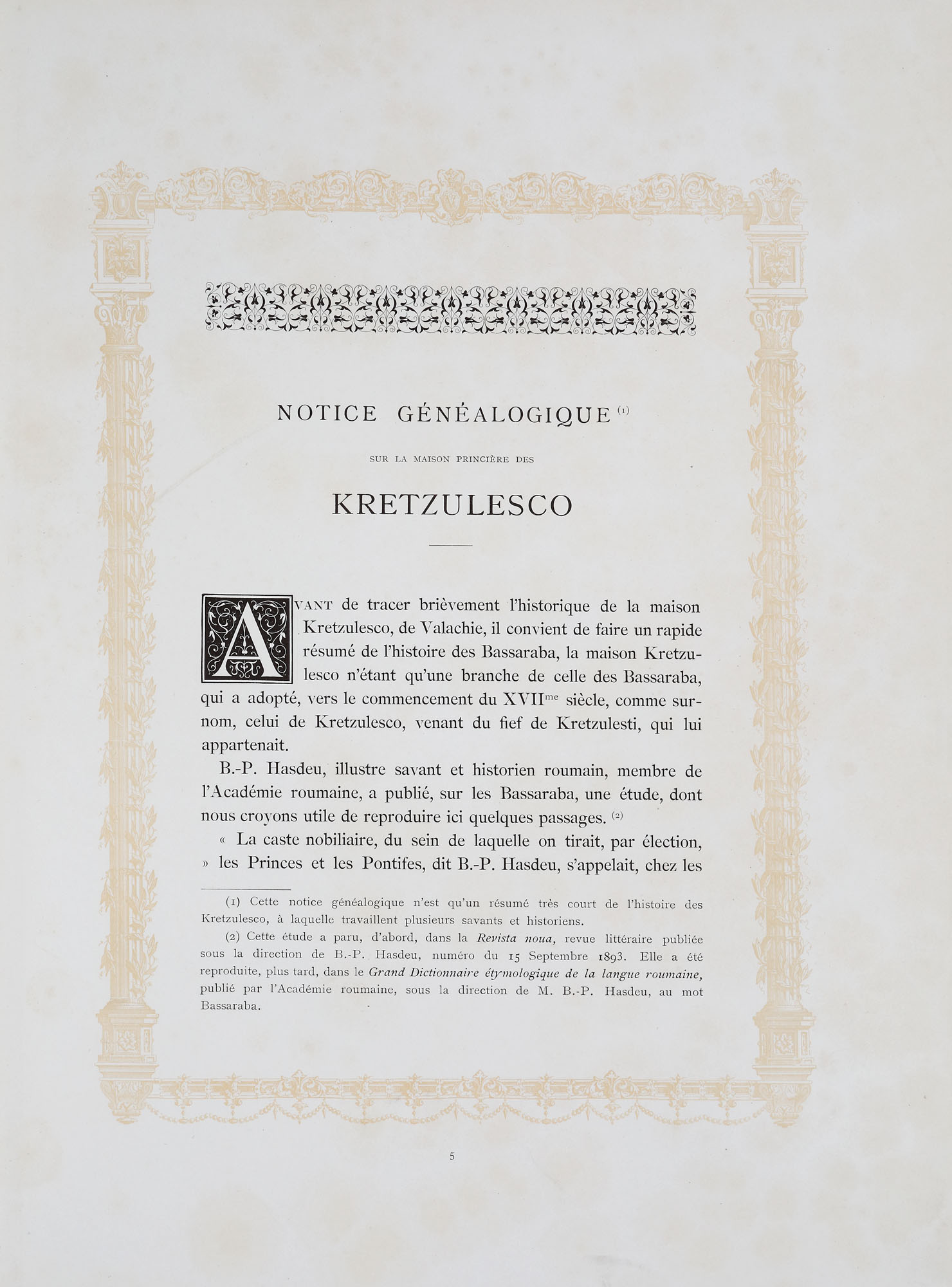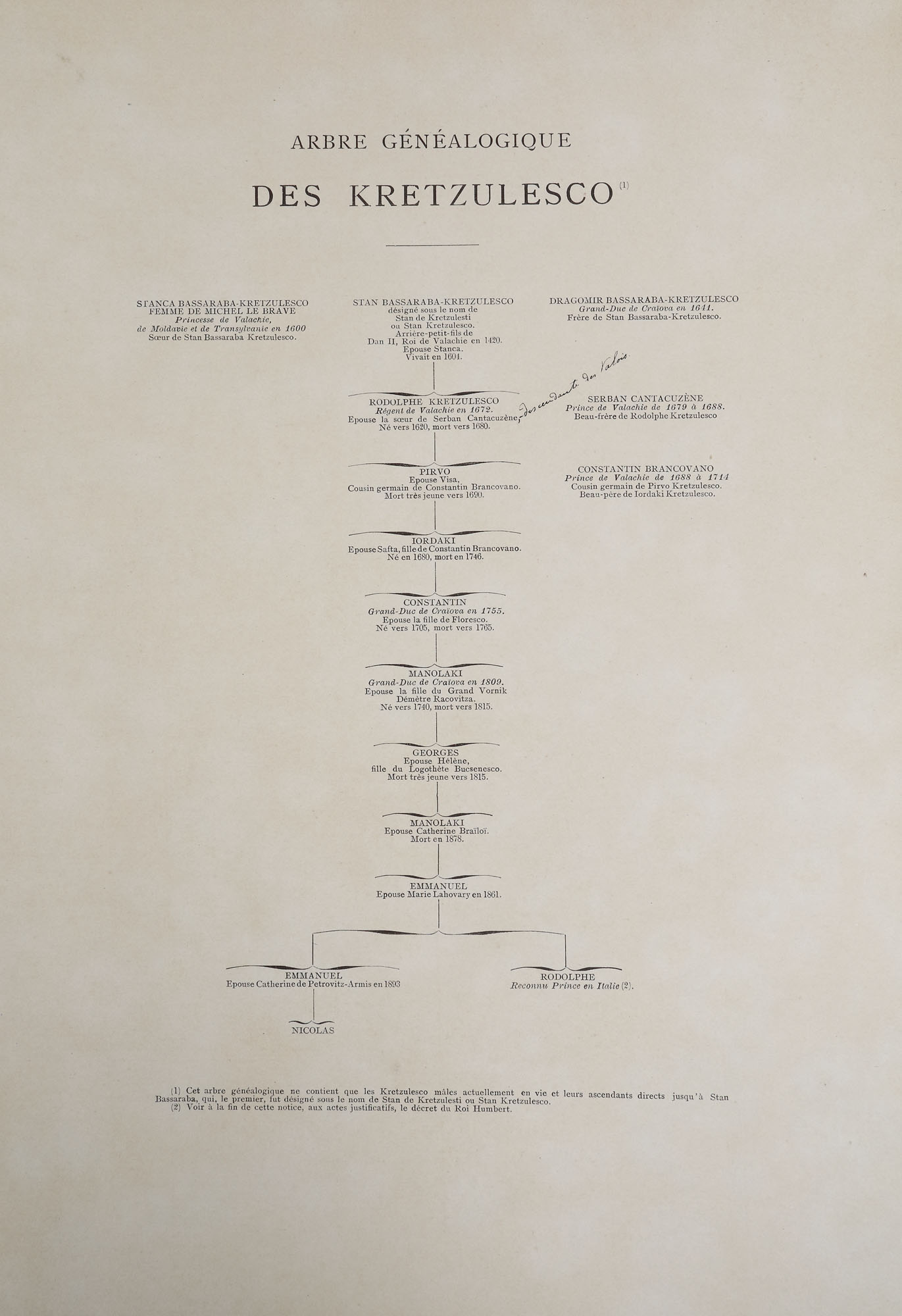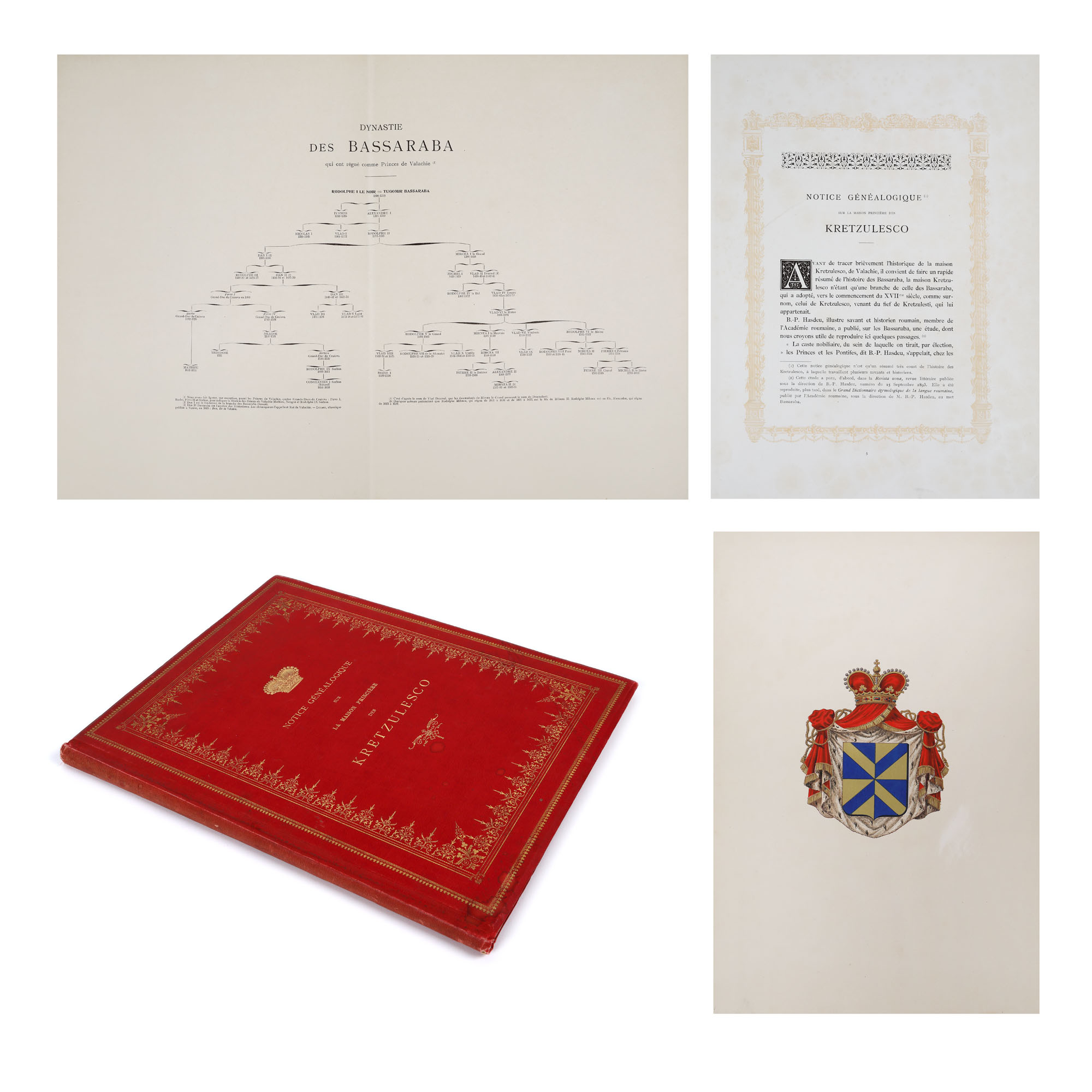 Lucrare monografică de referință, ce prezintă istoria familiei Kretzulescu și descendența sa din neamul Basarabilor. Cuprinde o cromolitografie cu stema familiei dar și alte planșe în afară de text ce ilustrează tablouri istorice și portrete. Ediție foarte rară, tipărită în limba franceză într-un tiraj de 100 de exemplare, cel de față are nr. 92. Legătură editorială originală, realizată integral din pânză lipită pe carton imprimată cu auriu.
