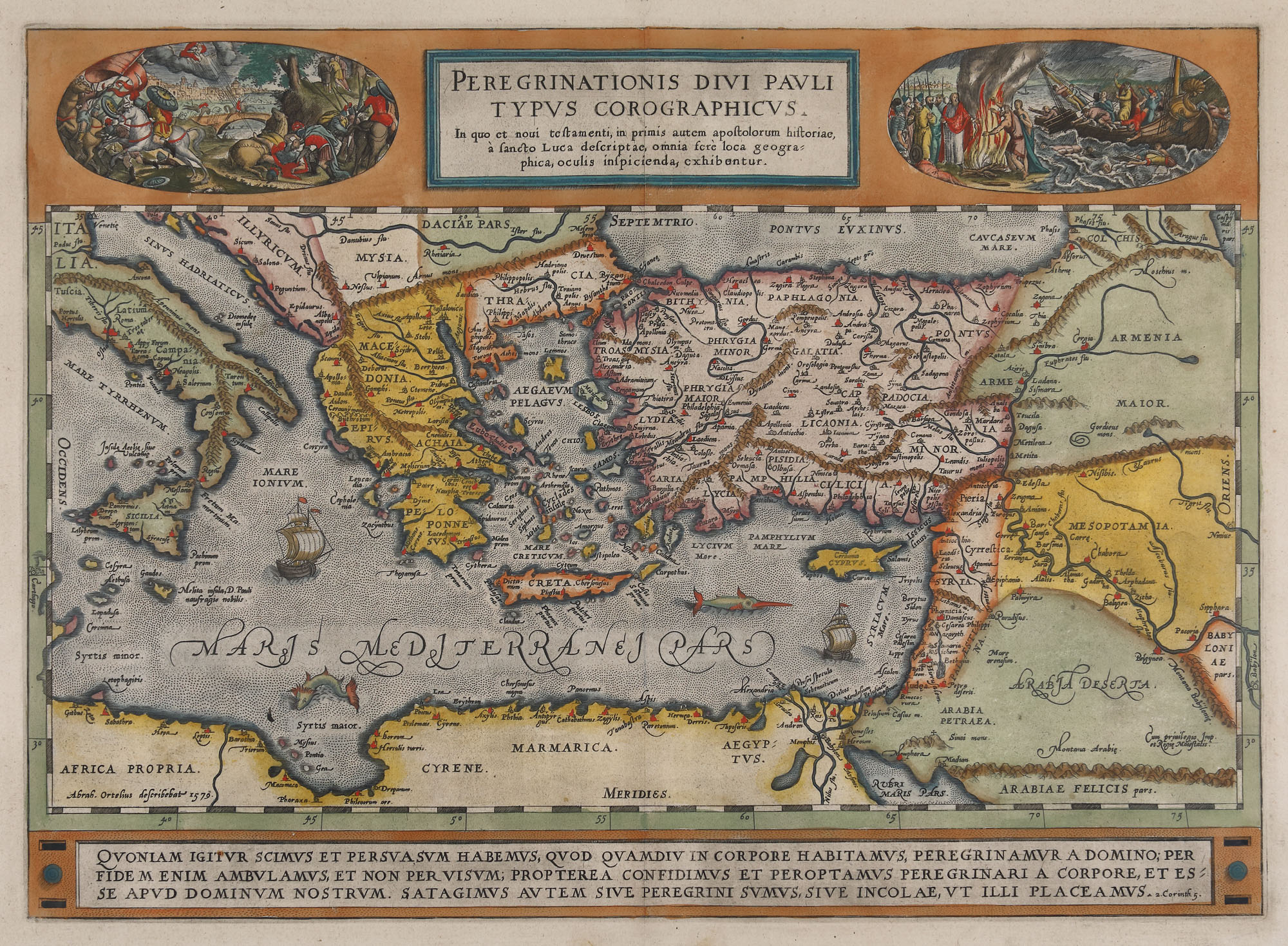 131. Hartă ”Călătoriile Sfântului Apostol Pavel în bazinul mediteranean”, de Abraham Ortelius, ediţia Orbis Terrarum, 1579