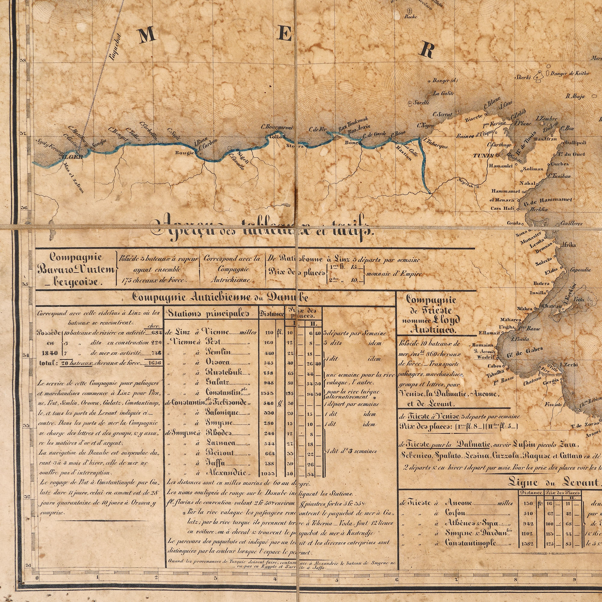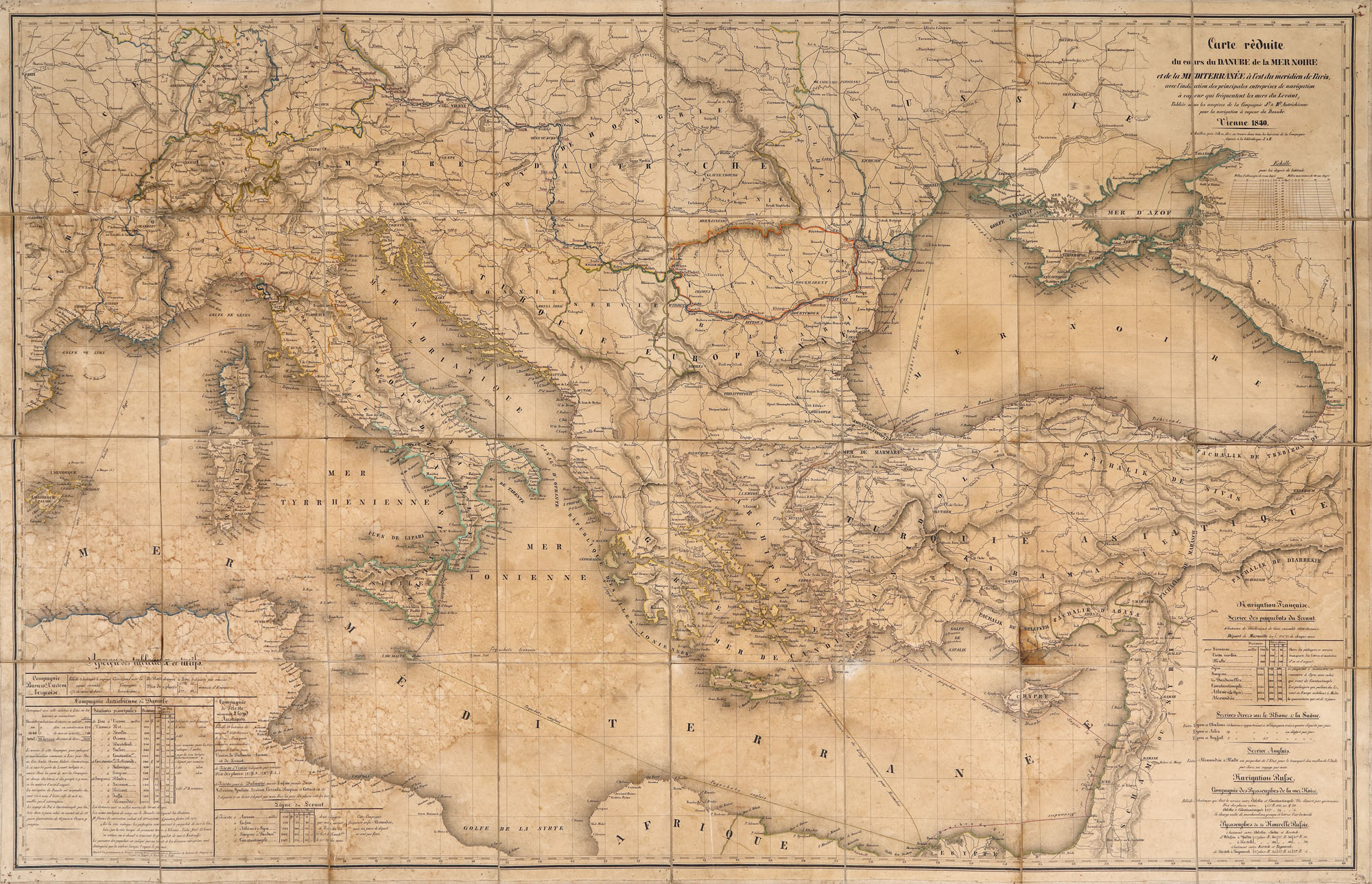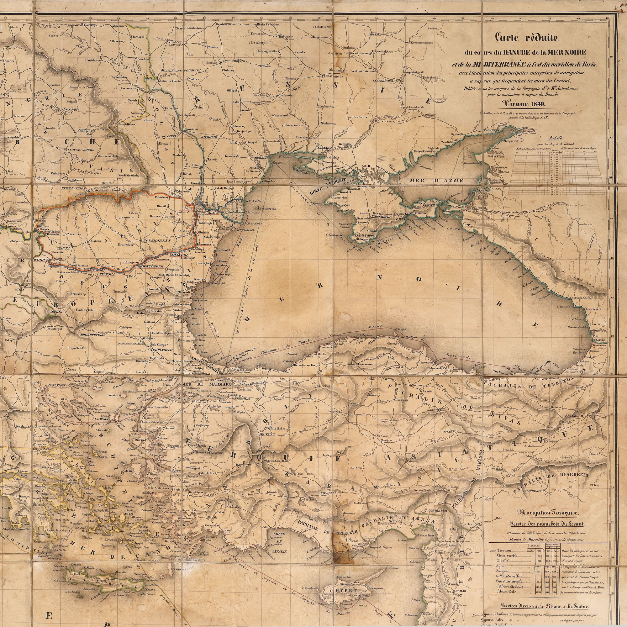Harta indică principalele companii de navigație cu abur care frecventau mările Levantului. Publicată sub auspiciile Companiei J & R, Austria.
