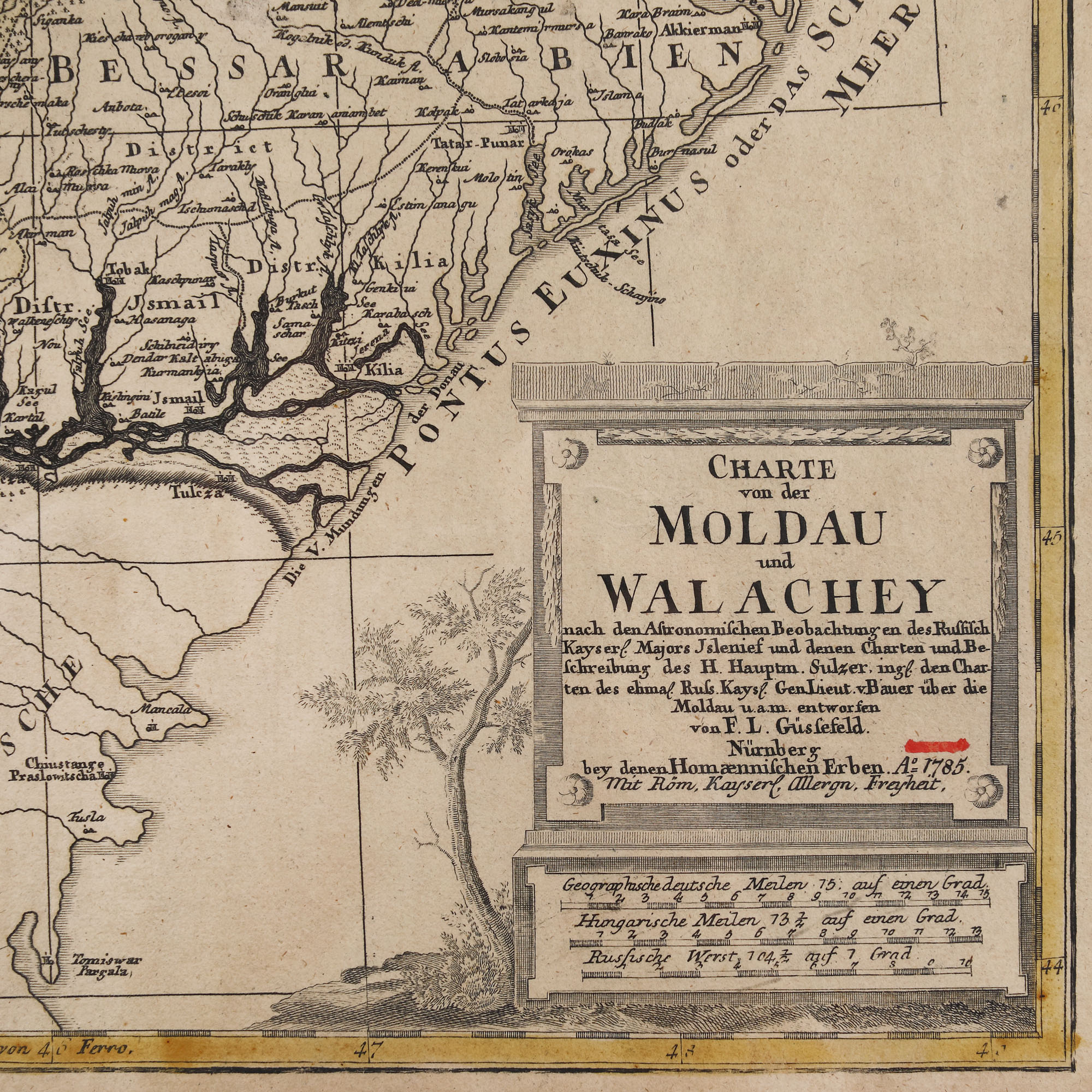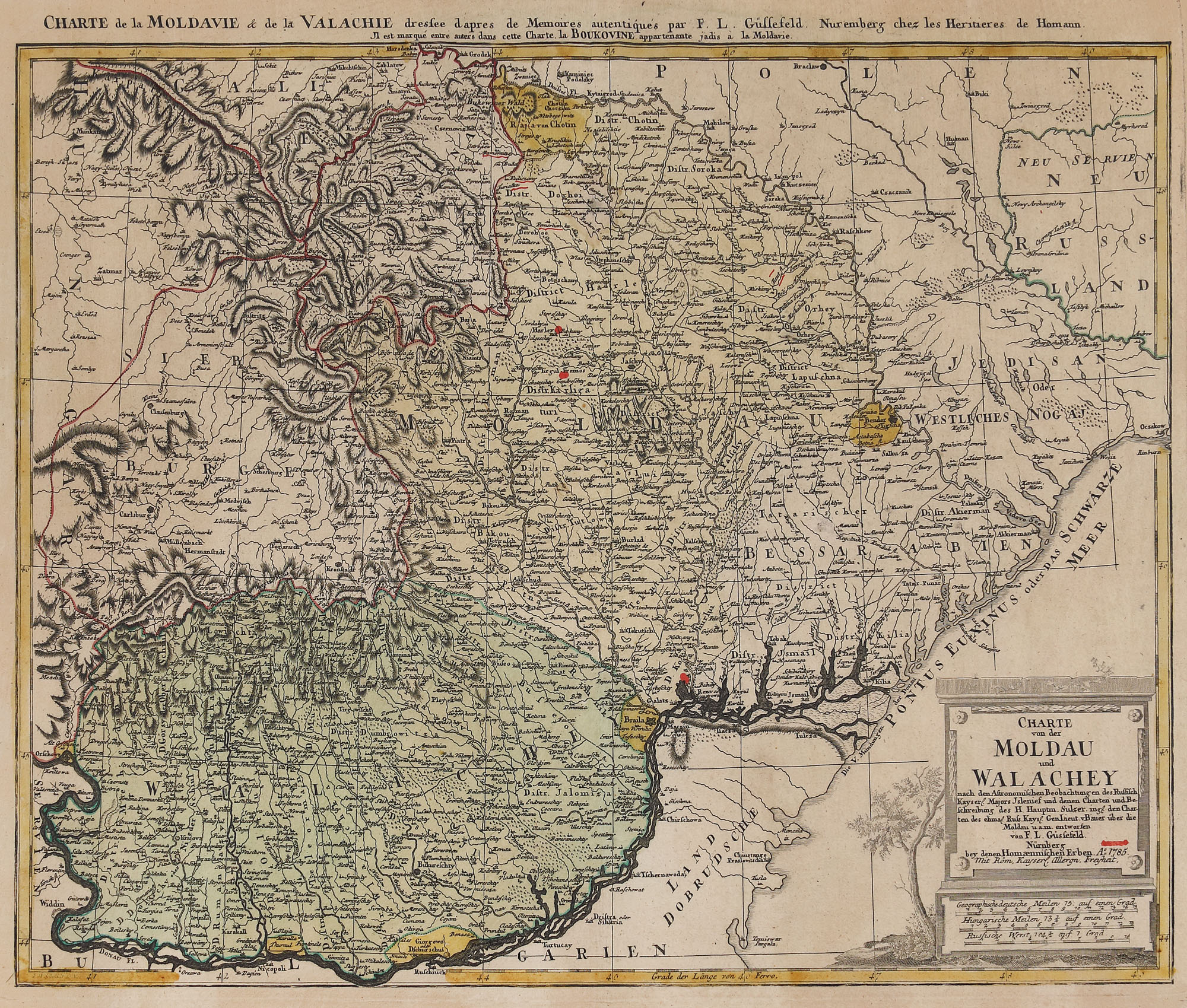 95. Hartă ”Moldova și Valahia”, de Franz Ludwig Güssefeld, Nürnberg, 1785