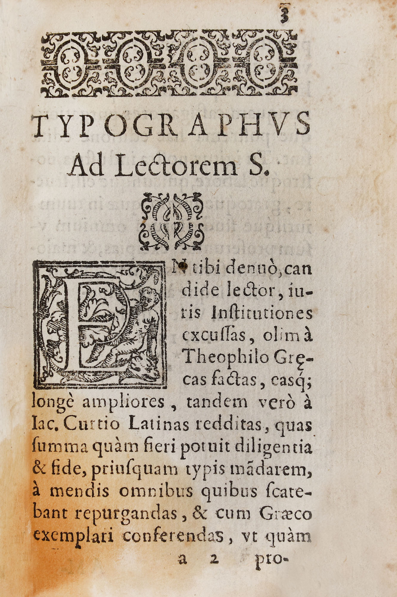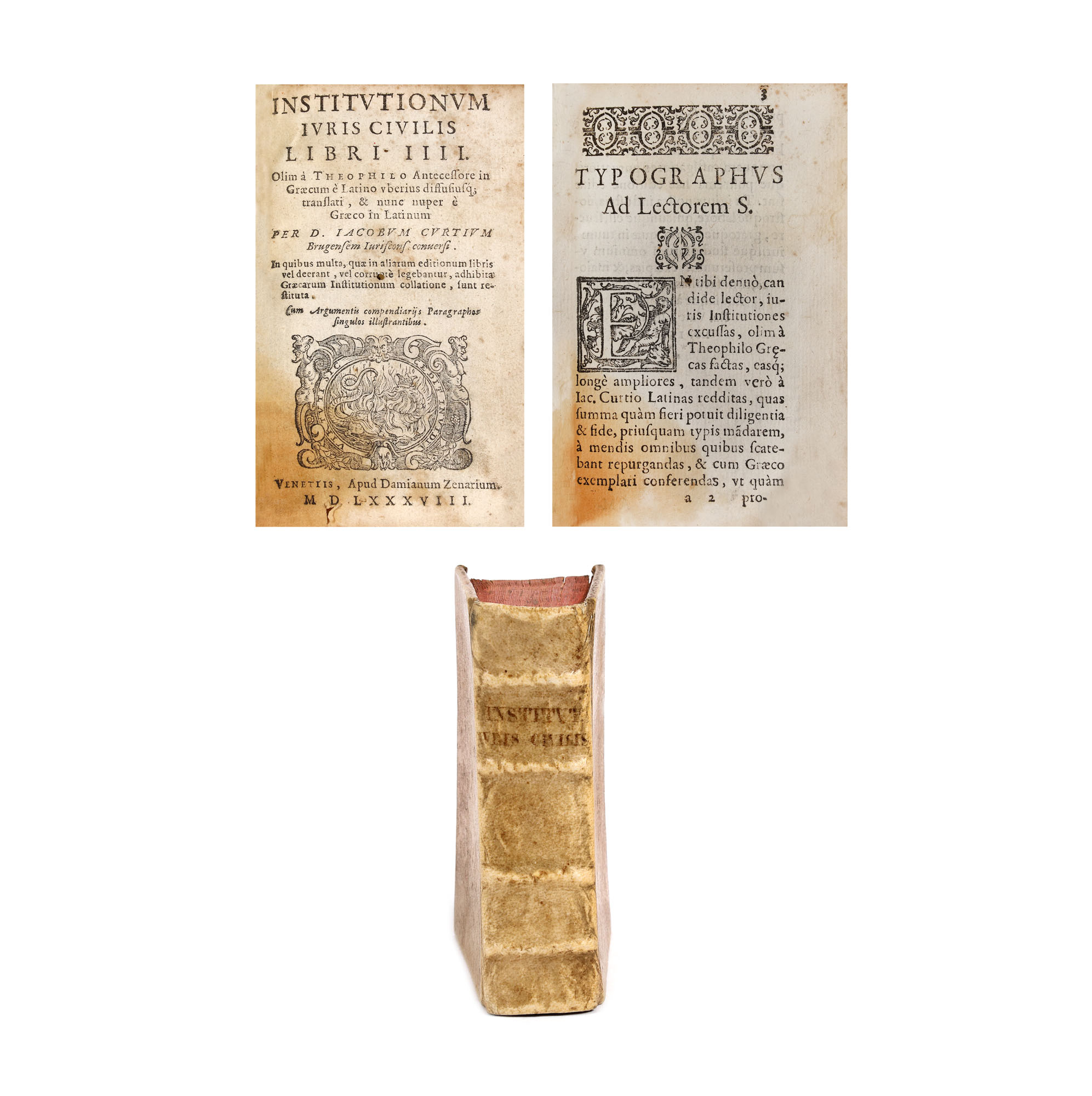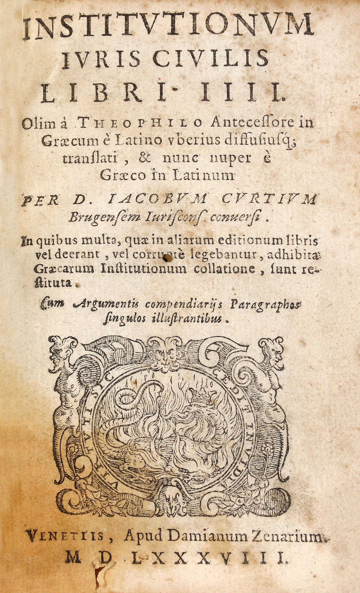 Lucrarea aparține istoricului și juristului bizantin Teofilo detto Antecessore, în vremea Împăratului Iustinian. Tipărită la Veneția după Damian Zenarium. Format in 16º, cu 535 de pagi numerotate și 3 file nenumerotate, oglinda textului 9.5 x 5 cm, cu 36 de rânduri în plină pagină. Legătură de perioadă din pergament lipit pe carton cu 5 registre la cotor și titlul lucrării ”Insitut. iuris civilis”.