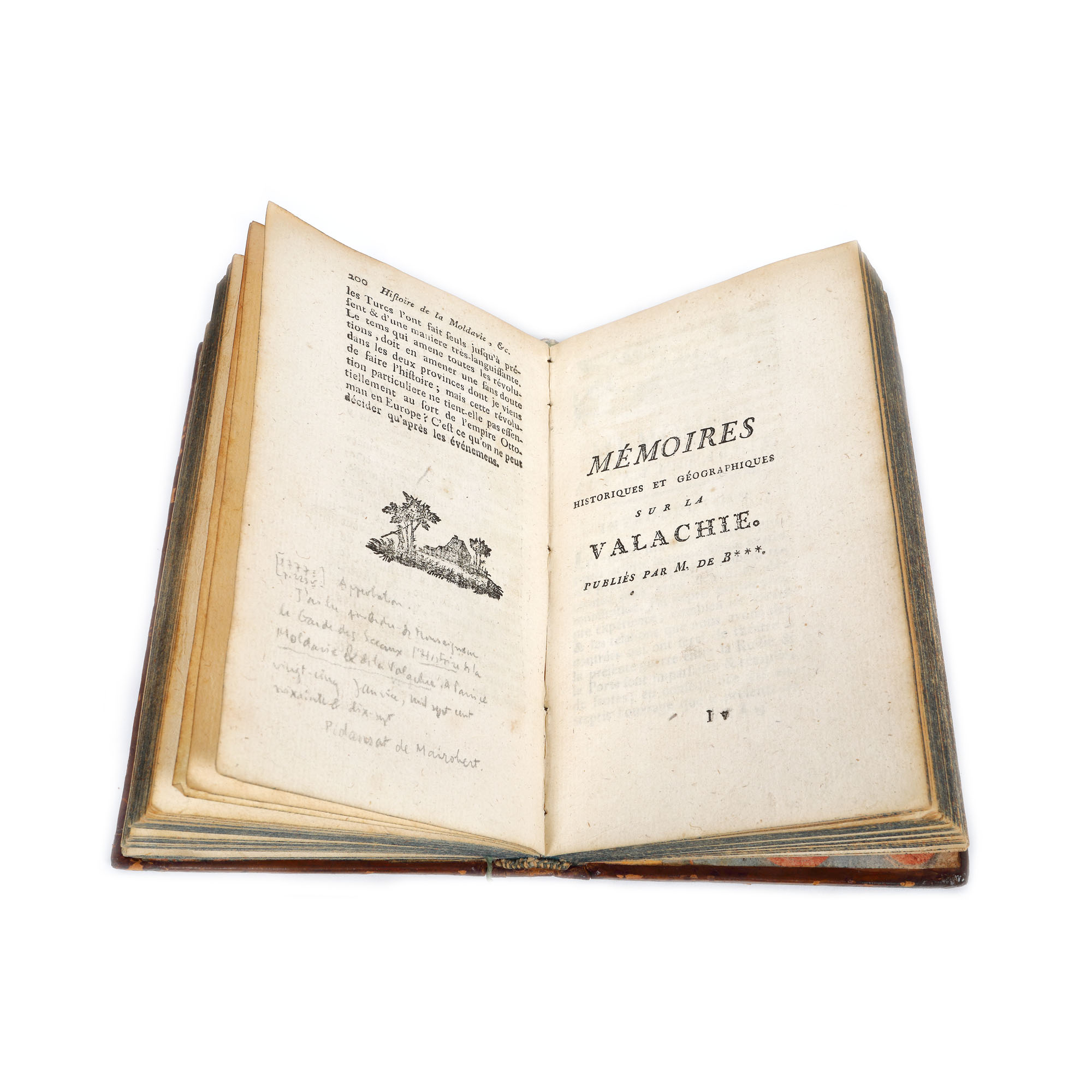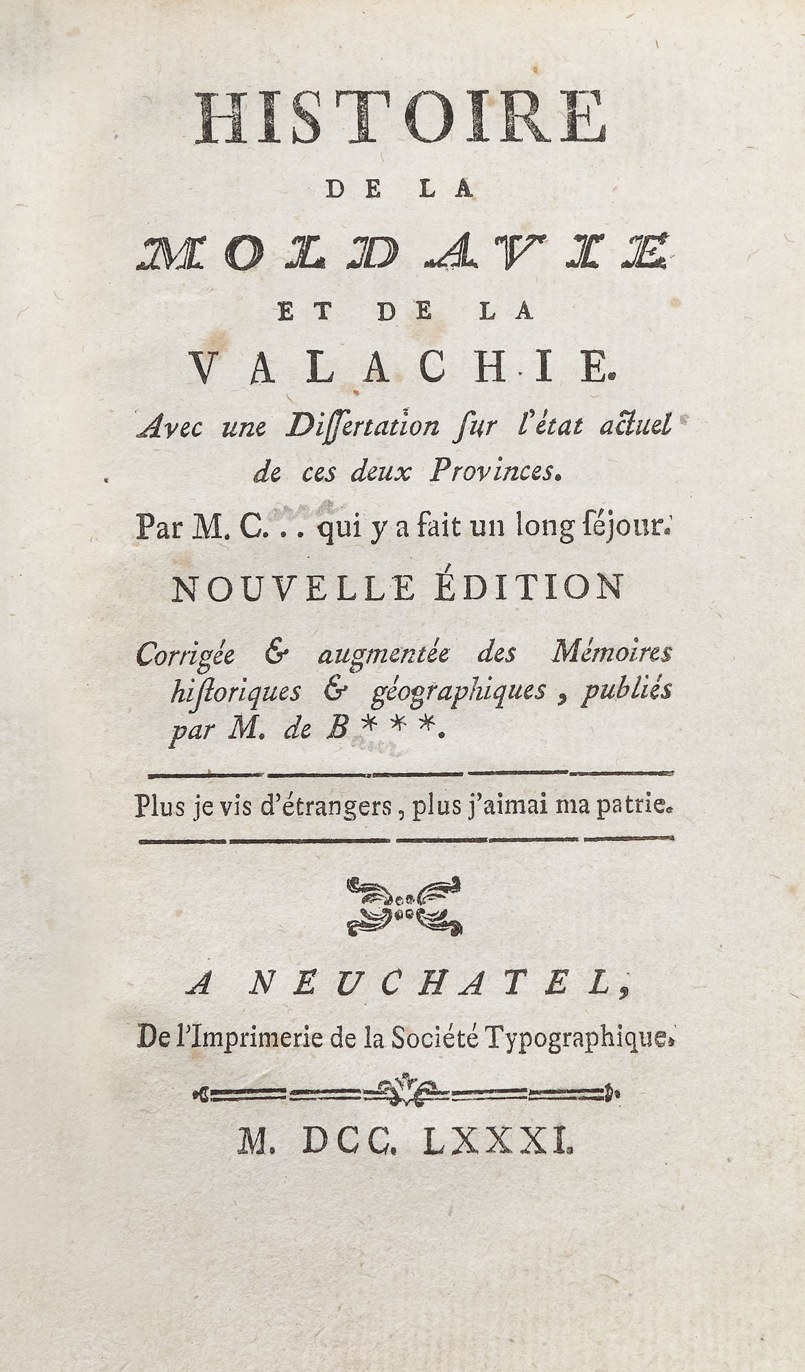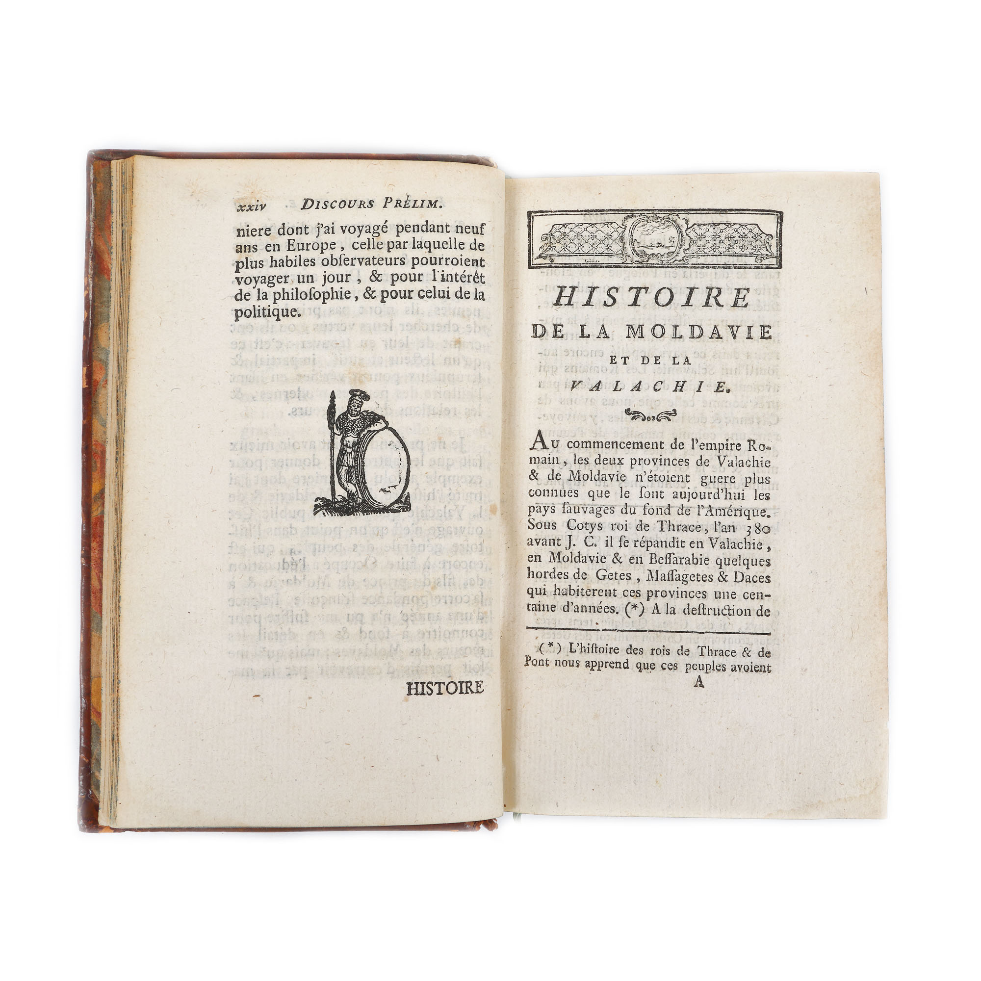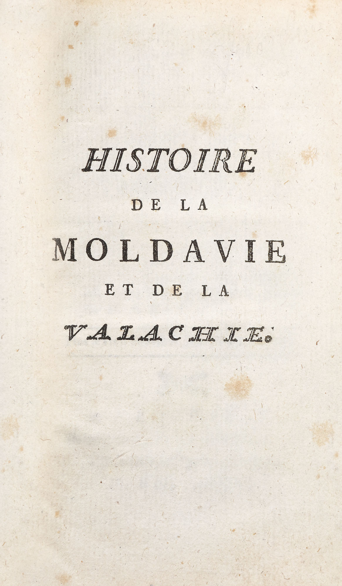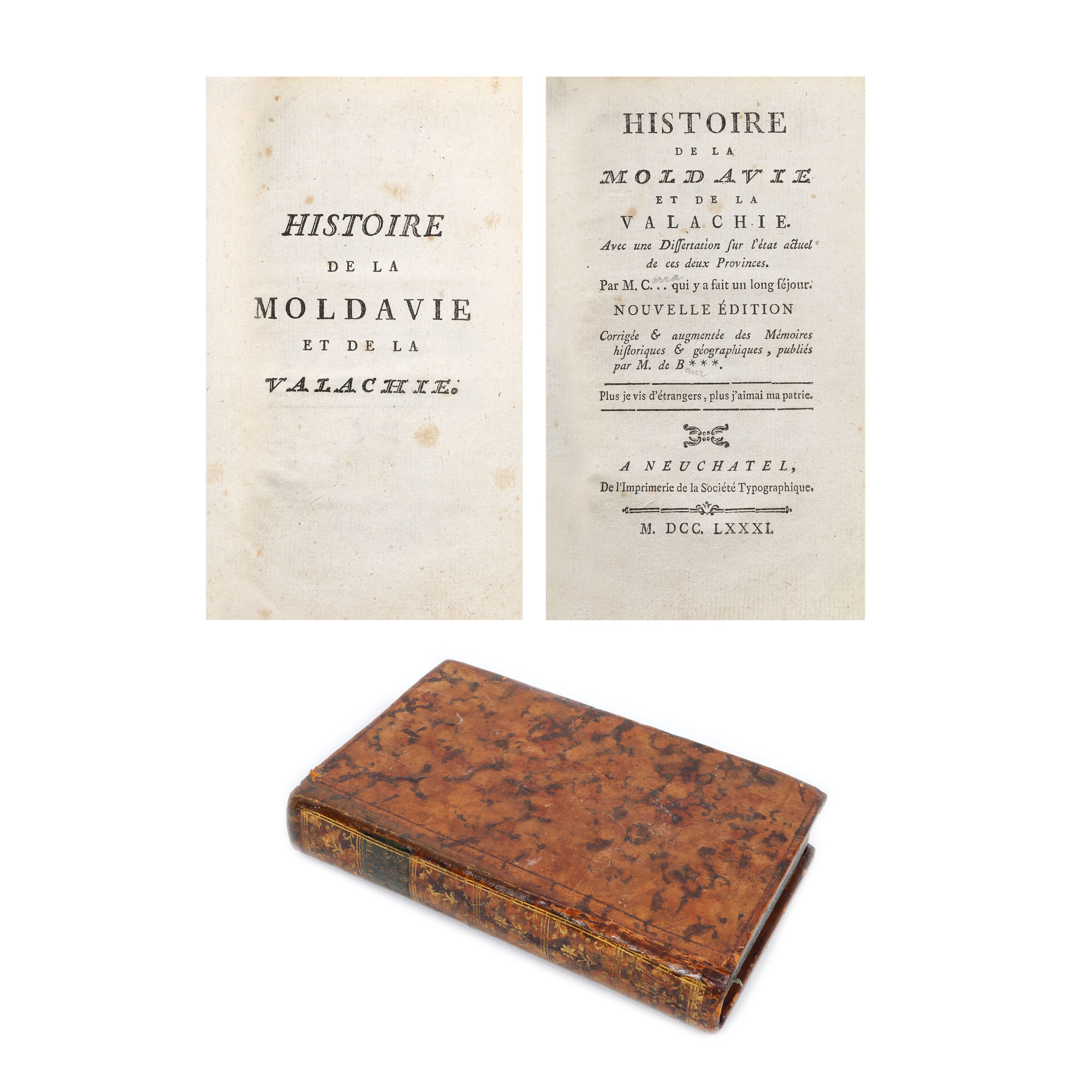 Din punct de vedere documentar, această operă cuprinde descrierea geografică a celor două provincii românești, o istorie a familiilor domnitoare (Cantemir, Ghika, Brâncoveanu etc.), statistici demografice, date despre comerț, justiție și armată, descrierea culturilor, plantelor și animalelor etc.. Ediție nouă, format in 8º, publicată la Neuchâtel în anul 1781, apartinând lui Jean-Luis Carra si publicată de Friedrich Wilhelm von Bauer, cu 371 de pagini numerotate, oglinda textului de 11 x 6 cm și 27 de rânduri în plină pagină. Legătura originală din piele maron lipită pe carton, cotorul decorat cu elemente florale și titlul ”Histoire de la Molda”. Stare de conservare foarte bună, cu o însemnare olografă pe prima filă din 1837.