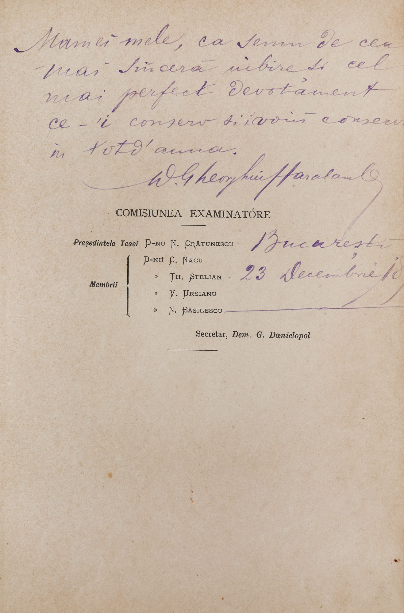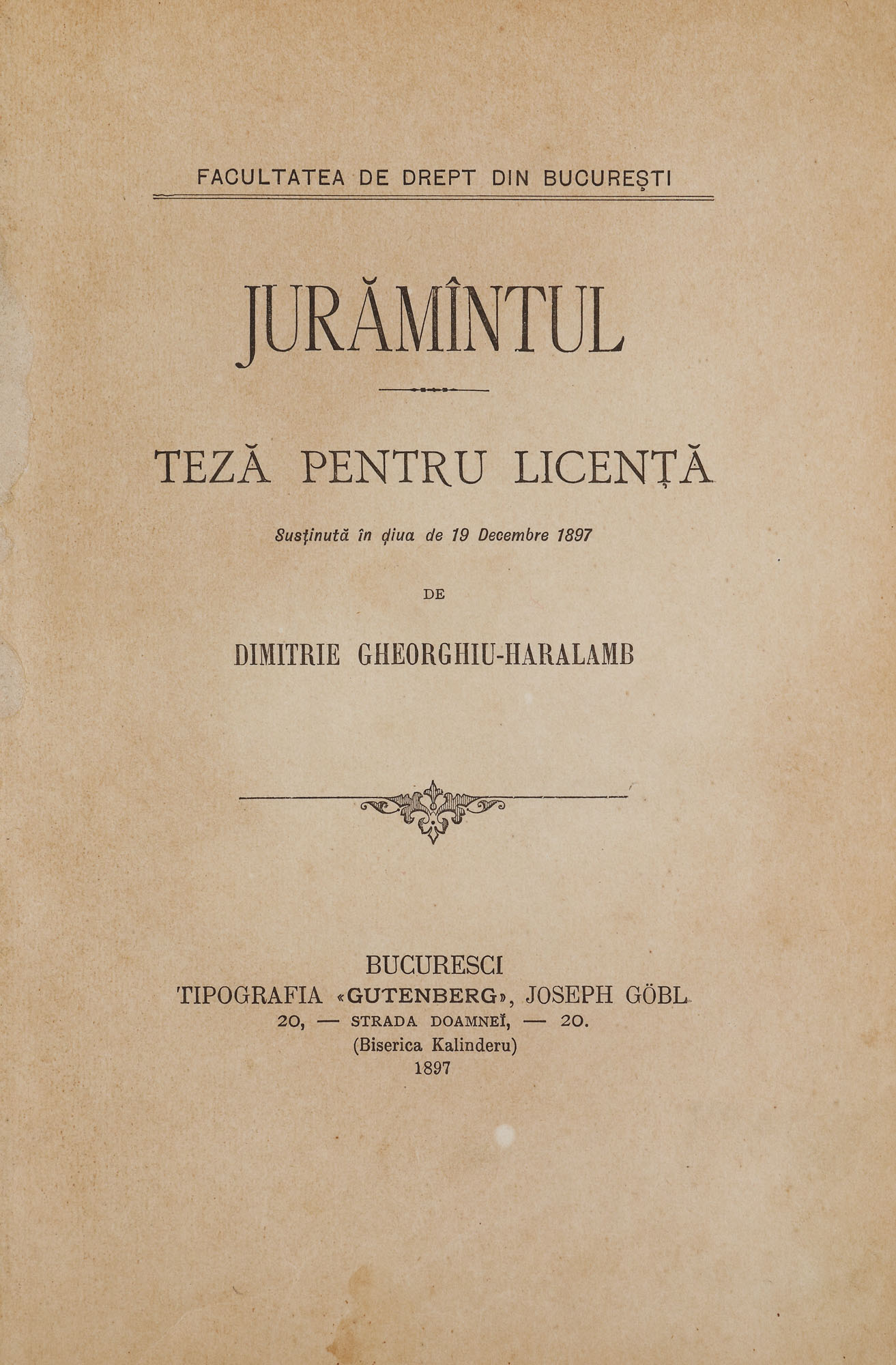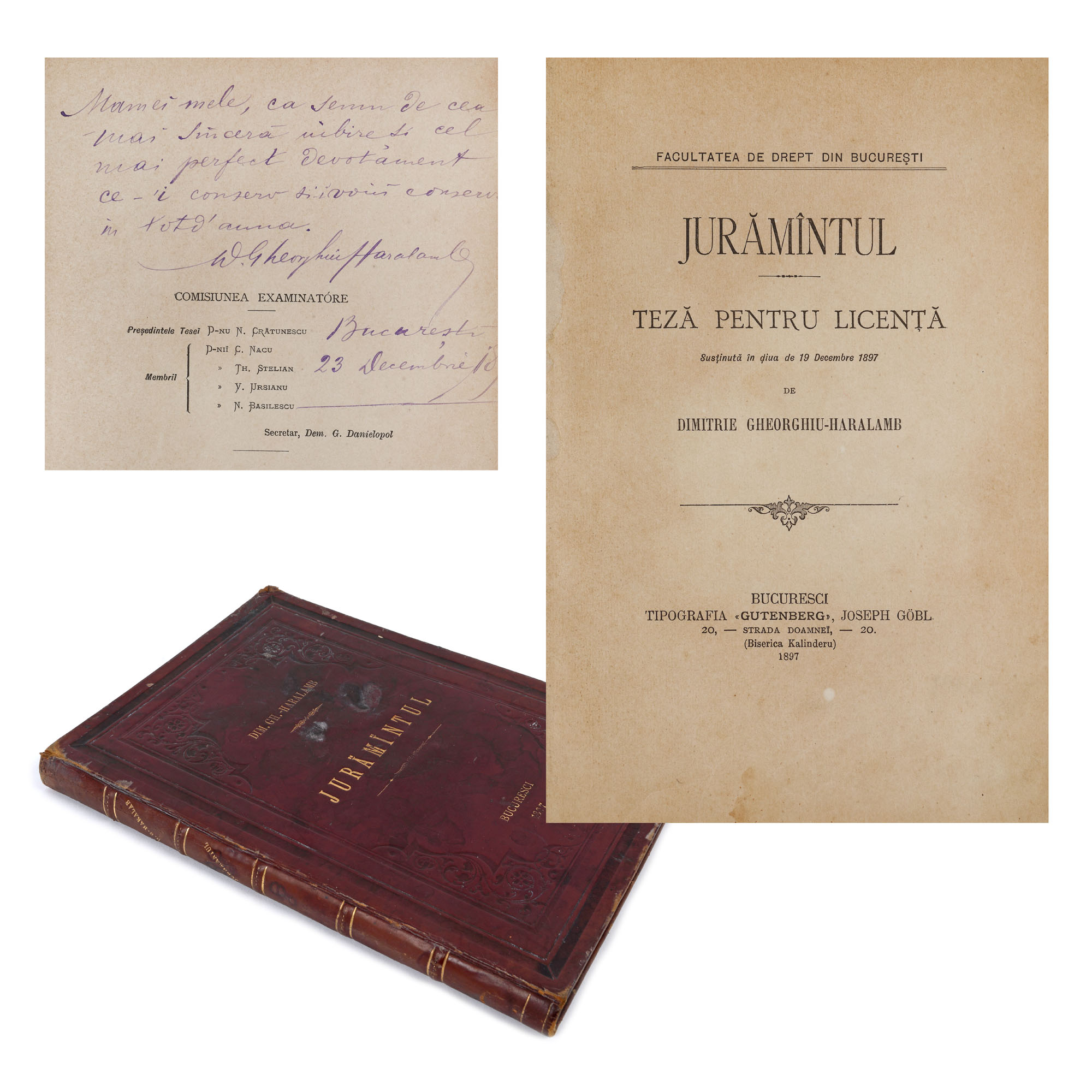 118. ”Jurământul - Teză pentru licență”, de Dimitrie Gheorghiu-Haralamb, București, 1897, cu dedicația olografă a autorului