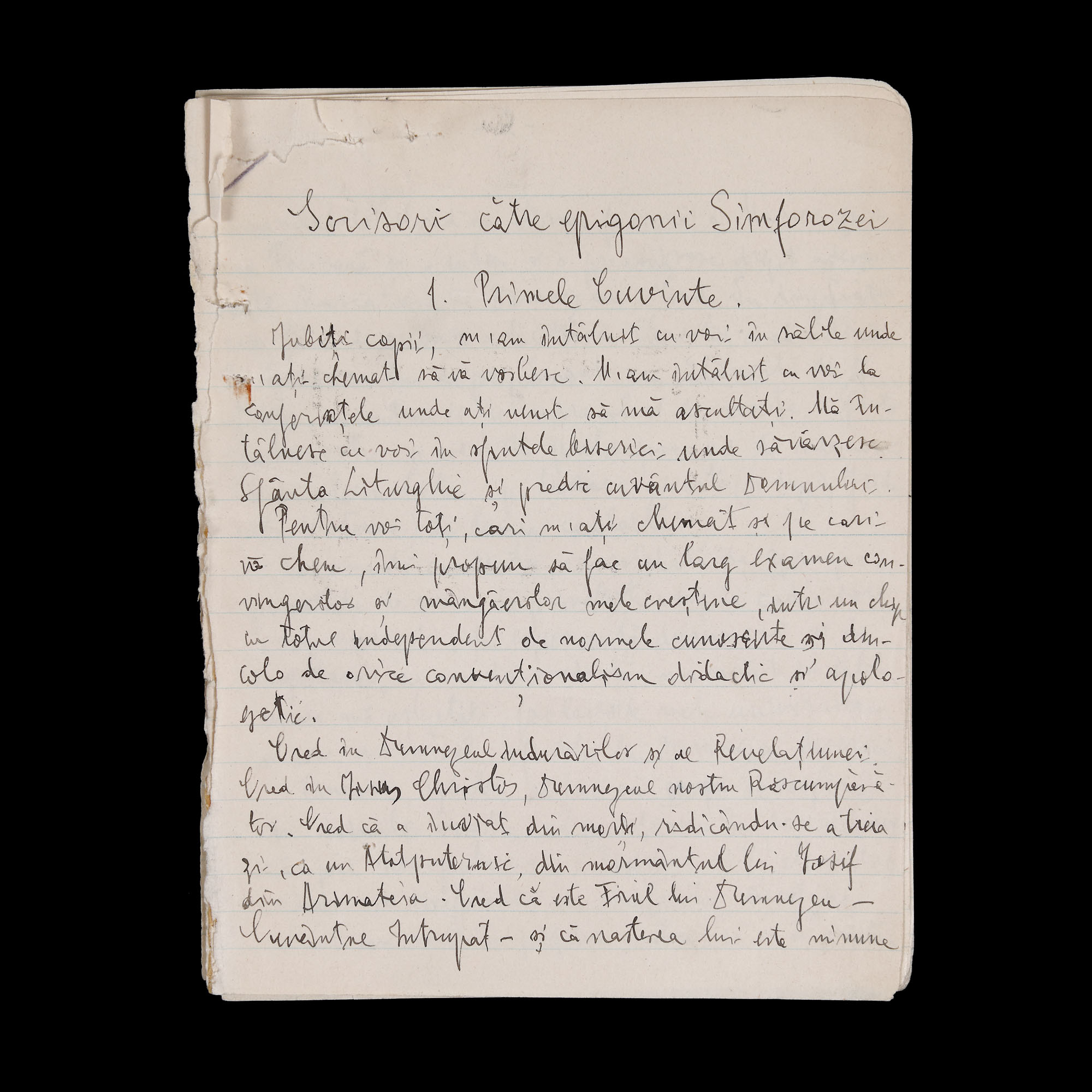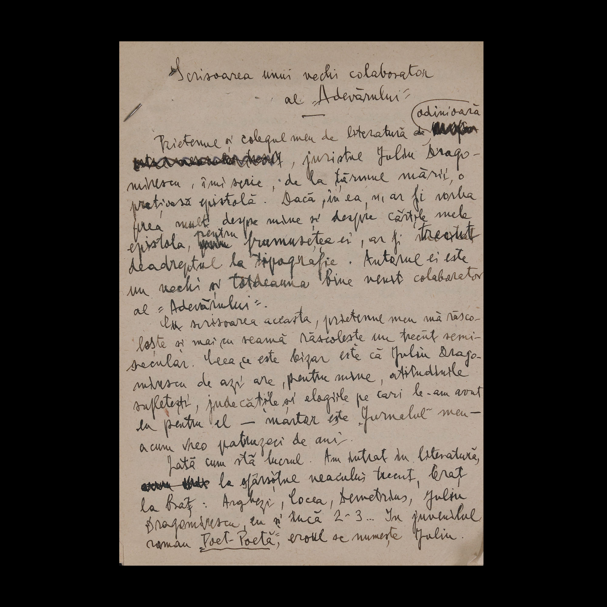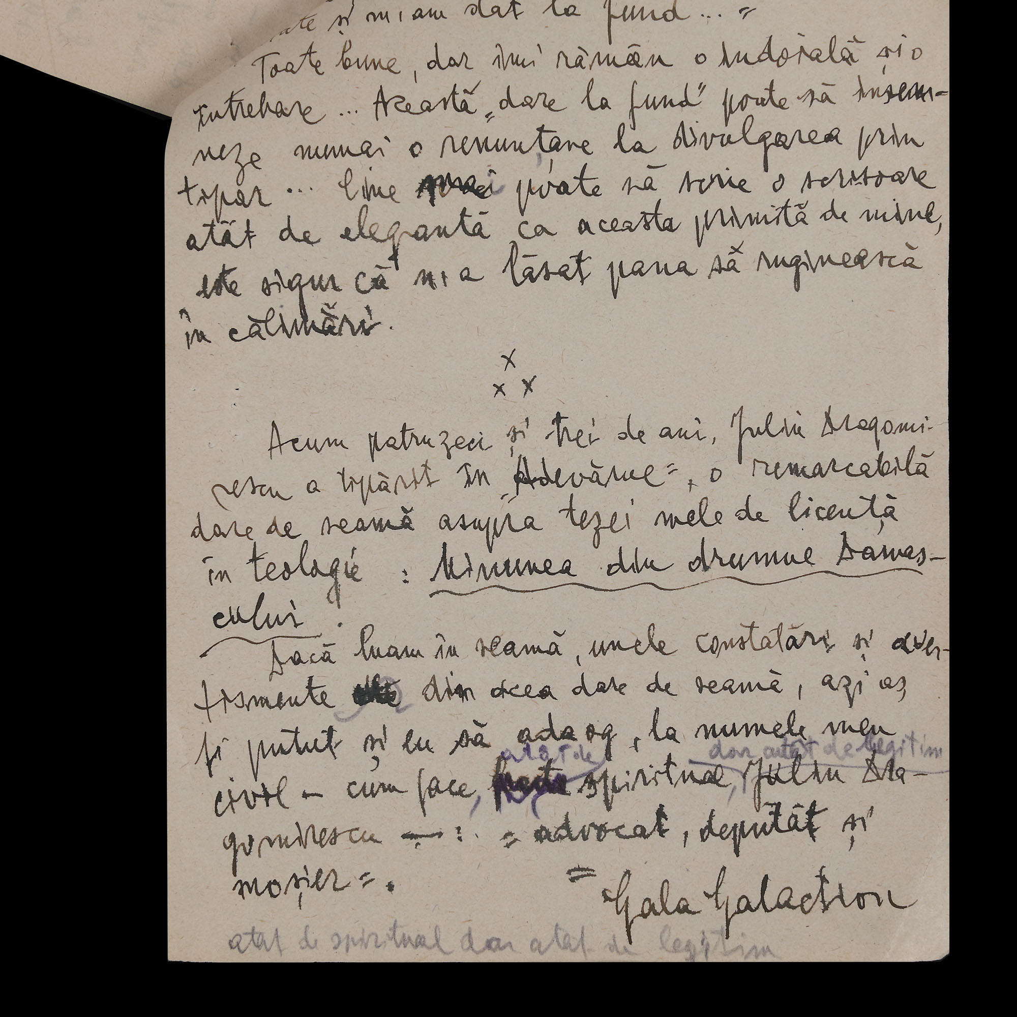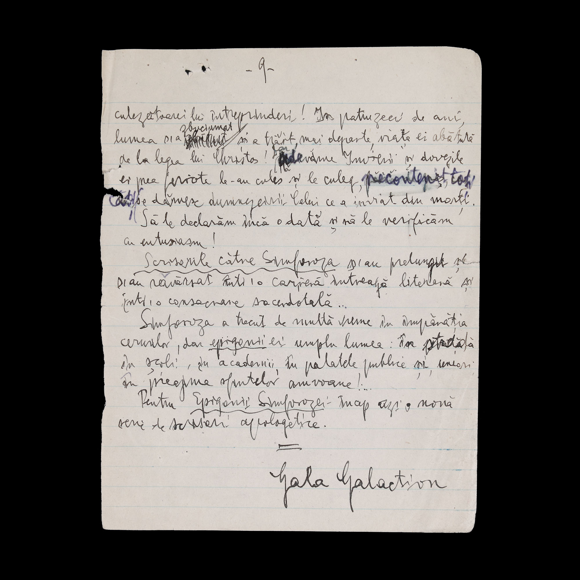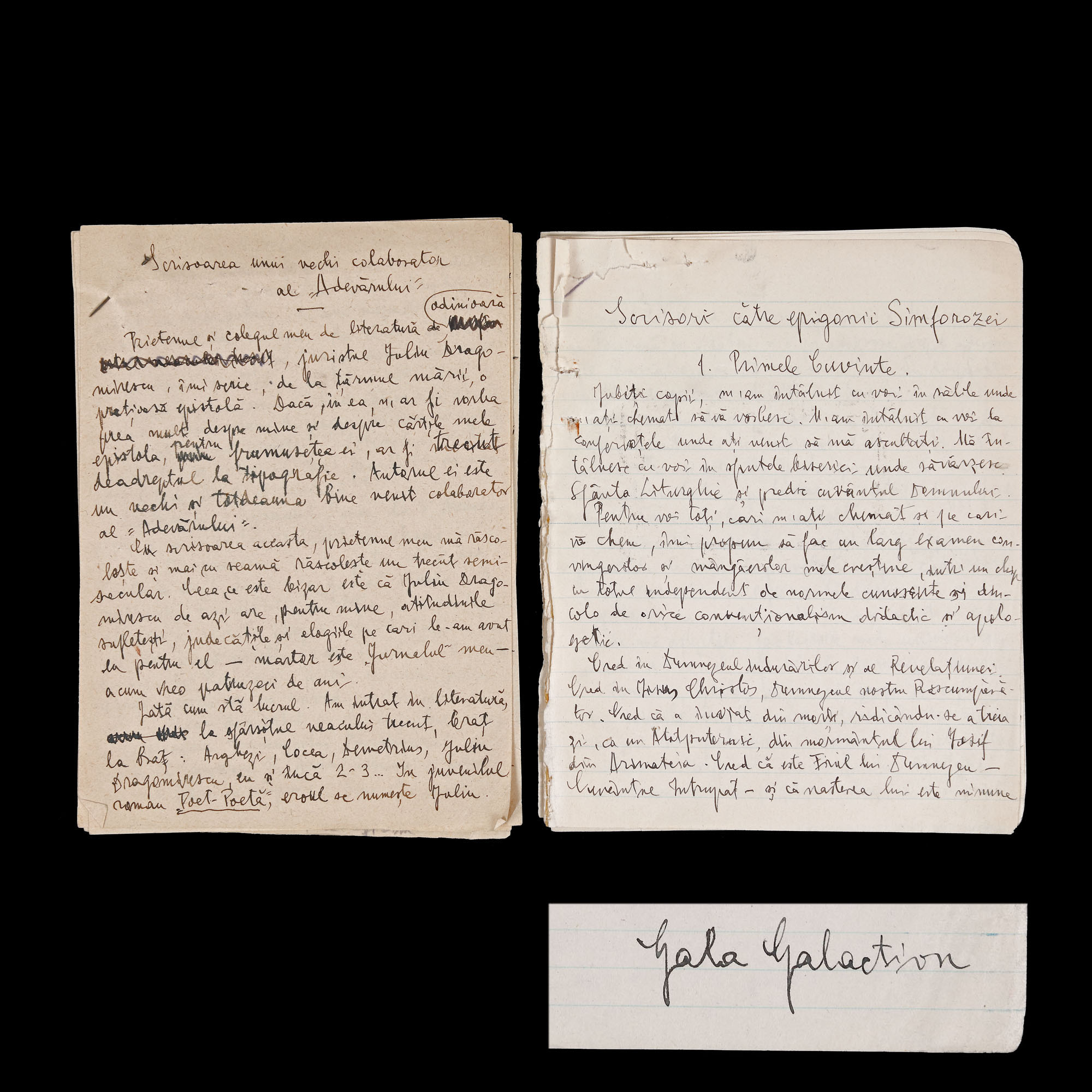 63. Lot format din două manuscrise ”Scrisori către epigonii Simforozei - Primele Cuvinte” și ”Scrisoarea unui vechi colaborator al Adevărului”, de Gala Galaction, cu semnătură olografă, provine din colecția istorică Șerban Țuculescu-Maria Galaction (14 file)