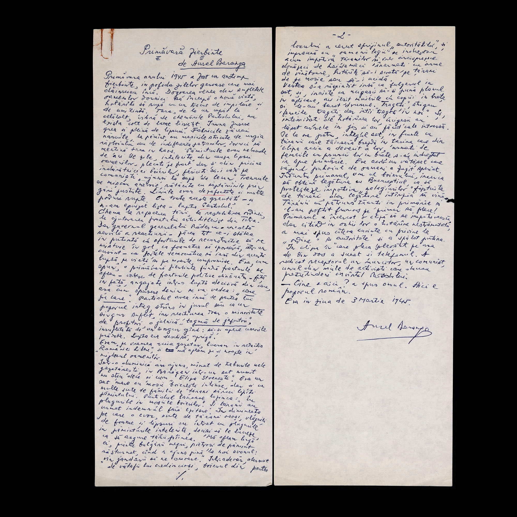 57. Manuscrisul ”Primăvară fierbinte”, de Aurel Baranga, cca. 1945, provine din colecția poetului avangardist Sașa Pană (2 file)