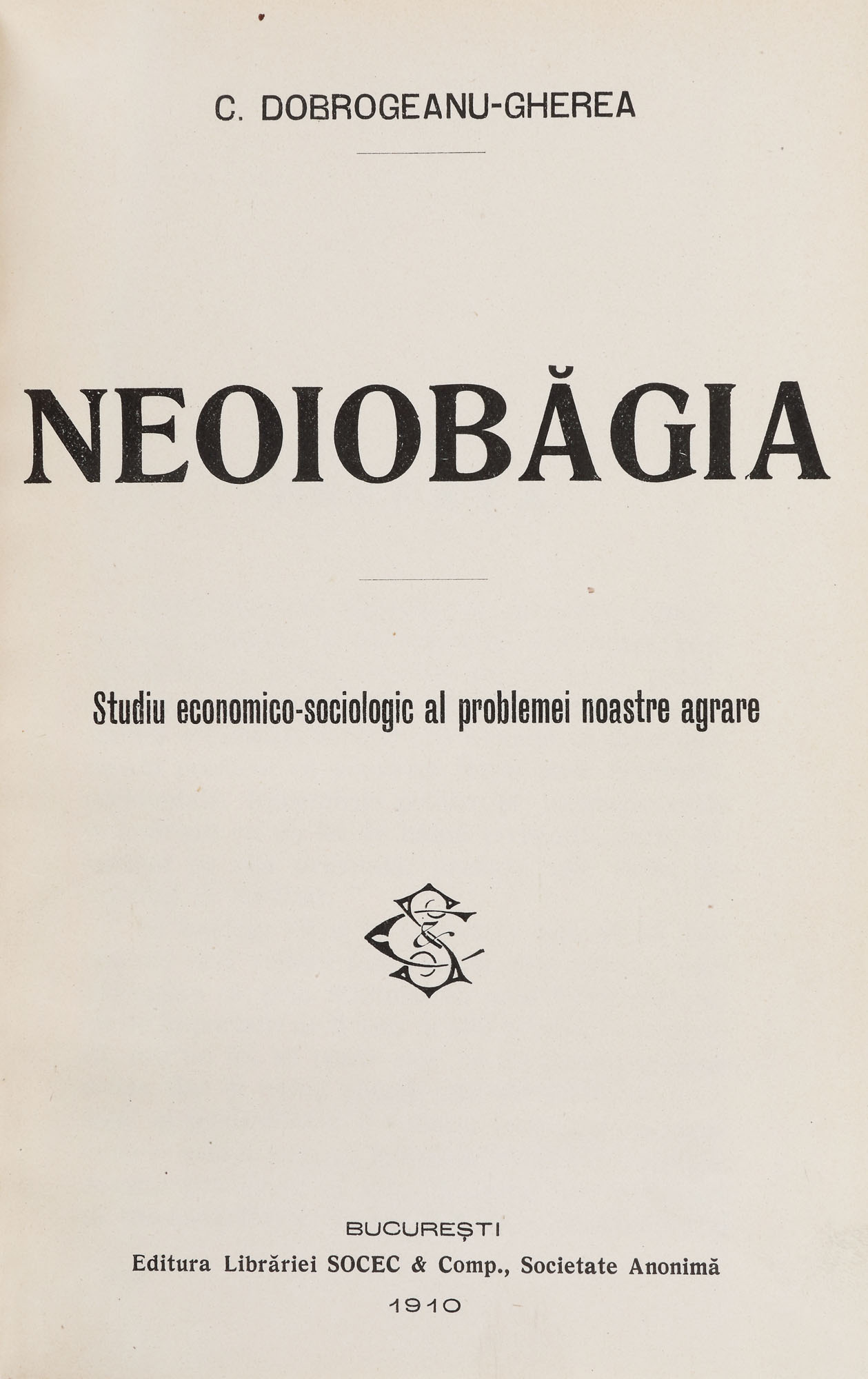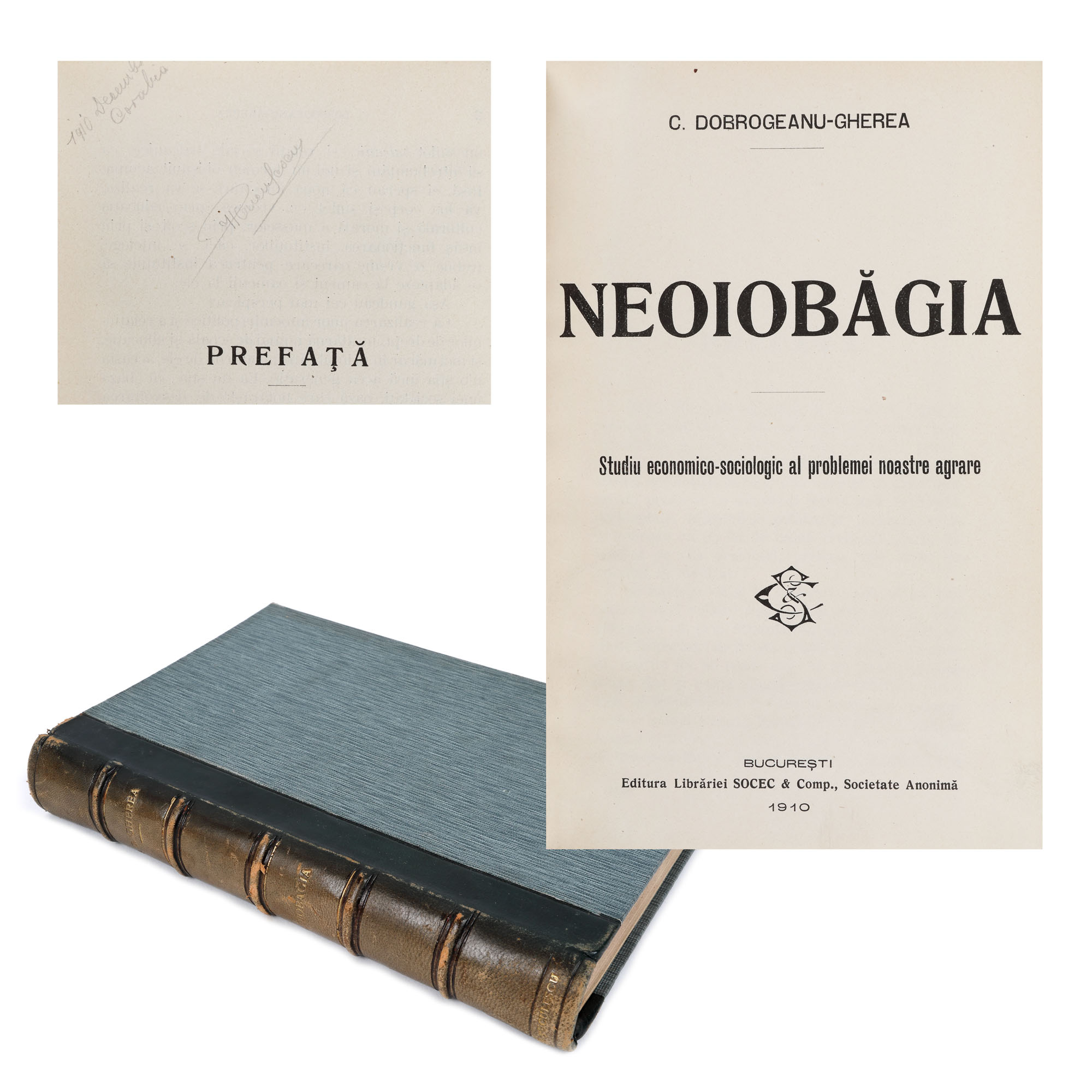 68. ”Neoiobăgia”, de Constantin Dobrogeanu Gherea, București, 1910, cu ex-libris Ion P. Țuculescu, provine din colecția istorică Șerban Țuculescu-Maria Galaction