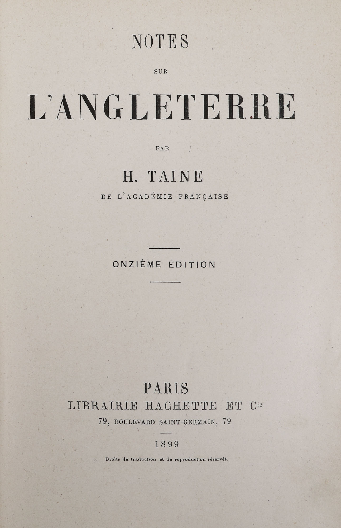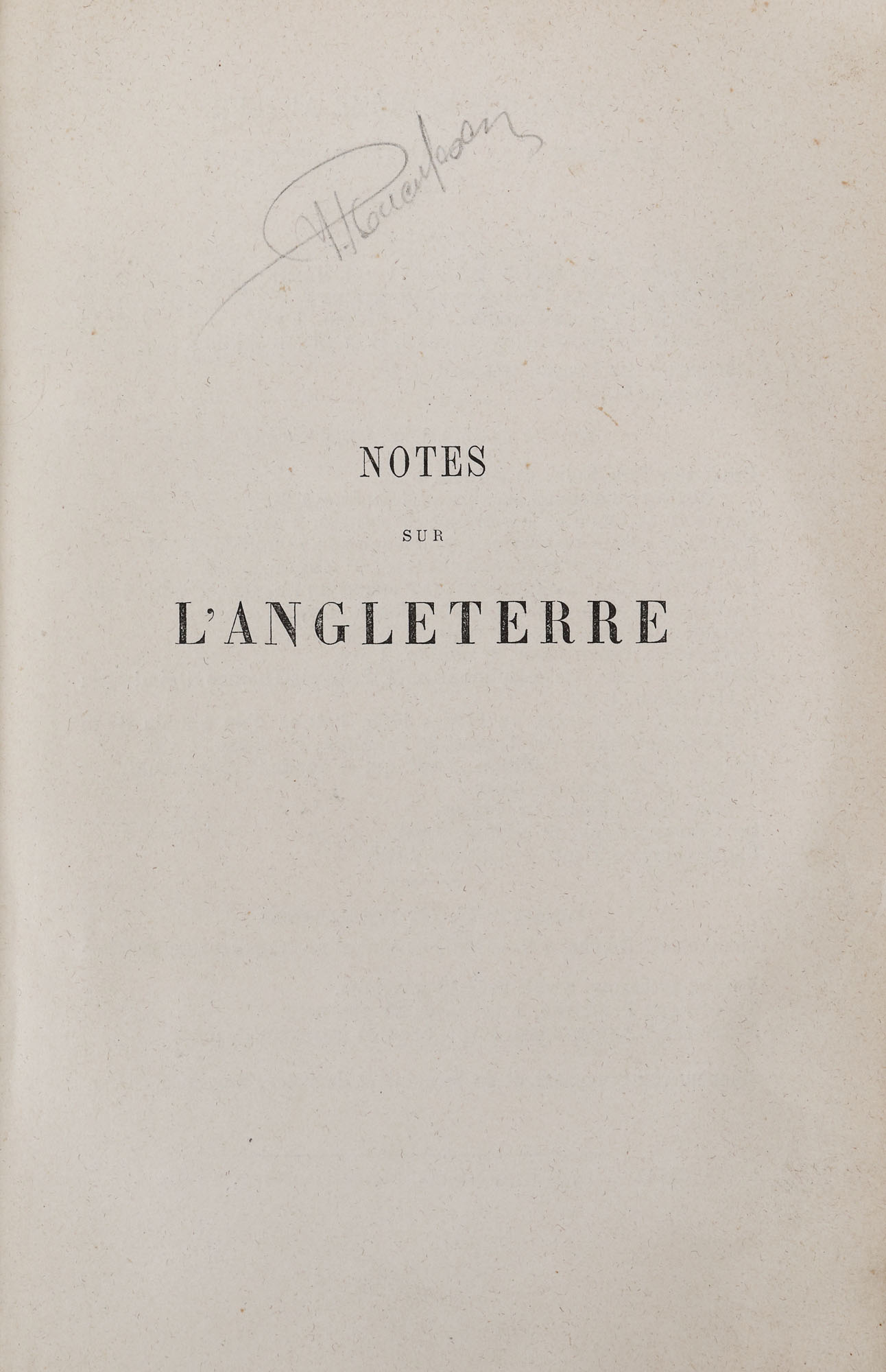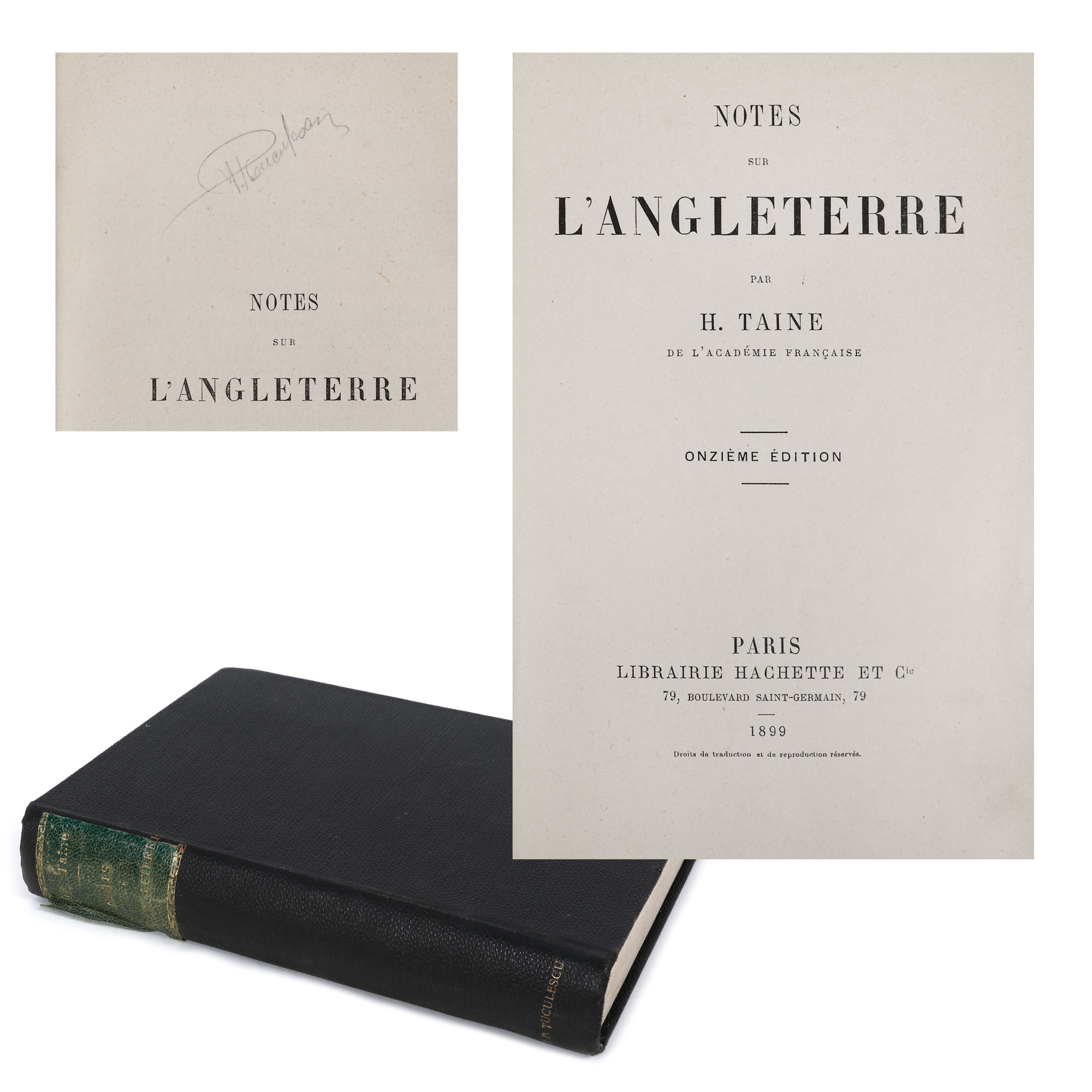 142. ”Notes sur l'Angleterre”, de Hippolyte Taine, franceză, Paris, 1899, cu ex-libris Ion P. Țuculescu, provine din colecția istorică Șerban Țuculescu-Maria Galaction