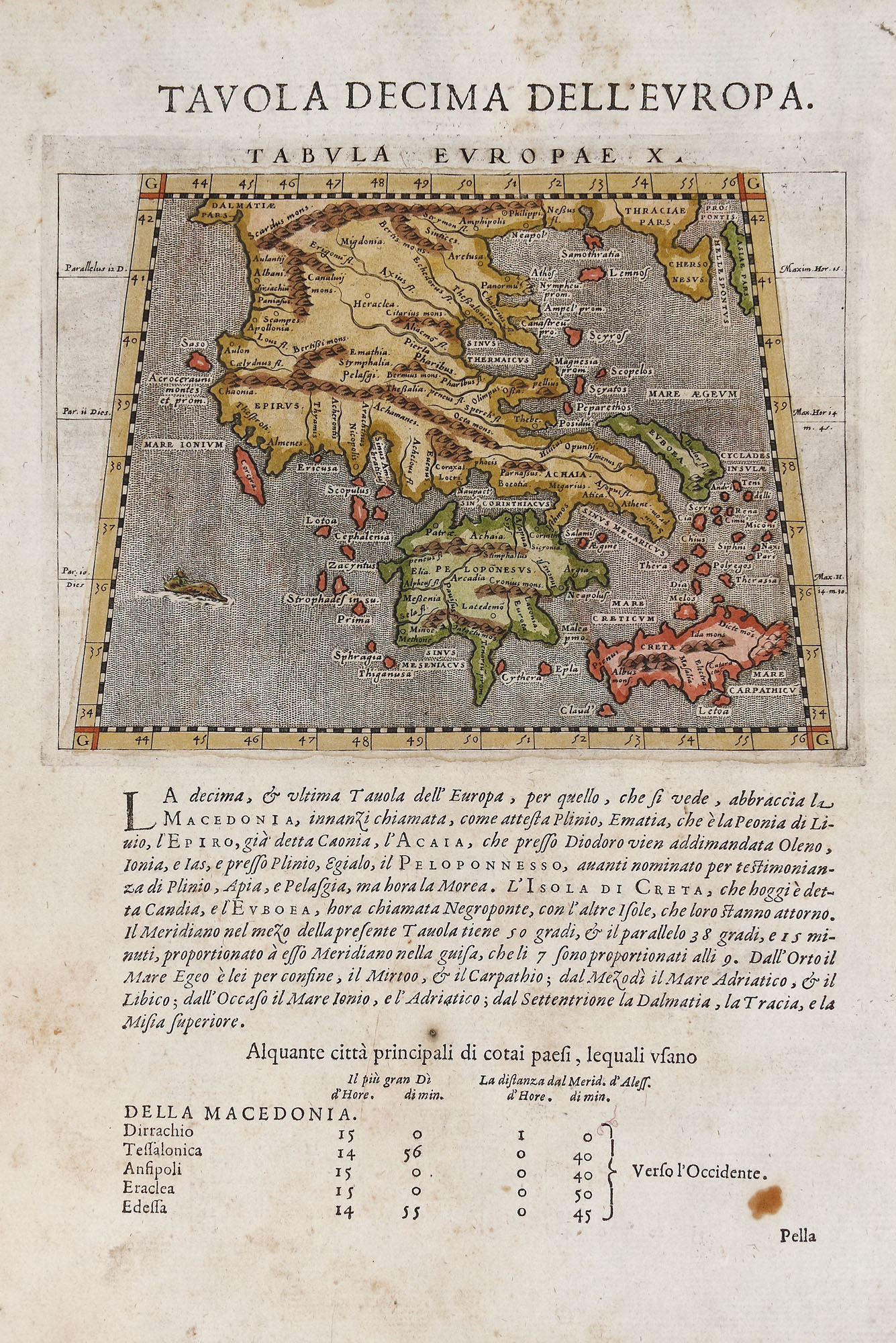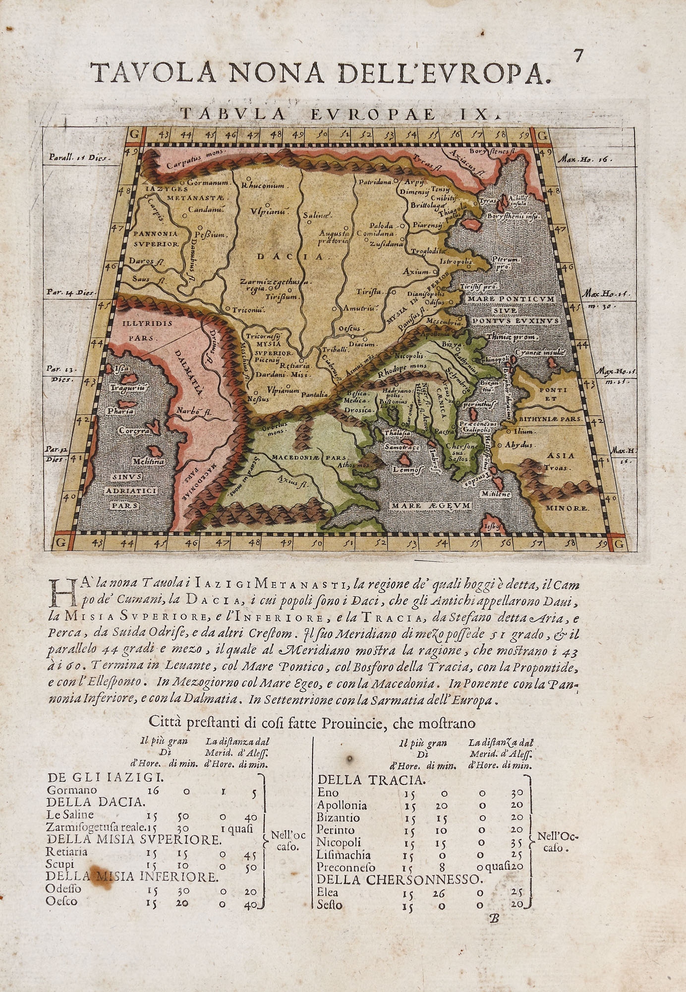 133. Pagina din cartea ”Tabula nona dell'Europa”, pe fața harta Dacia, pe verso harta Macedonia, de Giovanni Antonio Magini, Veneția, cca. 1596