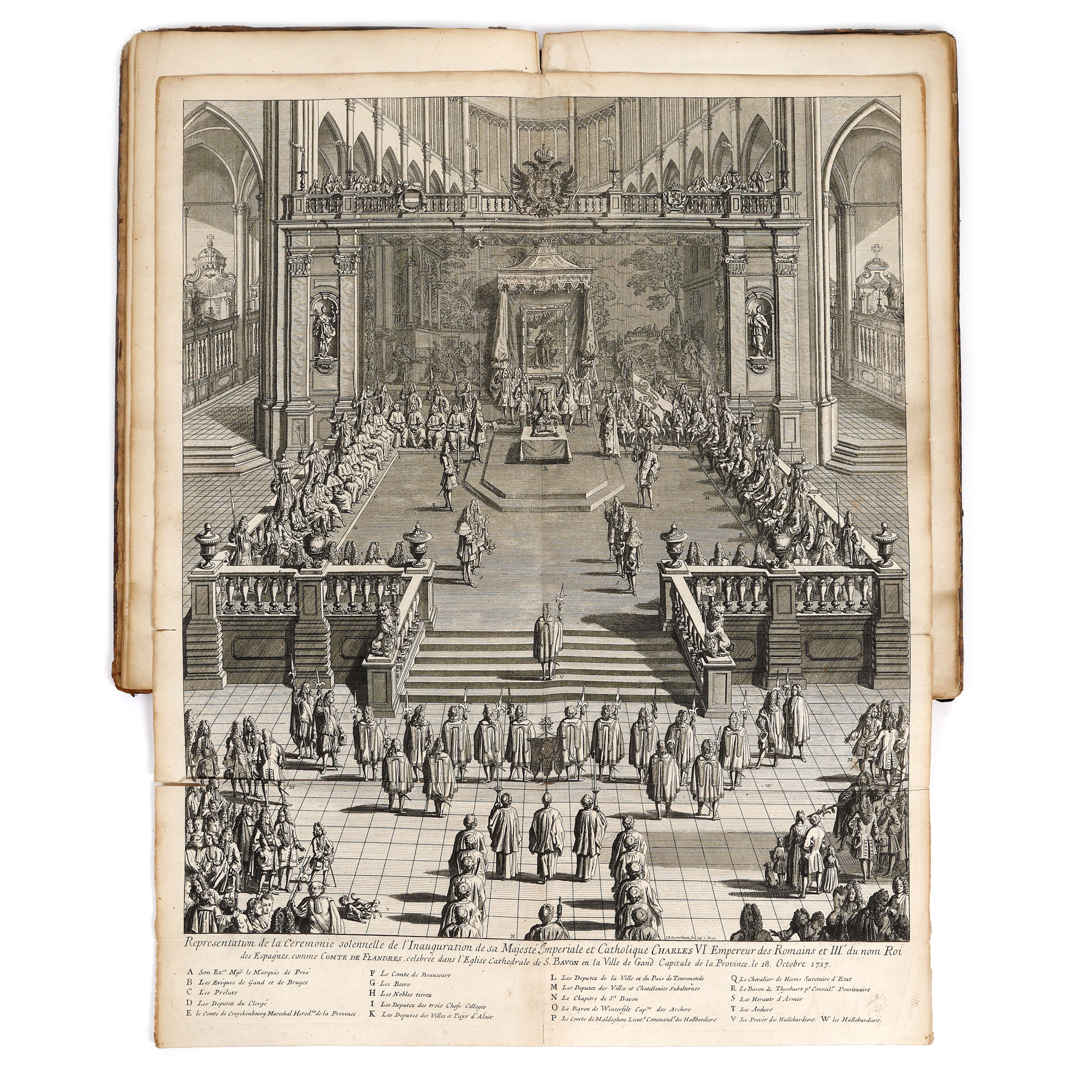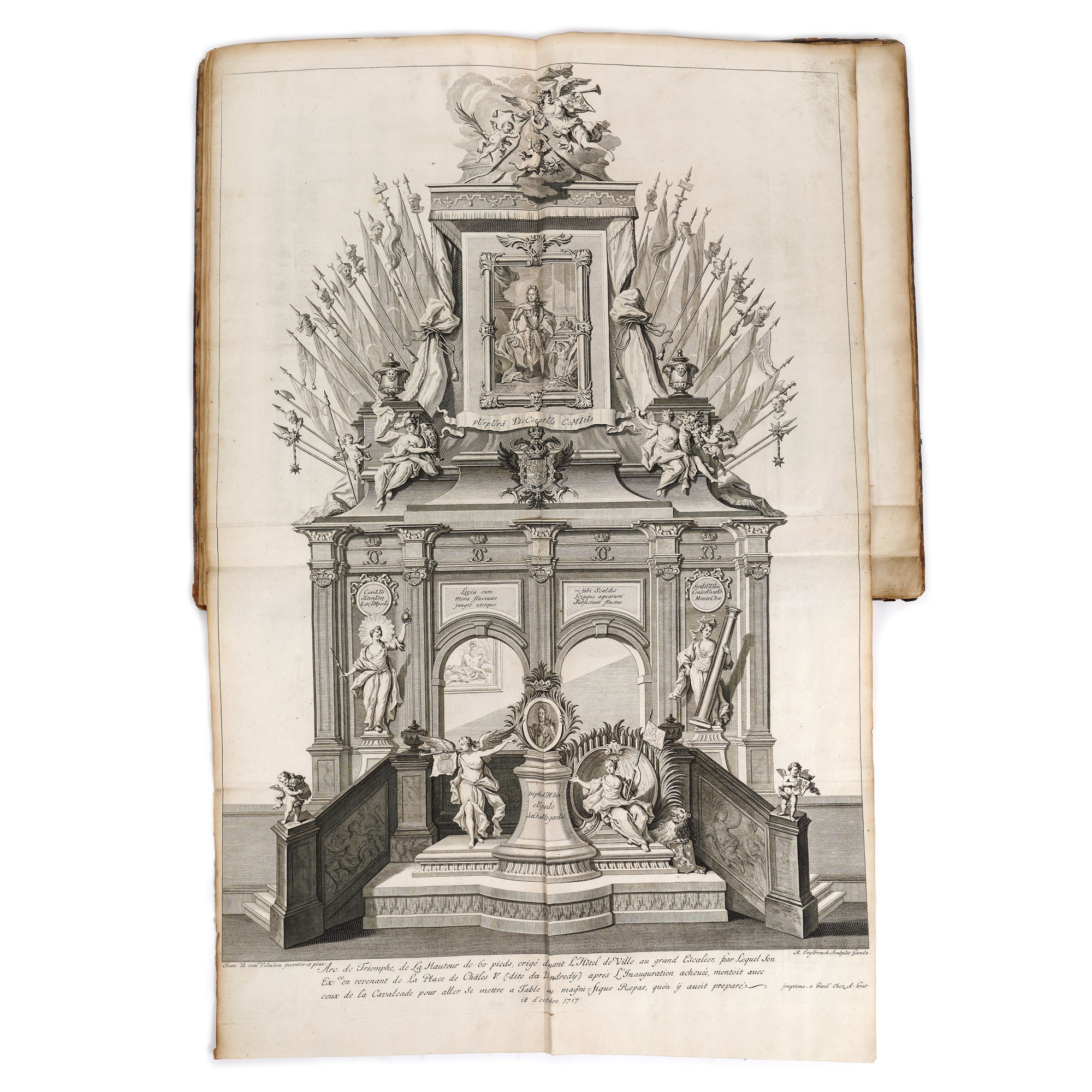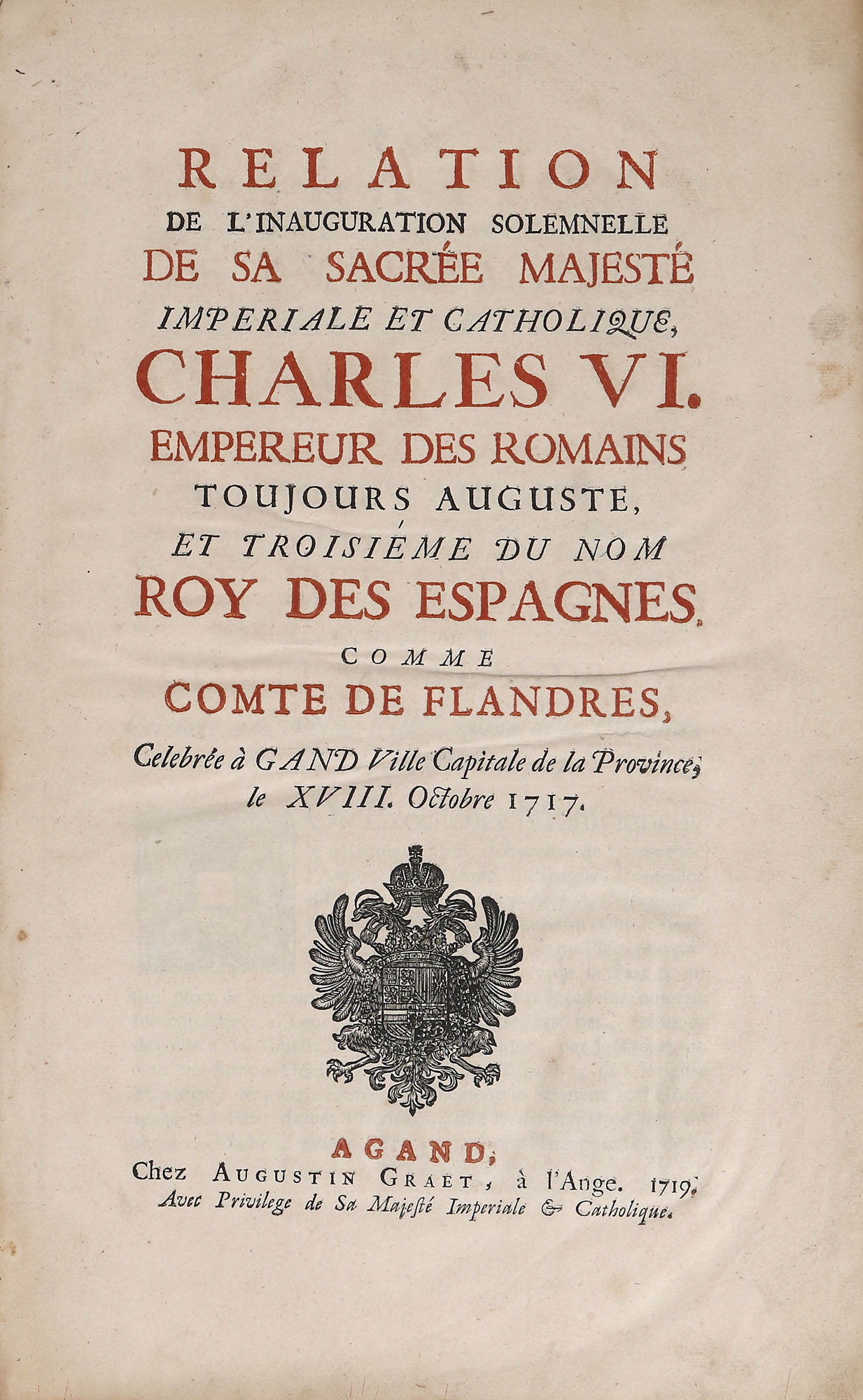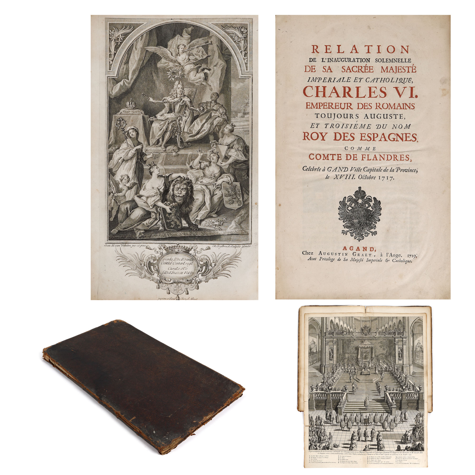 Lucrare tipărită la Gand în editura lui Augustin Graet la Anje în anul 1719. Format in folio cu 32 de pagini, hârtie cu filigran, cu 40 de randuri în plină pagină, caractere tipărite cu cerneală roșie și neagră, numeroase elemente tipografice, inițiale, vignete finale, pagina de titlu decorată cu stema Imperială a Austriei, gravura de la începutul cărții reprezintă un tablou votiv dedicat Împăratului Carol al VI-lea, realizată de Ioan B. van Volxsom și gravată de M. Beylbrouck. Valoarea bibliofilă a cărții este sporită de un ex-libris ethichetă, de apartenență probabil a primului deținator al carți în sec. XVIII (M. le Bon G. de Joigny). Textul editorului Augustin Graet oferă o relatare meticuloasă de zi cu zi a festivităților, inclusiv plecarea cavalcadei de la Bruxelles pe 16 octombrie și sosirea ei la Abația Mont Blandin din Gent, programul muzical al Liturghiei de la St. Bavo, și mai ales splendoarea opulentă a inaugurării din după-amiaza zilei de 18 la Marché du Vendredi (Vrijdagmarkt, cea mai mare piață publică din Gent), pentru care o scenă enormă fusese proiectată special de arhitectul Jacob Colin. Gravura de inaugurare – lată de aproape un metru întreg – este semnată de Colin, C.Eykens și gravorul J.B. Berterham, care a executat și gravura interiorului Catedralei. O a treia placă înfățișează un arc de triumf destul de înspăimântător, care sărbătorește expansiunea Imperiului Austriac cu știuci care poartă capetele tăiate ale generalilor turci. Deși Carol al VI-lea a aderat ca Conte de Flandra în 1713, transferul prelungit al provinciei de la Habsburgii spanioli la Habsburgii austrieci a întârziat festivitățile până în 1717, moment în care nu a fost scutită nicio cheltuială pentru a sărbători inaugurarea. Cartea de sărbătoare a lui Graet îl proclamă chiar pe Charles „Roy des Espanges”, deși acel titlu fusese deja câștigat în Războiul de Succesiune Spaniolă de către Filip al V-lea.