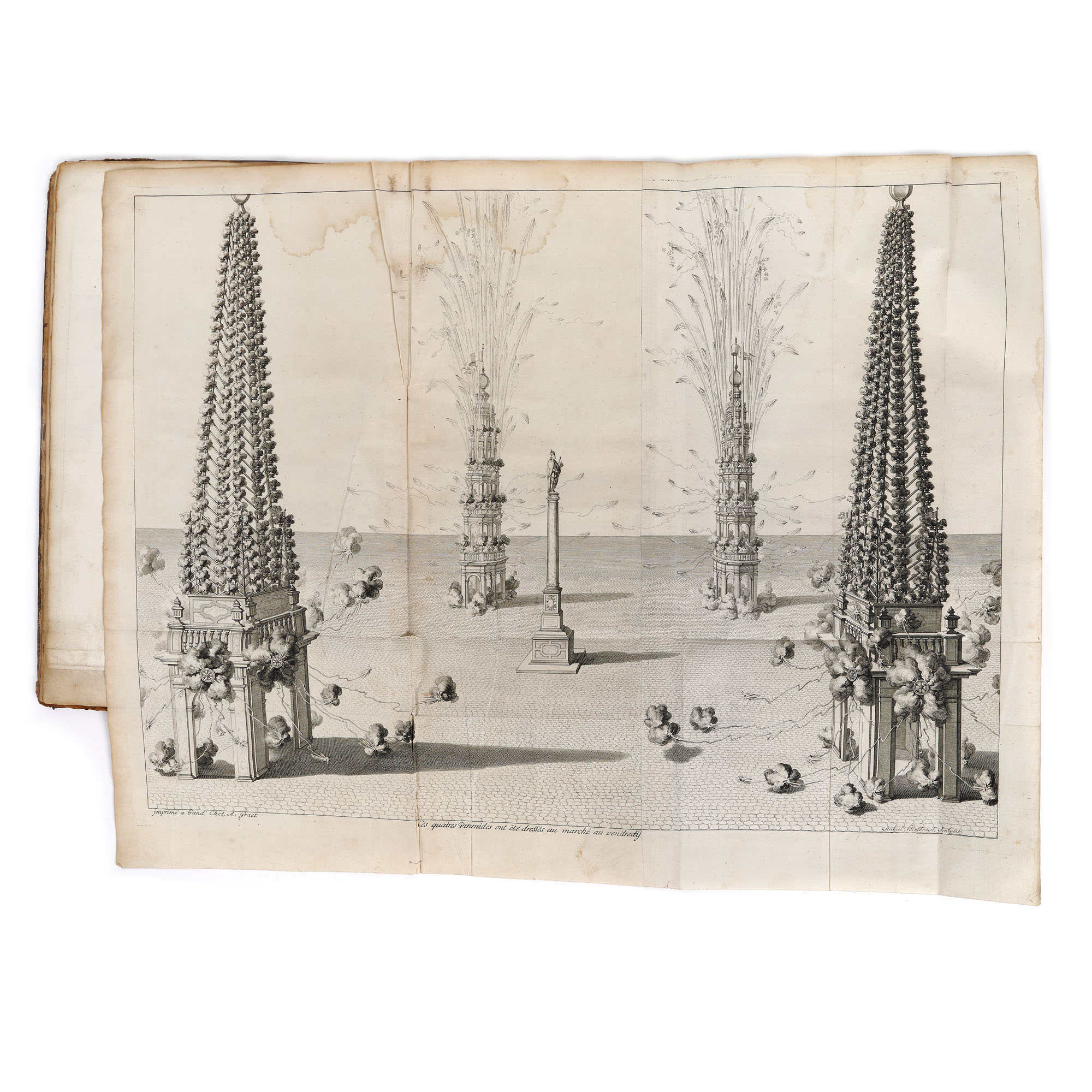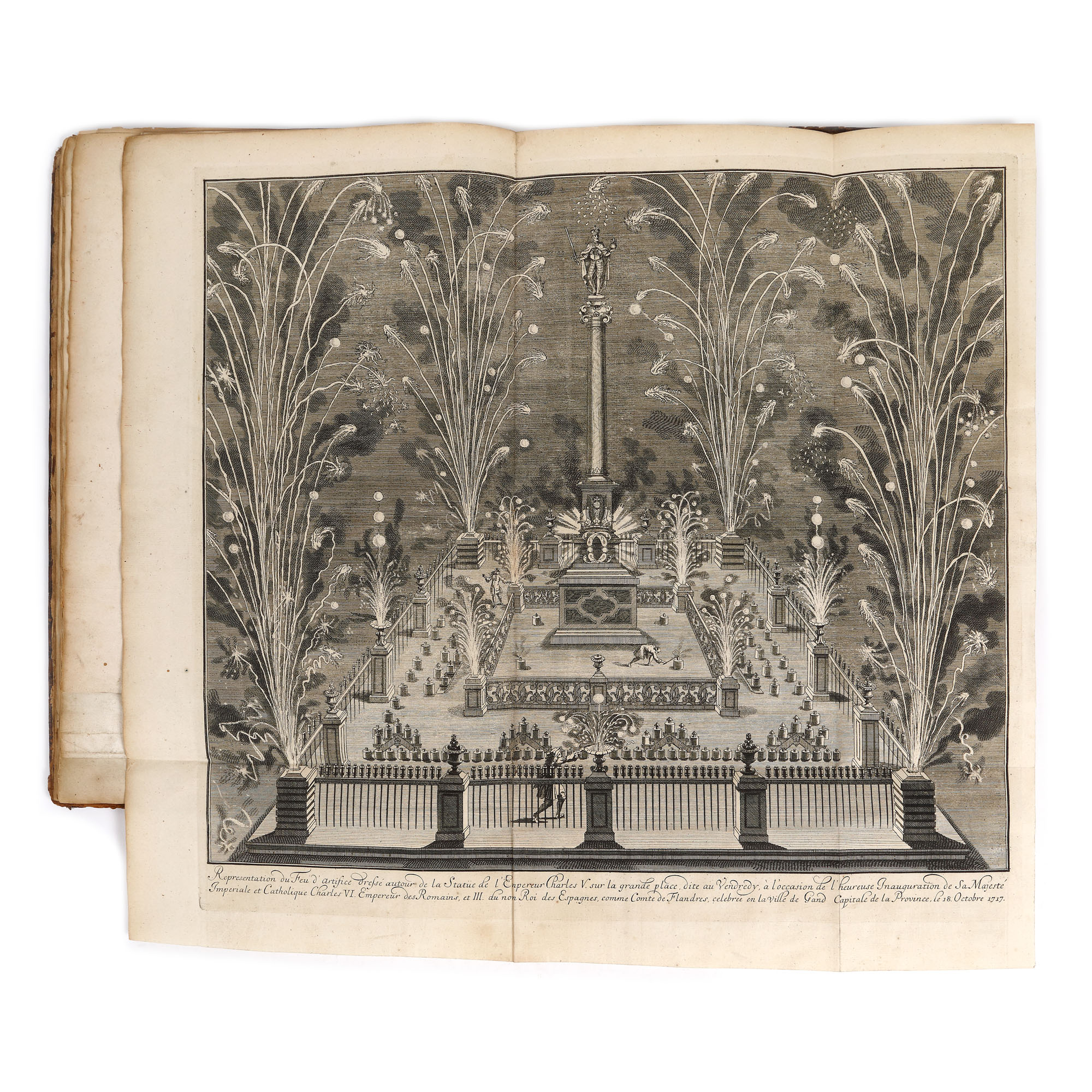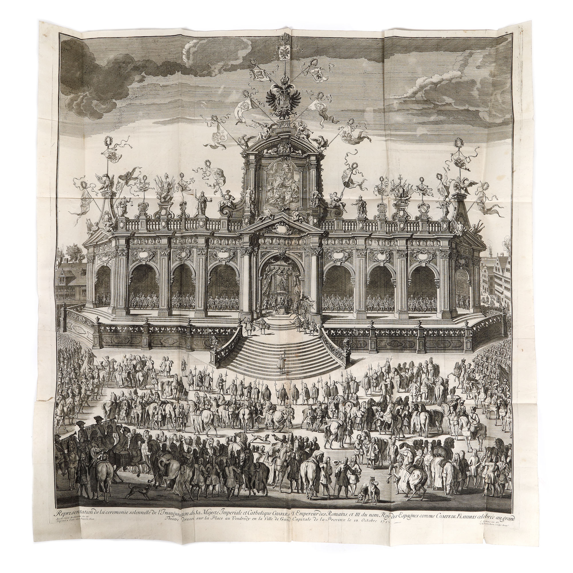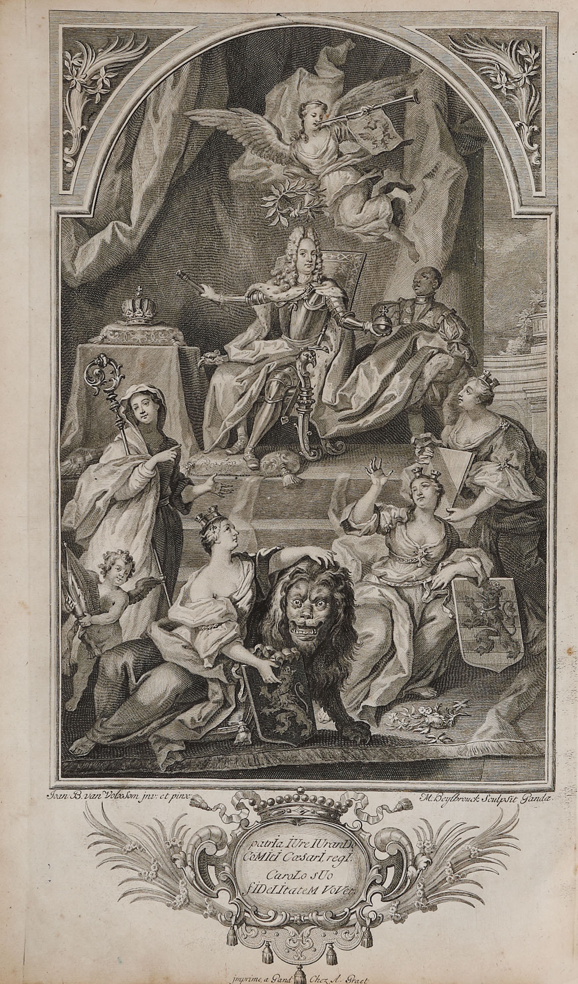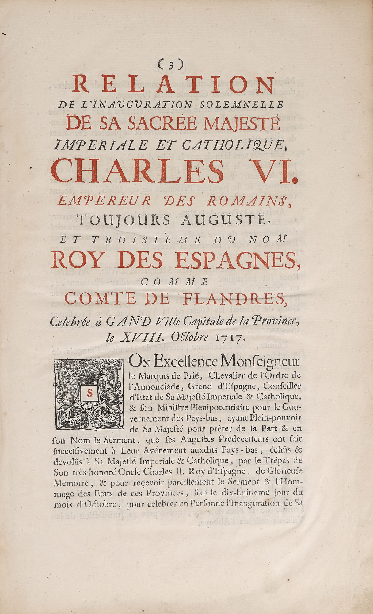 Lucrare tipărită la Gand în editura lui Augustin Graet la Anje în anul 1719. Format in folio cu 32 de pagini, hârtie cu filigran, cu 40 de randuri în plină pagină, caractere tipărite cu cerneală roșie și neagră, numeroase elemente tipografice, inițiale, vignete finale, pagina de titlu decorată cu stema Imperială a Austriei, gravura de la începutul cărții reprezintă un tablou votiv dedicat Împăratului Carol al VI-lea, realizată de Ioan B. van Volxsom și gravată de M. Beylbrouck. Valoarea bibliofilă a cărții este sporită de un ex-libris ethichetă, de apartenență probabil a primului deținator al carți în sec. XVIII (M. le Bon G. de Joigny). Textul editorului Augustin Graet oferă o relatare meticuloasă de zi cu zi a festivităților, inclusiv plecarea cavalcadei de la Bruxelles pe 16 octombrie și sosirea ei la Abația Mont Blandin din Gent, programul muzical al Liturghiei de la St. Bavo, și mai ales splendoarea opulentă a inaugurării din după-amiaza zilei de 18 la Marché du Vendredi (Vrijdagmarkt, cea mai mare piață publică din Gent), pentru care o scenă enormă fusese proiectată special de arhitectul Jacob Colin. Gravura de inaugurare – lată de aproape un metru întreg – este semnată de Colin, C.Eykens și gravorul J.B. Berterham, care a executat și gravura interiorului Catedralei. O a treia placă înfățișează un arc de triumf destul de înspăimântător, care sărbătorește expansiunea Imperiului Austriac cu știuci care poartă capetele tăiate ale generalilor turci. Deși Carol al VI-lea a aderat ca Conte de Flandra în 1713, transferul prelungit al provinciei de la Habsburgii spanioli la Habsburgii austrieci a întârziat festivitățile până în 1717, moment în care nu a fost scutită nicio cheltuială pentru a sărbători inaugurarea. Cartea de sărbătoare a lui Graet îl proclamă chiar pe Charles „Roy des Espanges”, deși acel titlu fusese deja câștigat în Războiul de Succesiune Spaniolă de către Filip al V-lea.