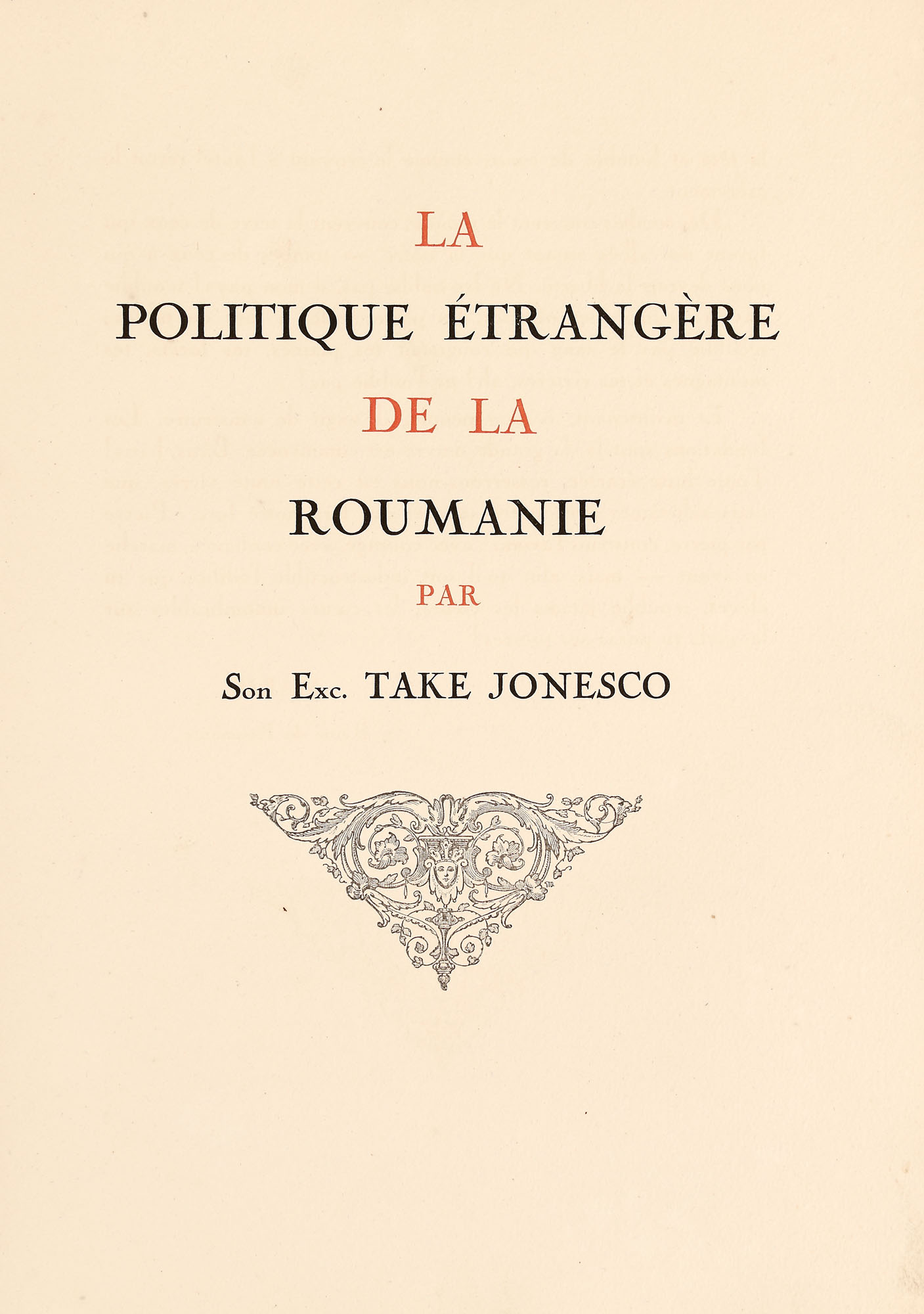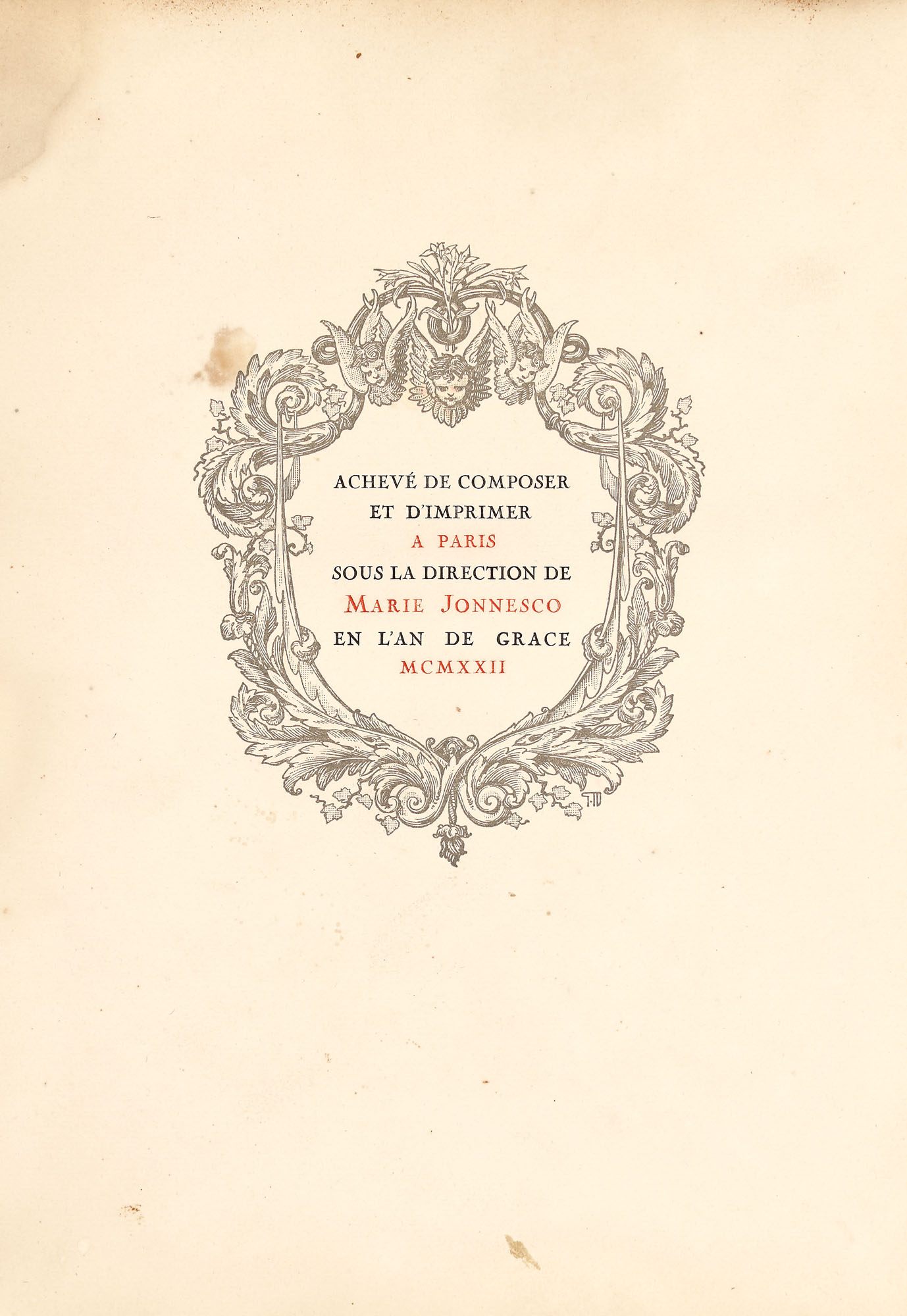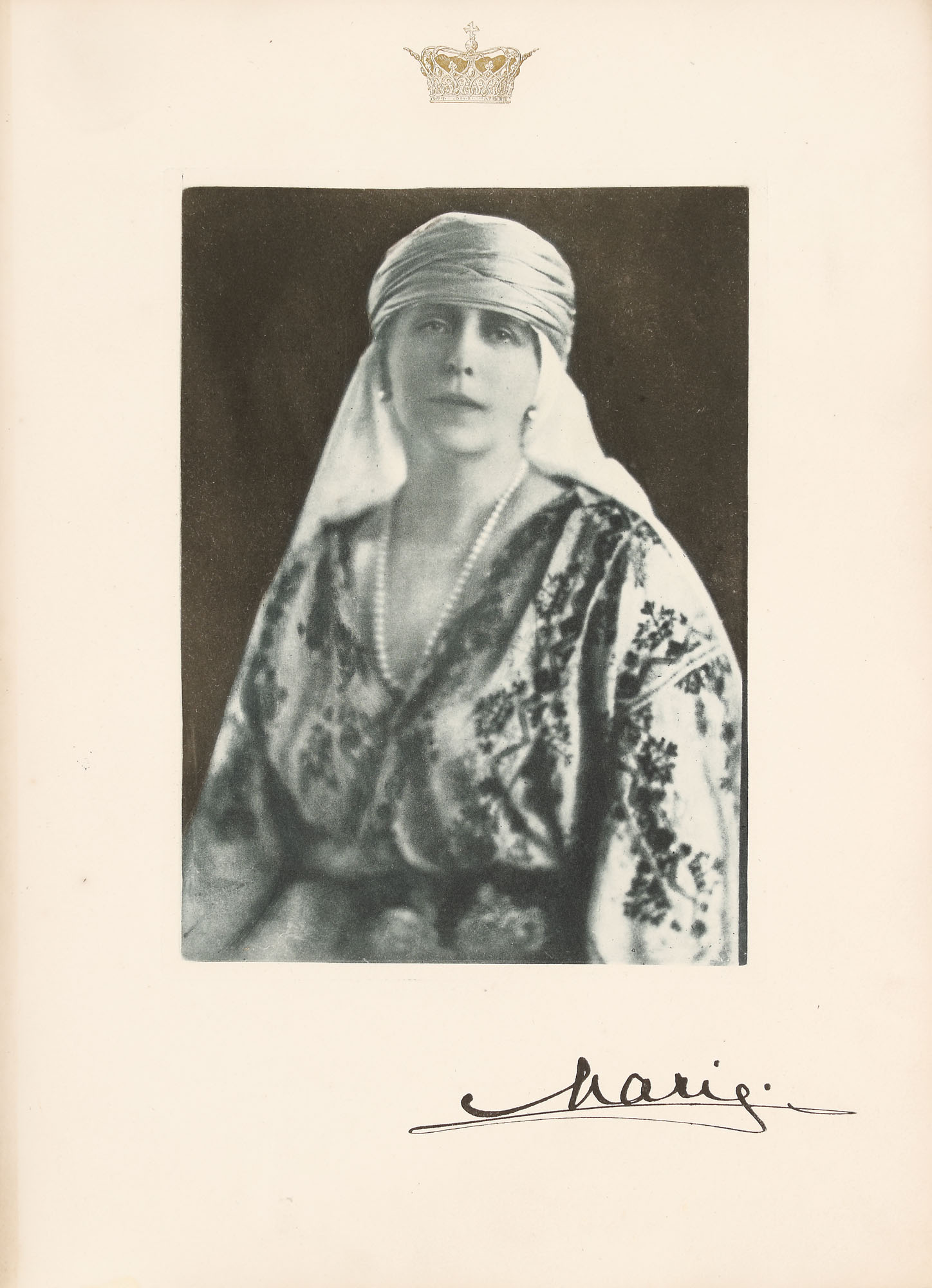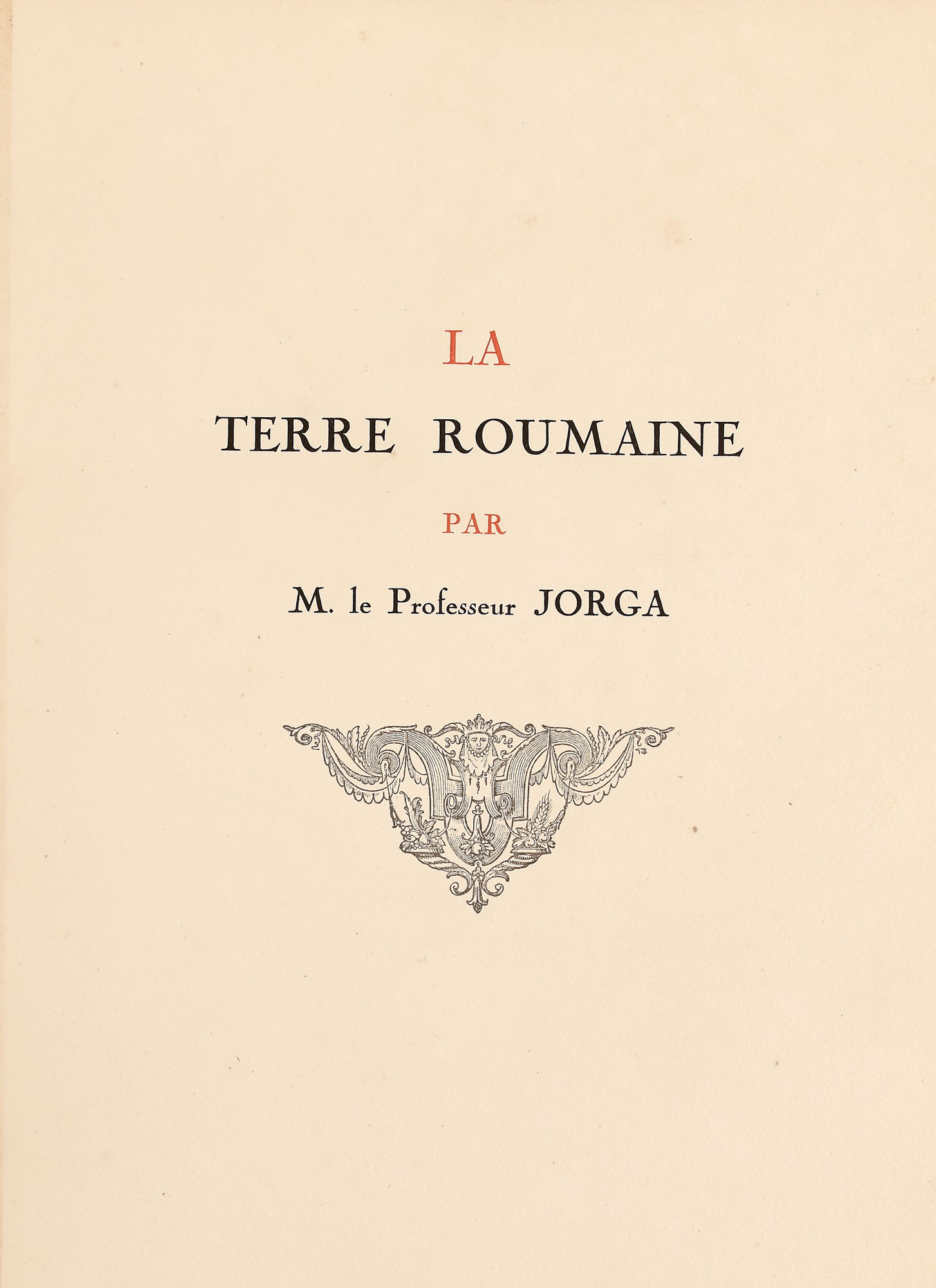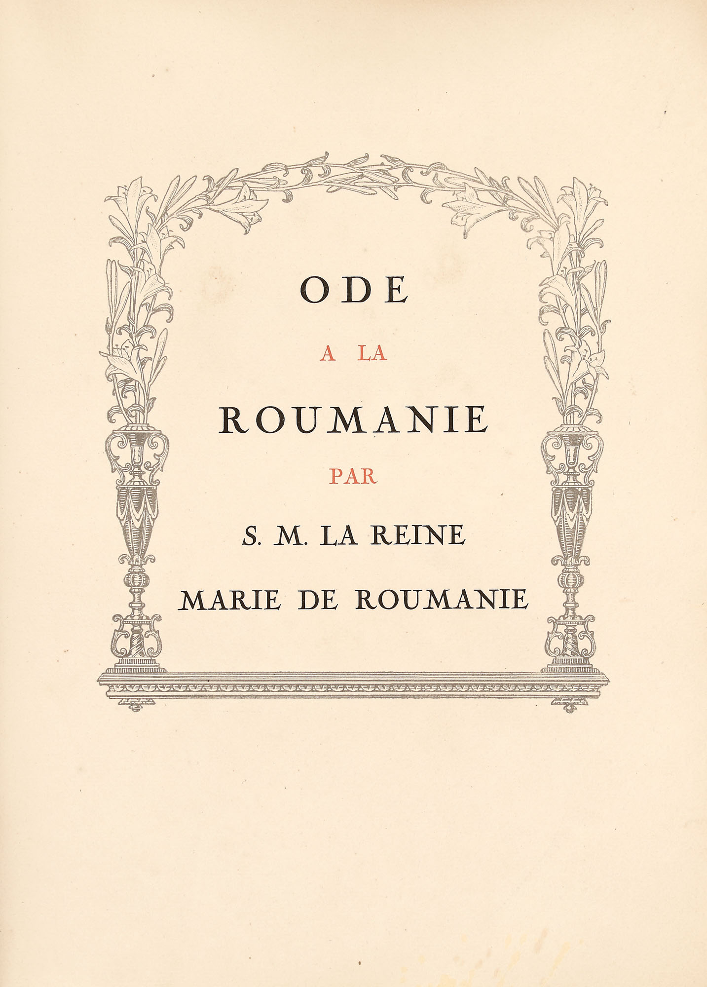 Legătură de perioadă, din piele de culoare maron, lipită pe carton. Coperta unu, în partea superioară întâlnim Stema cea mare a Regatului României cu cei doi lei tenanţi care susţin scutul surmontat de coroana de oţel a României, sub care a fost aplicată medalia Ordinului Carol I alături de deviza ţării ”NIHIL SINE DEO". În interiorul scutului a fost reprezentată acvila cruciată, cu sceptrul şi spada între ghiare, care poartă pe piept scutul scarletat de stemele Ţării Româneşti, a Moldovei, Ardealului, Dobrogei, Banatului şi Olteniei peste care se află cea a Casei de Hohenzollern. Întreg ansamblul este dispus pe un pavilion în vârful căruia este prinsă coroana de aur. Sub stemă este inscripţionat titlul „La Roumanie” şi un ornament fitomorf stilizat, tot ansamblul fiind încadrat de un chenar decorat cu fleur de lis. Coperta patru păstreaza doar decorul vegetal și chenarul. Cotorul păstrează titlul volumului, editorul și anul imprimate cu auriu. Sunt cunoscute public în colecții doar 7 exemplare ale acestei lucrări, unul păstrându-se la Biblioteca Academiei Române, altul la Biblioteca Națională a României. Un al treilea exemplar se păstrează în colecția Casei Regale a Românie. Mai regăsim un exemplar, în colecția Muzeului Maryhill donat de Regina Maria în timpul călătoriei sale în Statele Unite în 1926 și un exemplar păstrat în colecția Bibliotecii Centrale Universitare ”Mihai Eminescu” din Iași. Se mai cunoaște un exemplar dăruit de Regina Maria mareşalului Ferdinand Foch, la Alba Iulia în 15 octombrie 1922, ca gest simbolic de recunoștintă pentru sprijinul acordat României în Primul Război Mondial. Un ultim exemplare se află într-o colecție privată. Volumul a fost publicat cu ocazia încoronării Regelui Ferdinand al României la Încoronării din Alba Iulia în 15 octombrie 1922.