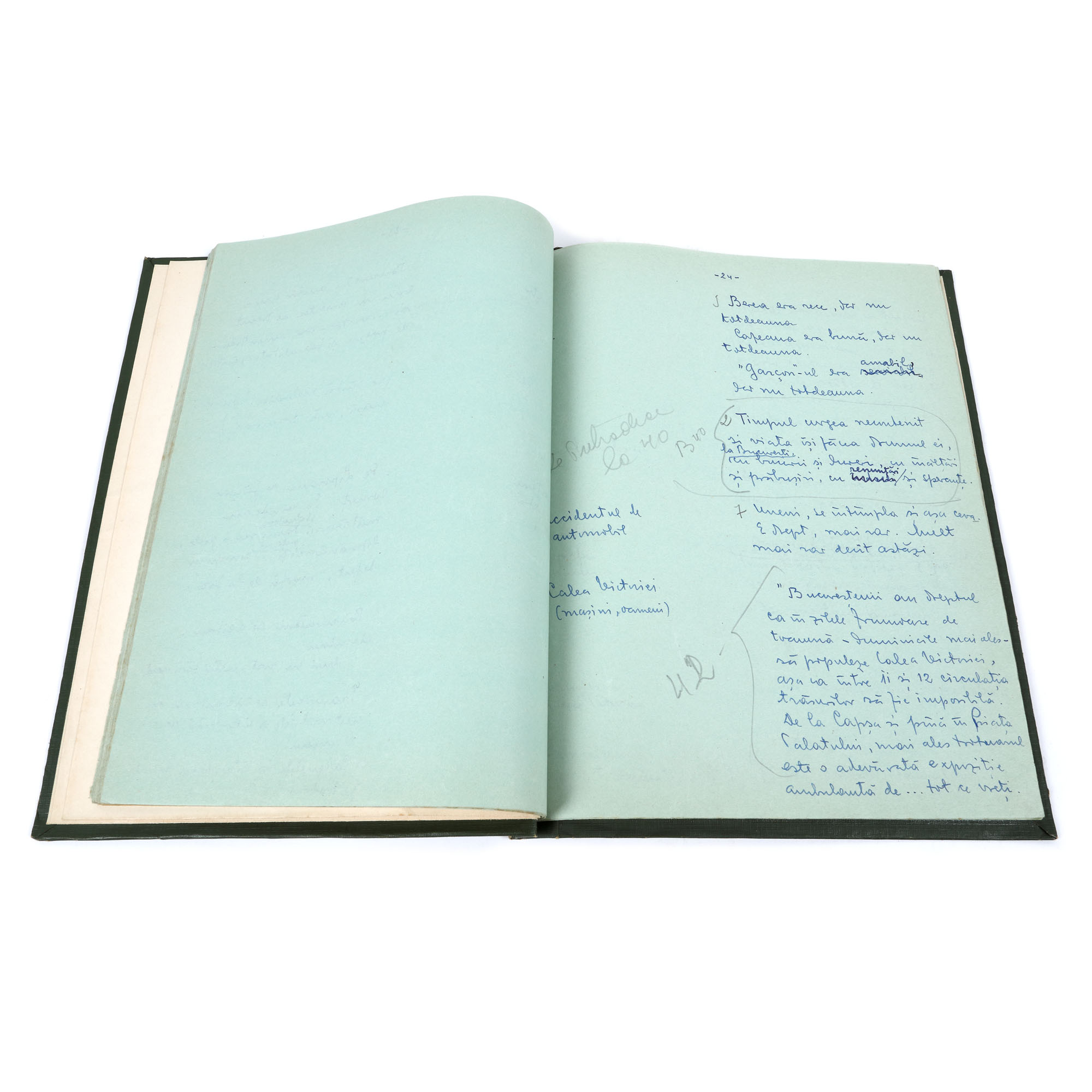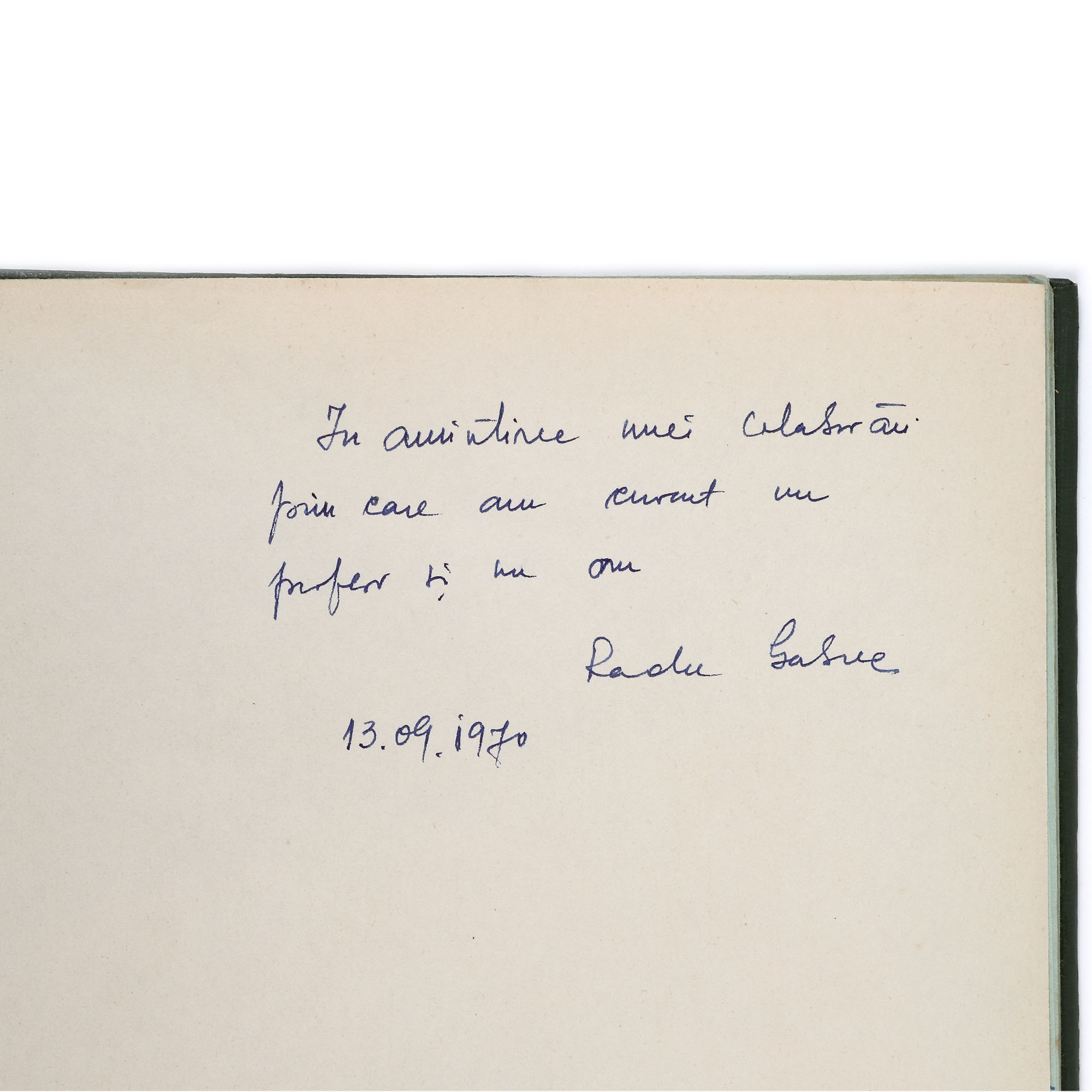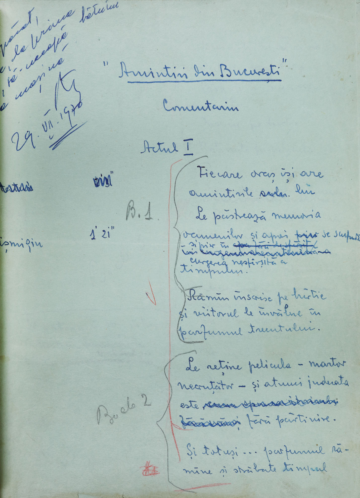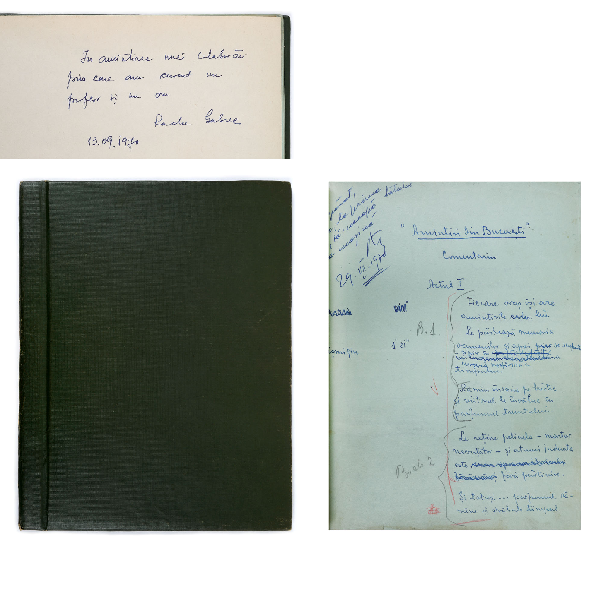 152. Scenariul olograf al documentarului ”Amintiri Bucureștene”, de George Macovescu, cu dedicația politicianului către regizorul și scenaristul Radu Gabrea, provine din colecția politicianului George Macovescu