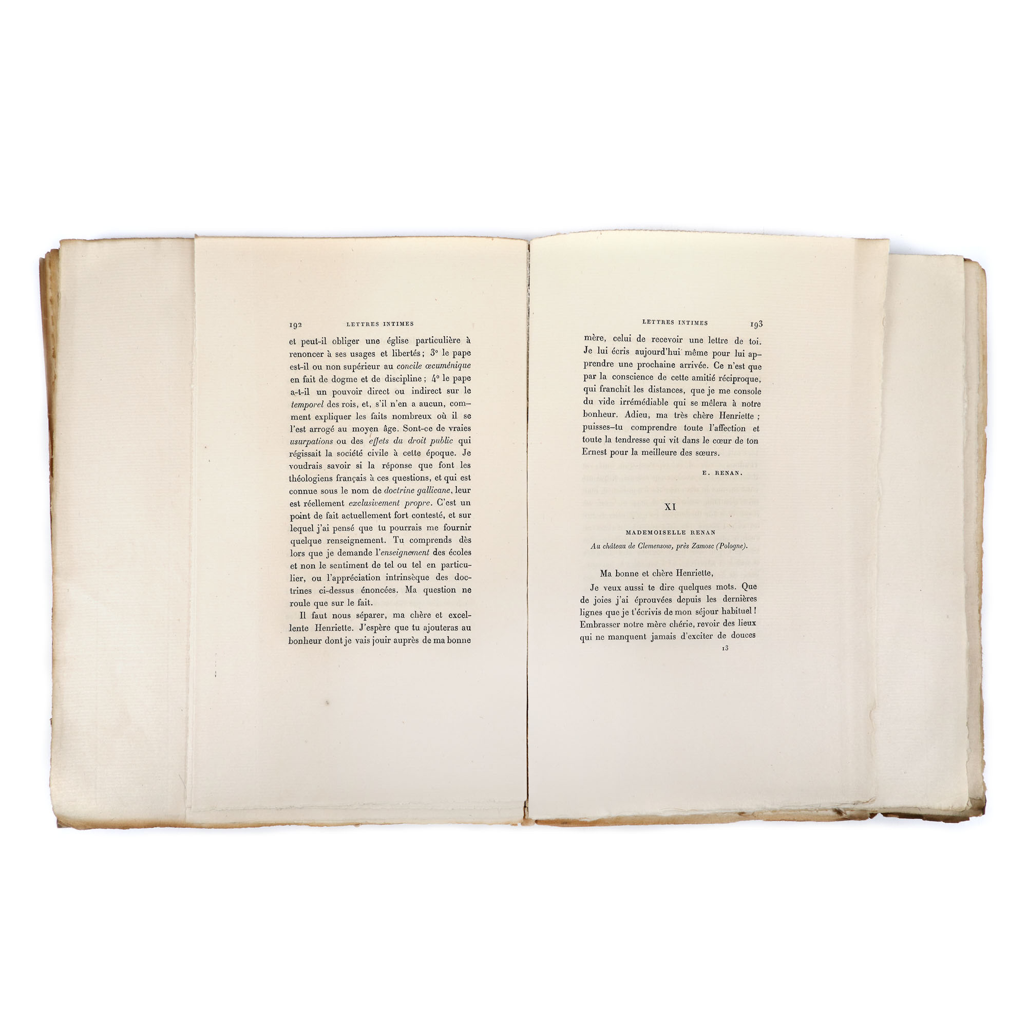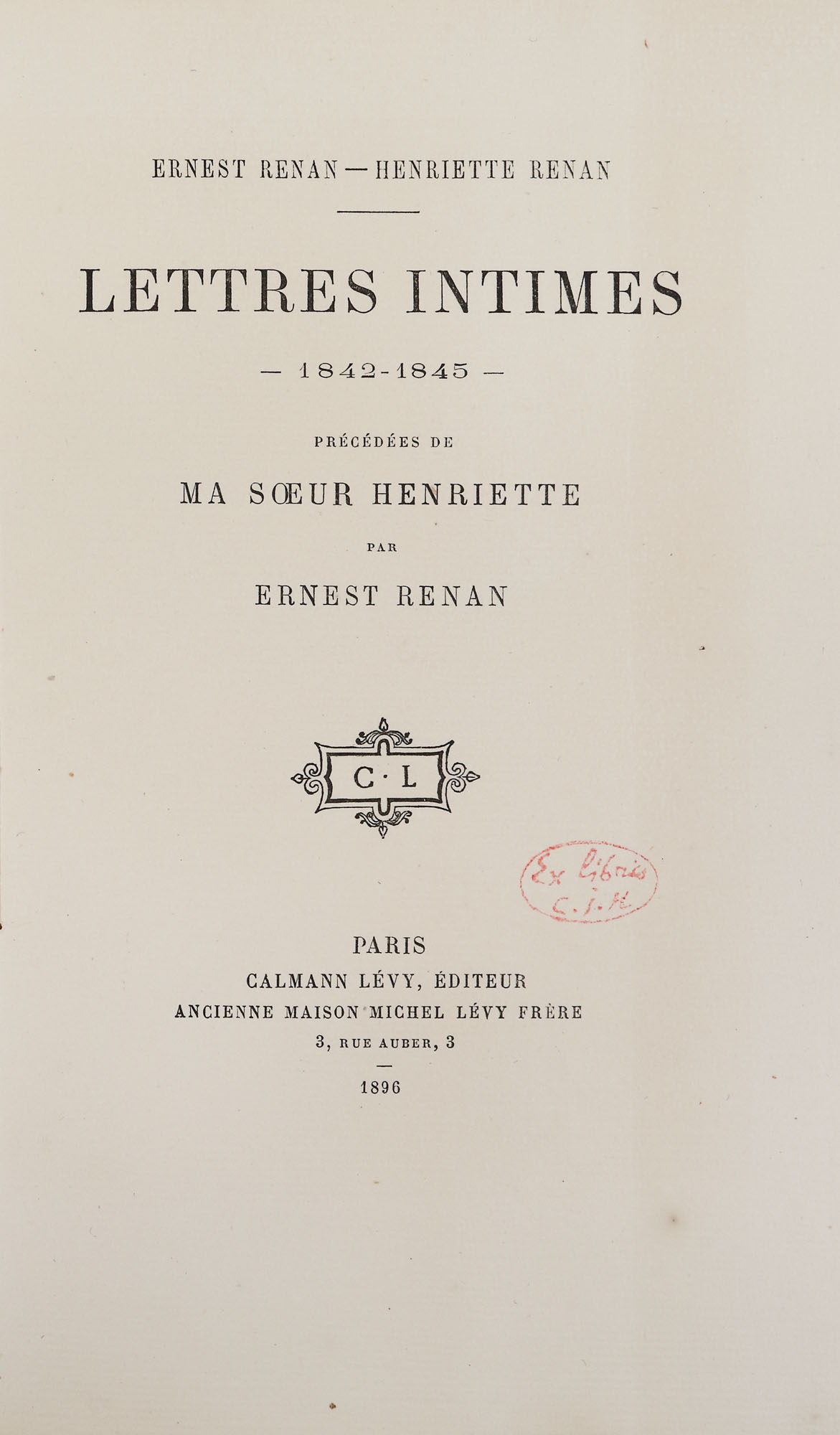 156. ”Scrisori intime 1842-1845”, de Ernest Renan, franceză, Paris, 1896, cu ex-libris ”C.I.M.”, ediție bibliofilă, provine din colecția istorică Șerban Țuculescu-Maria Galaction