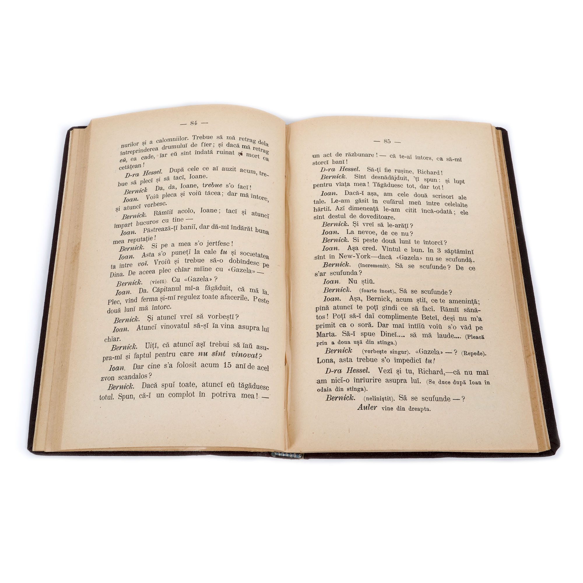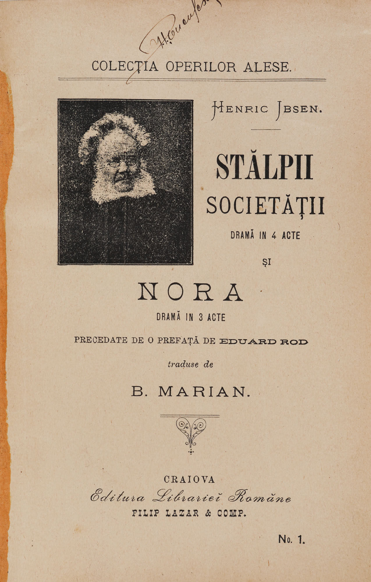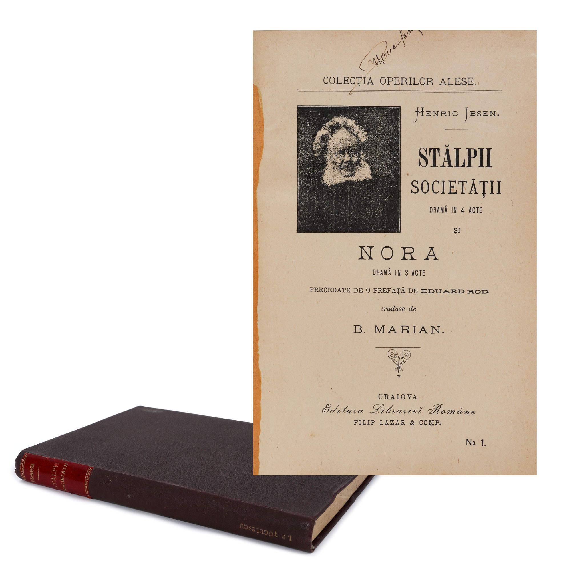 157. ”Stâlpii societății”, de Henrik Ibsen, tradusă de B. Marian, Craiova, 1896, cu ex-libris Ion P. Țuculescu, provine din colecția istorică Șerban Țuculescu-Maria Galaction