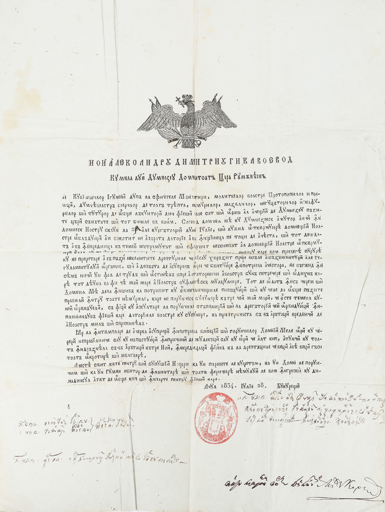 ”Noi, Alexandru Dumitru Ghica voievod, cu mila lui Dumnezeu domn a toată Ţara Rumânească. Cuvioşilor egumeni după la sfintele mănăstiri, molitvelor voastre protopopilor i preoţi, dumneavoastră boierilor de toată treapta, neamurilor, mazâlilor, neguţătorilor, isnafurilor şi tuturor de obşte lăcuitori din fieştecare sat şi oraş al aceştii de Dumnezeu păzite ţări sănătate şi tot binele vă voim! Sosind domniia mea cu dumnezeiesc ajutor aici în domnesc(u) nostru scaun la 21 ale curgătoarei luni iulie şi luând otcârmuirea domneştii noastre oblăduiri am socotit neapărată datorie a vă înştiinţa pe toţi de această şi totdeodată a vă încredinţa că temeiu nestrămutat şi (...) neschimbat al domneştii noastre otcârmuiri este cea de obşte a supuşilor noştri fericire şi bunăstare, pentru care vom priveghea pururea cu nepregetare a să păzi neclintite drepturile ce vi s-au hărăzit prin noăle aşăzământuri ale Regulamentului Organic şi a depărta de asupră-vă orice bântuire împotriva acestora, nebăgând în seamă nici un fel de trudă şi osteneală, spre a statornici a voastră bună petrecere şi odihnă, care totdeauna va fi cea mai mare a noastră sufletească mulţumire. Totodată însă, cerem şi domniia mea de la înşivă ca potrivit cu evangheliceştile povăţuiri şi cu cele de obşte păzite pravili întru toate neamurile, care ne poruncesc supunerea către cei mai mari, ce este temeiul bunei orânduieli, să fiţi cu ascultare la poruncile stăpânirii şi la dregătorii cei orânduiţi, împlinindu-vă fieşcare datoriile voastre cu supunere, ca printr-aceasta să vă arătaţi vrednici de a noastră milă şi sprijineală. Iar la întâmplare, de a cerca asupriri împotriva voinţii şi poruncilor domni(i)i mele, ori cu cereri nepraviliice sau cu năpăstuiri în pricini de judecăţi sau cu orice alt chip, atunci cu toată îndrăzneala să vă arătaţi către noi, încredinţaţi fiind că la dreptăţile ce veţi avea veţi găsi toată ocrotirea şi mângâierea. Acestea sânt câte pentru voi supuşii noştri, ca un părinte le cugetăm, ca un domn le poruncim şi ca un rumân iubitor de înaintarea şi toată fericirea neamului le vom îngriji cu dinadinsul atât de obşte, cât şi în parte pentru fieşcare. Anul 1834 iulie 28, Bucureşti” Documentul cuprinde un anganjament domnesc, asumat în fața clerului, a boierilor și a stărilor, de respectare a hotărârilor Regulamentului Organic și de statornicire a drepturilor sociale. Conține sigiliul oval al domnului, în tuș roșu; este tipărit în limba română, cu alfabet chirilic, pe o filă in-folio de hârtie, cu filigran. Hrisovul reprezintă o piesă deosebit de importantă în ceea ce privește atașamentul domniei față de Regulamentul Organic și față de politica Imperiului Rus în această regiune a sud-estului european.