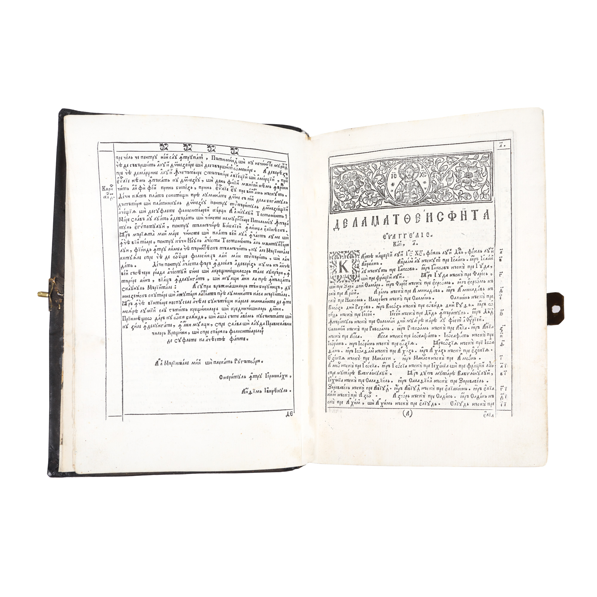 Antim Ivireanul, născut în 1650, are o origine georgiană dar drumul său în cadrul ortodoxiei l-a adus la gurile Dunării, în Țara Românească. Înainte de această perioadă, a trăit pe lângă Patriarhia ecumenică de la Constantinopol, unde a pătruns tainele credinței dar și pe cele ale meșteșugului tipografic în toate detaliile acestuia, de la scriere, până la fabricarea hârtiei și xilogravură. Pătruns în atmosfera și mediul erudite și cultivate patronate de Patriarhia ortodoxă, a învățat mai multe limbi, greacă, turco-osmană și arabă. Cel care l-a adus la nord de Dunăre a fost domnitorul Constantin Brâncoveanu care i-a încredințat dezvoltarea și conduicerea tipografiei domnești de la București în 1691. Deosebit de activ și dedicat cărții și bisericii, a ocupat mai multe demnități ecleziastice încununate cu aceea de mitropolit al Țării Românești în care era instalat în 1708. Folosind autoritatea de care dispunea și fondurile la care avea acces, a dezvoltat rețeaua de tipografii din țară, cu una la Râmnicu Vâlcea și una la Târgoviște. Prin intermediul numeroaselor lucrări bisericești pe care le-a editat și îngrijit, Antim Ivireanul a creat limbajul bisericesc în limba română și a pus în circulație lucrările fundamnetale ale ortodoxiei transpune într-o variantă românească. Exilat din țară ca urmare a opoziției sale față de regimul fanariot, era asasinat pe drumul către Constantinopol în împrejurări încă neelucidate pe deplin. El a fost canonizat de către Biserica Ortodoxă Română în 1992. Exemplarul este complet și se prezintă într-o foarte bună stare de conservare; face parte din prima ediție, în 4º , cu două foi nenumerotate și 209 numerotate. Prima filă nenumerotată reprezintă foaia de titlu și pe verso are stema lui Constantin Brâncoveanu și versurile închinate stemei; a doua filă este nenumerotată și prezintă o dedicație către domnitor întocmită de Antim Ivireanu. Cartea este tipărită cu negru, caracterele literelor, așezarea în pagină, chenarele și elementele de decor sunt ale Bibliei din 1688. Volumul are 34 de rânduri pe pagină, inițialele, frontispiciile, finalele, de compoziție tipografică, se regăsesc de asemenea în decorul tipografic al Bibliei lui Șerban Cantacuzino. Legătura cărții datează din prima jumătate a secolului al XIX-lea; copertele sunt din piele de calitate pe tăblii din lemn, în decor imprimat cu fierul la rece și o încuietoare din metal. Pe coperta 1 se regăsesc: chenare liniare, un medalion central iar în colțuri se pot observa cei patru evangheliști. Coperta 2 prezintă chenare liniare simple. Starea de conservare a cărții este foarte bună; atât legătura cât și blocul cărții se păstrează foarte bine; la cotor se văd unele urme de clei la încheietura filelor; hârtia își păstrează o frumoasă culoare albă.
