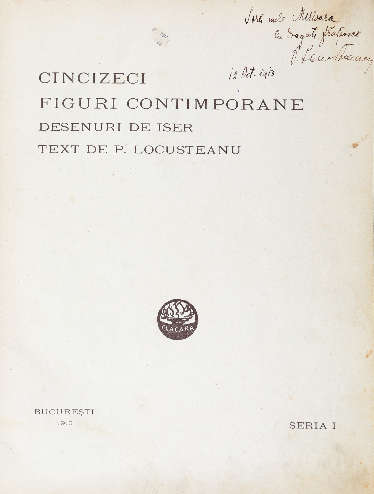 98. "50 de figuri contimporane", cu desene de Iosif Iser și text de Petre Locusteanu, București, 1913, cu dedicația autorului textului către sora sa