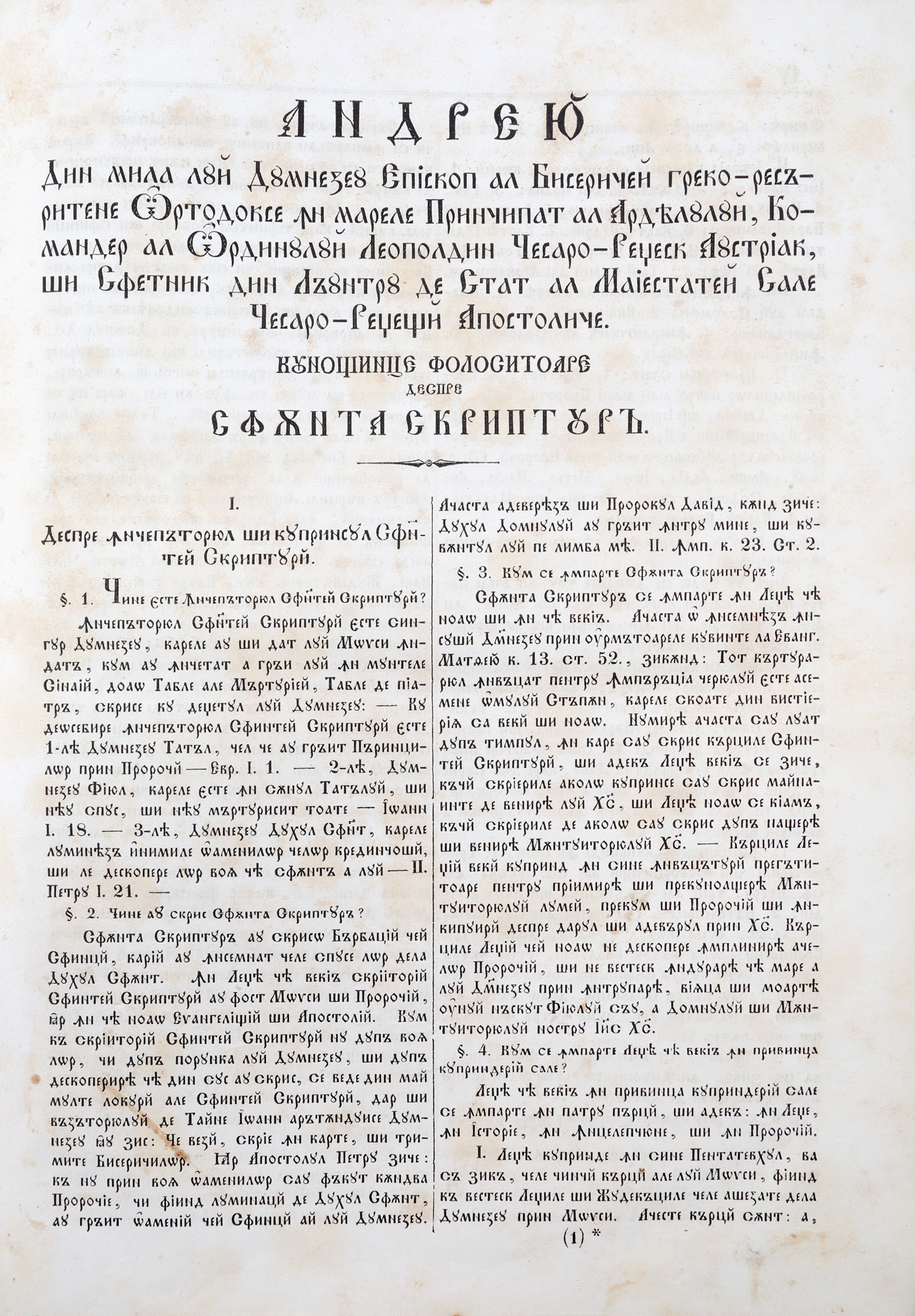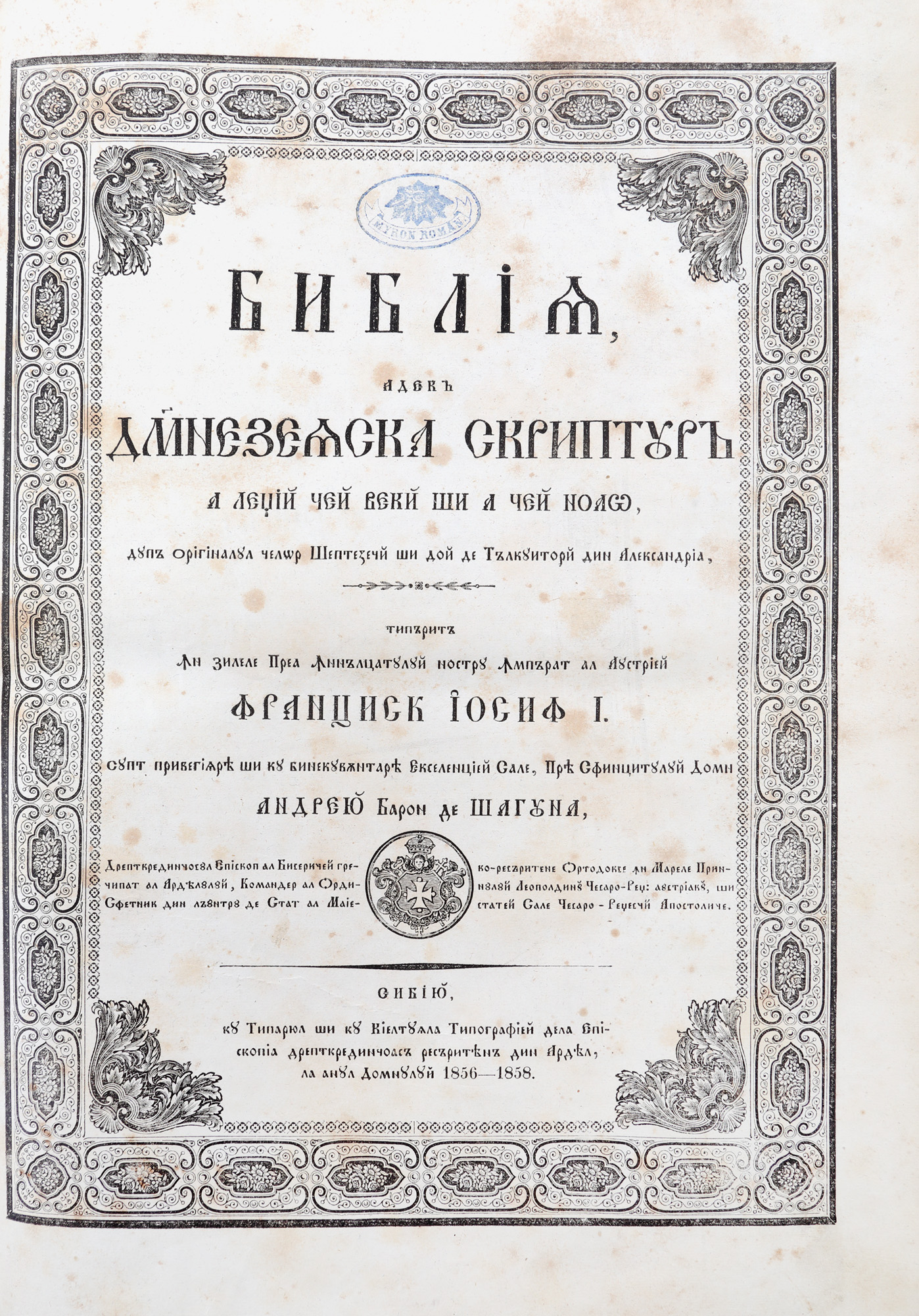 8. ”Biblia, adecă Dumnezeiasca Scriptură”, editată de Andrei Șaguna, mitropolit ortodox al Transilvaniei, Sibiu, 1856-1858, cu ex-libris Miron Romanul, arhiepiscop și mitropolit al Ardealului, piesă rară, de colecție