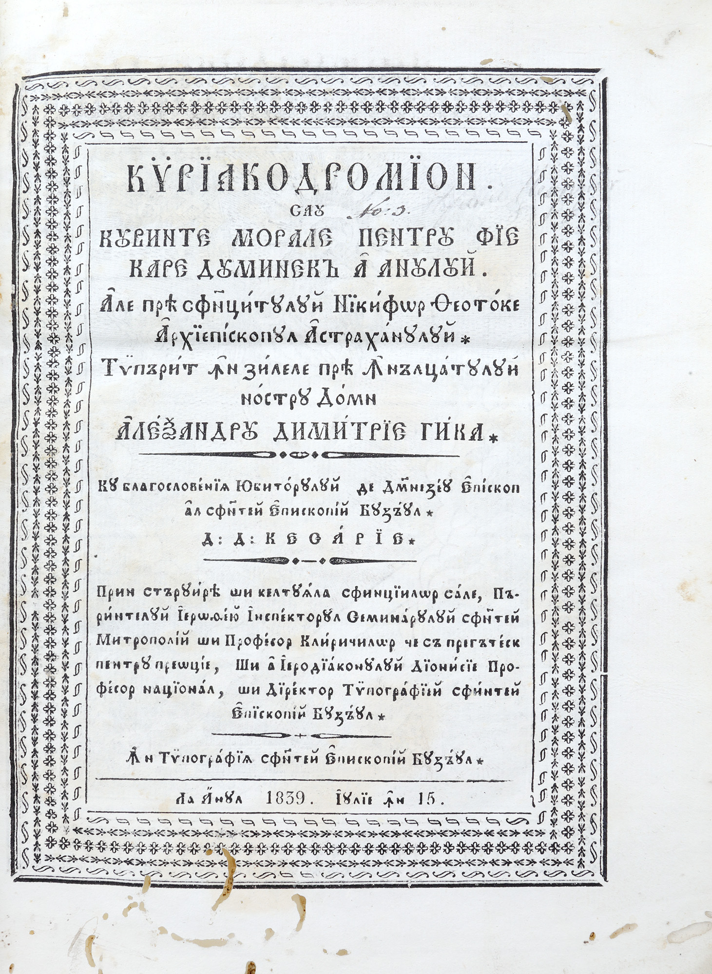 18. ”Chiriacodromion sau cuvinte morale pentru fiecare duminecă a anului ale prea sfințitului Nichifor Teotoche, arhiepiscopul Astrahanului”, Buzău, 1839, cu patru gravuri dintre care trei în text