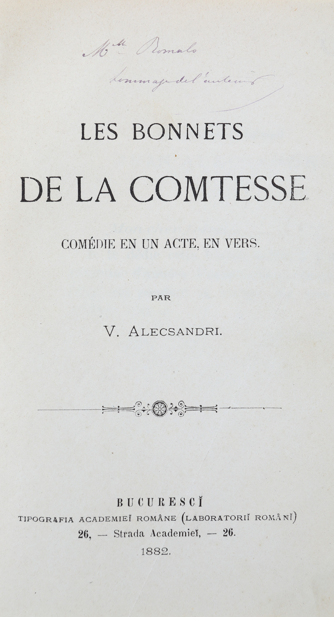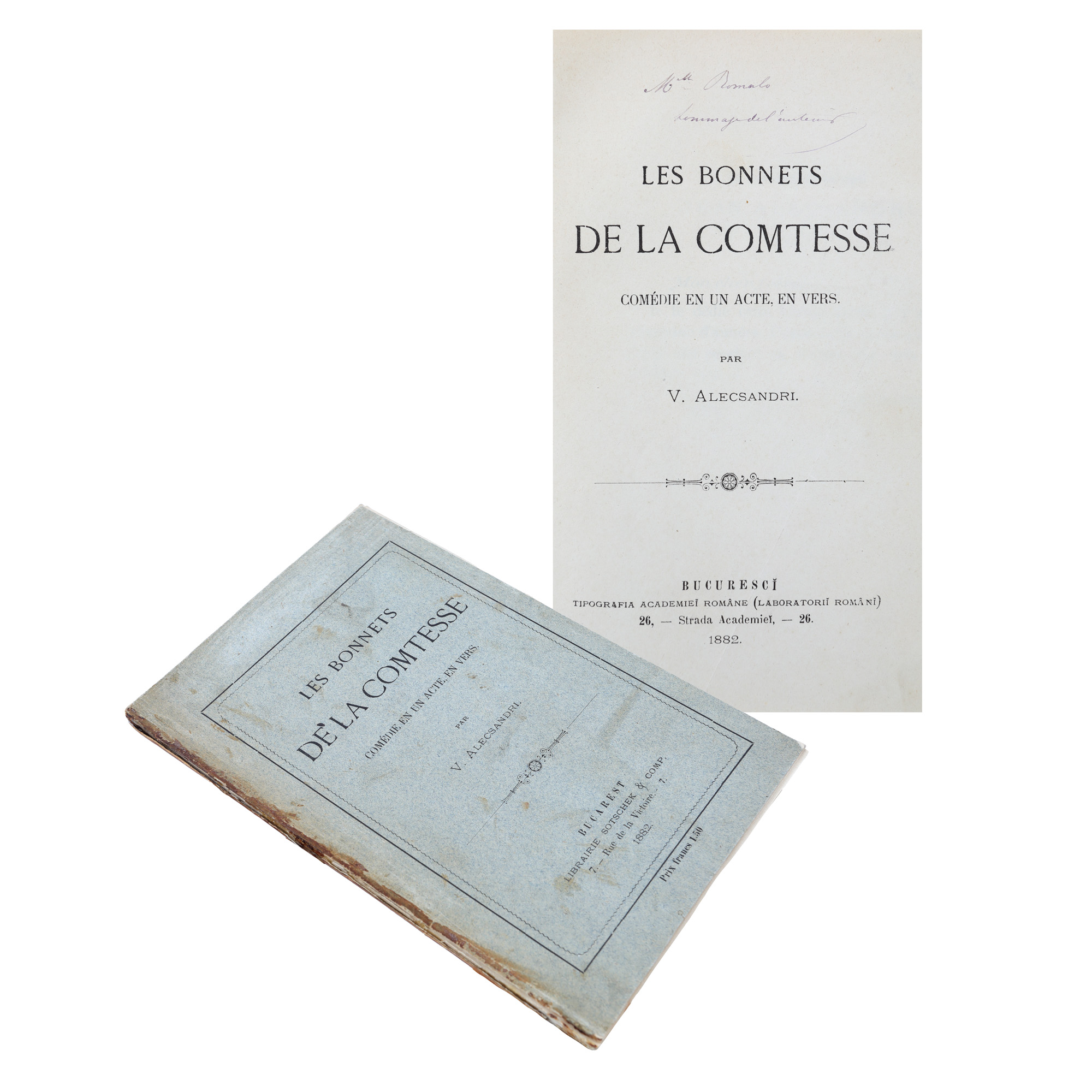 52. ”Les bonnets de la comtesse”, de Vasile Alecsandri, franceză, București, 1882, cu o dedicație către unul dintre membrii familiei Romalo și semnătura olografă a autorului