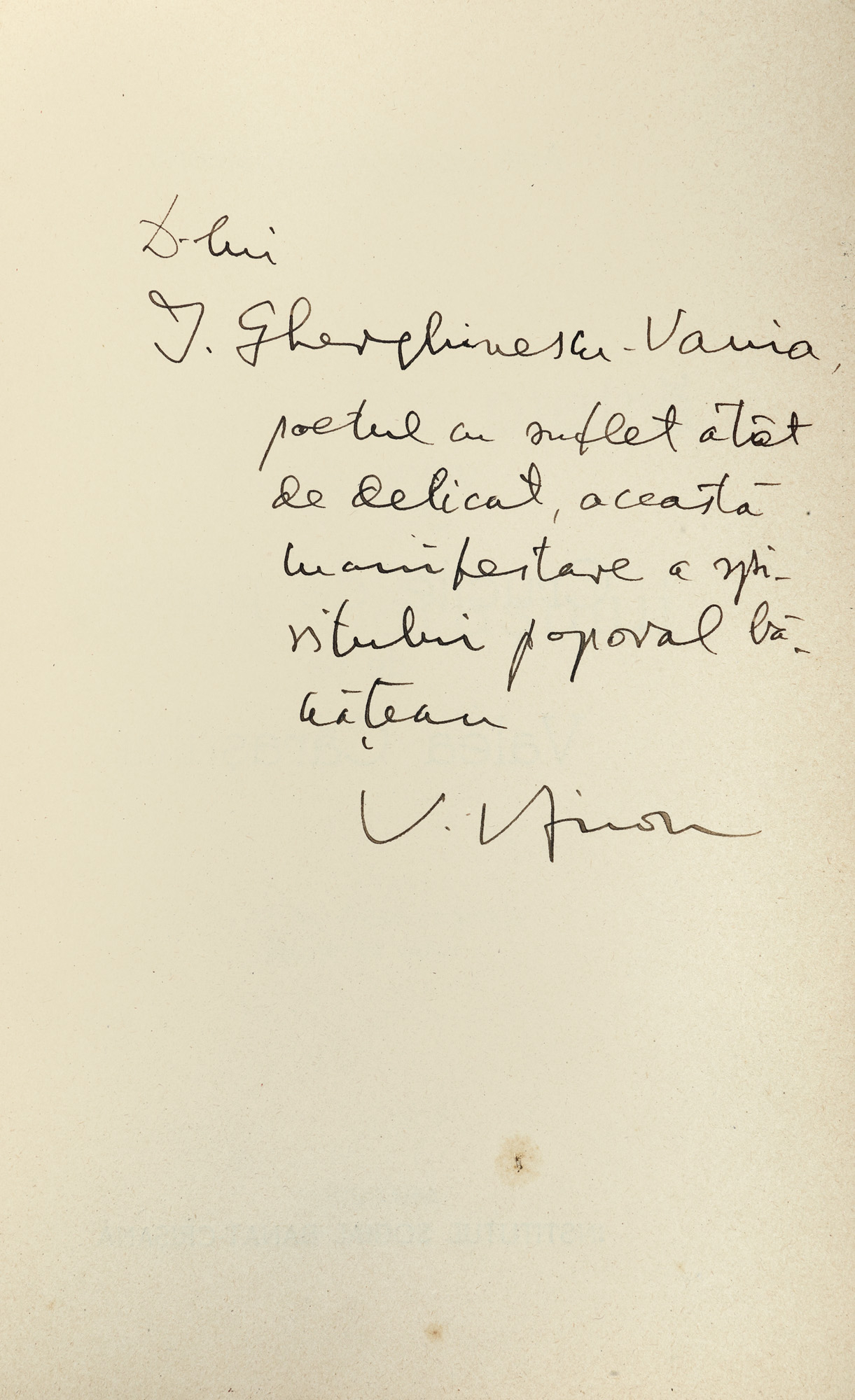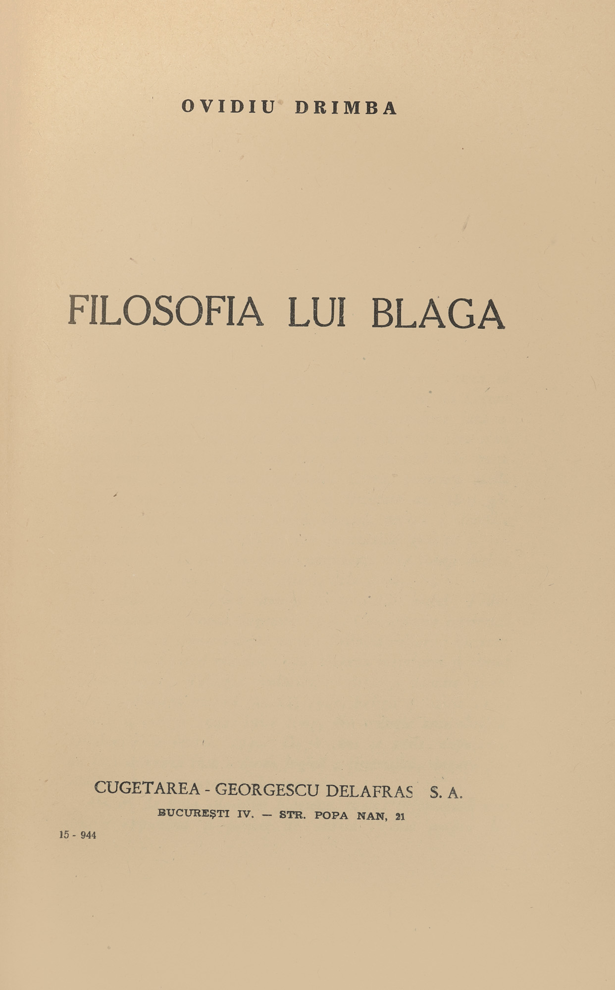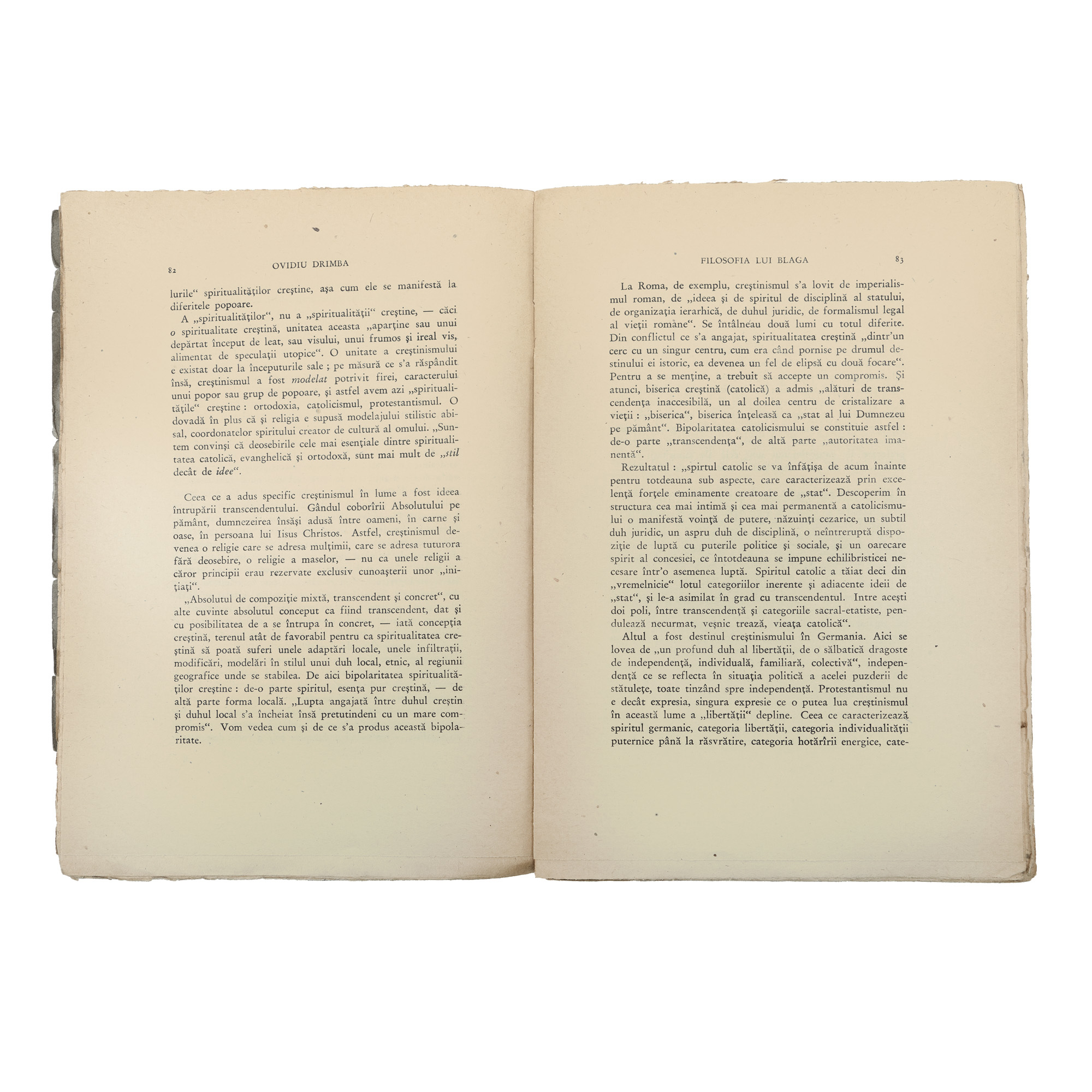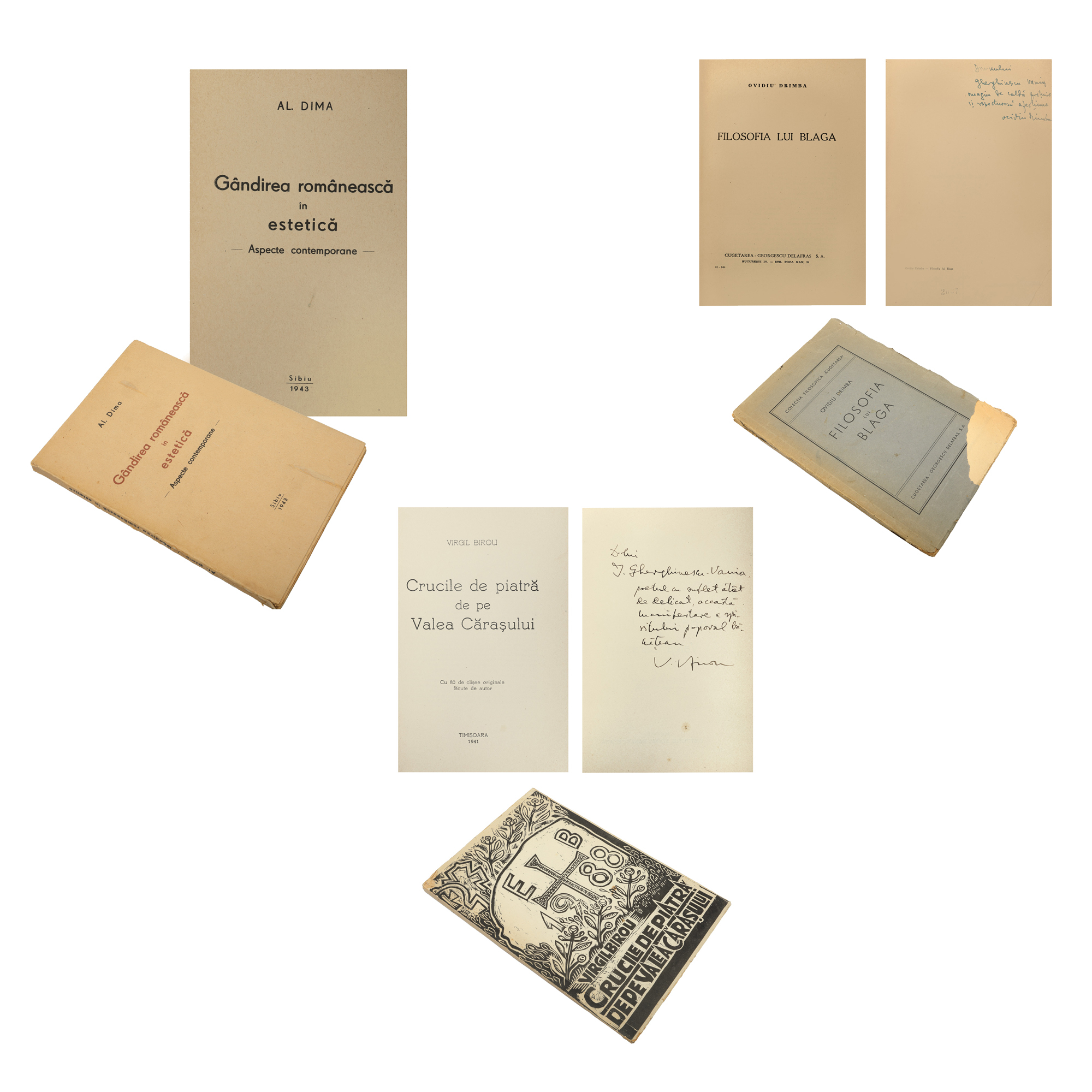 93. Lot format din ”Filosofia lui Blaga”, de Ovidiu Drîmba, București, 1944, ”Gândirea românească în estetică”, de Alexandru Dima, Sibiu, 1943 (exemplar netăiat), ”Crucile de piatră de pe Valea Cărașului”, de Virgil Birou, Timișoara, 1941, cu dedicația și semnătura olografă a autorului, provin din colecția scriitorului Vania Gherghinescu