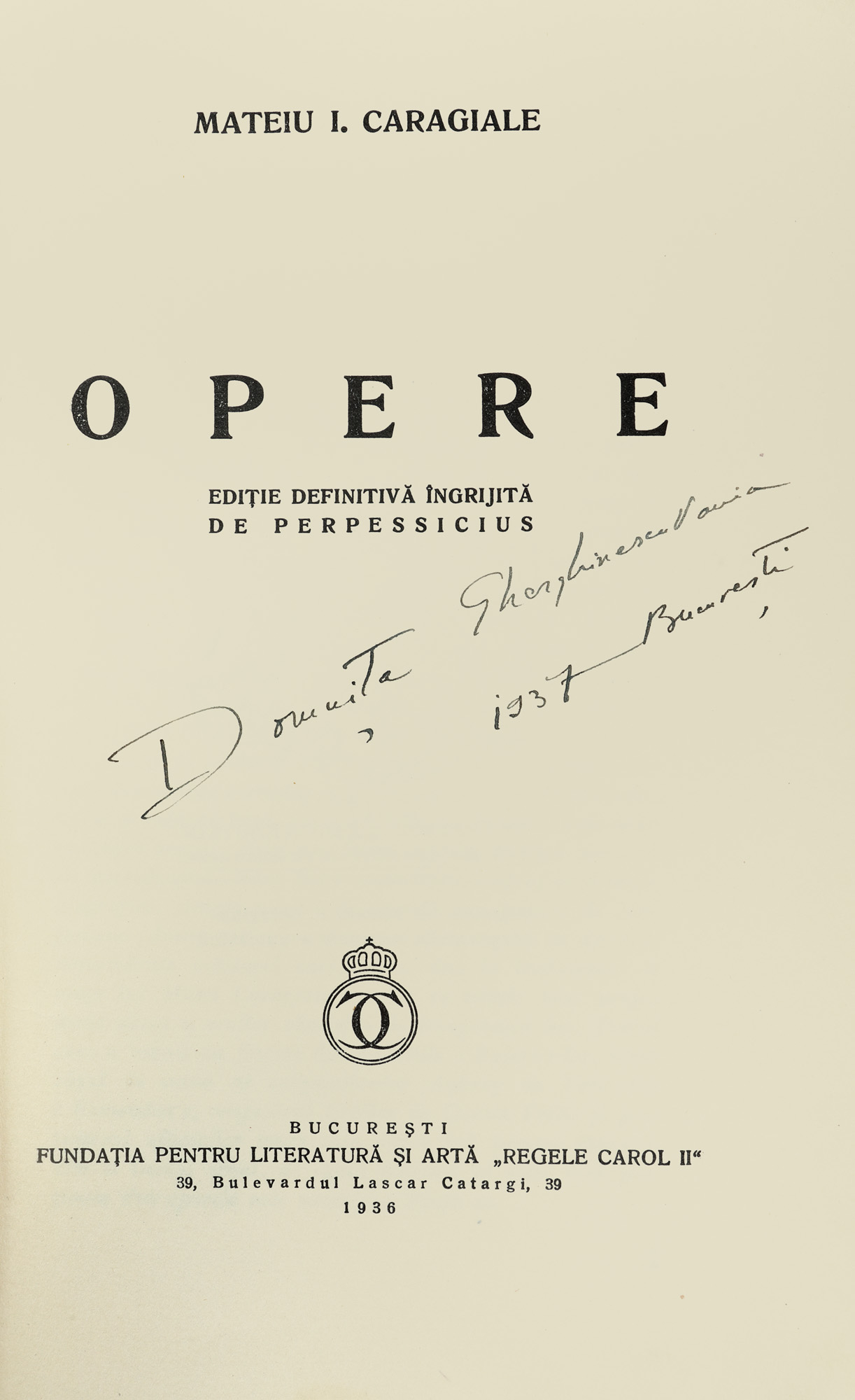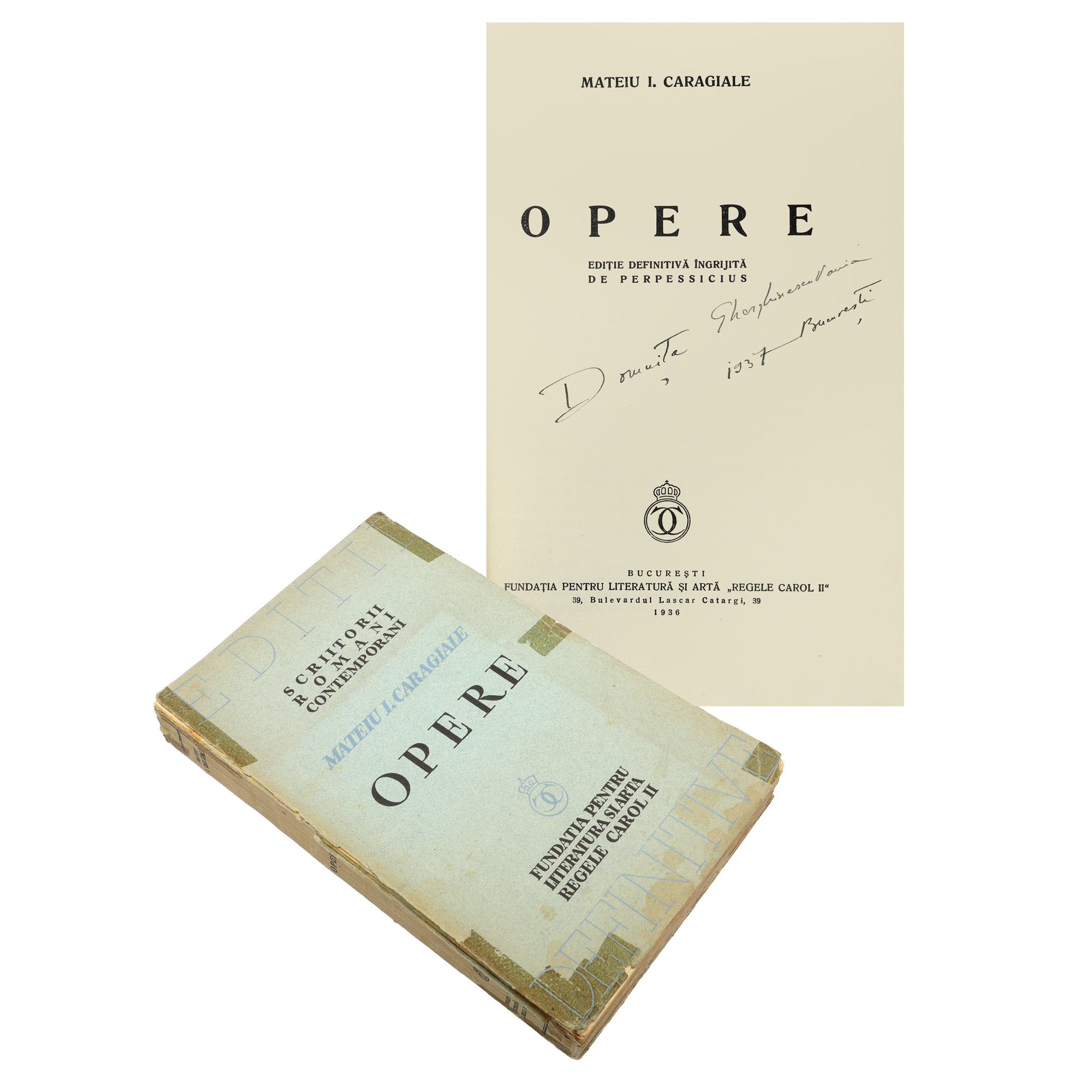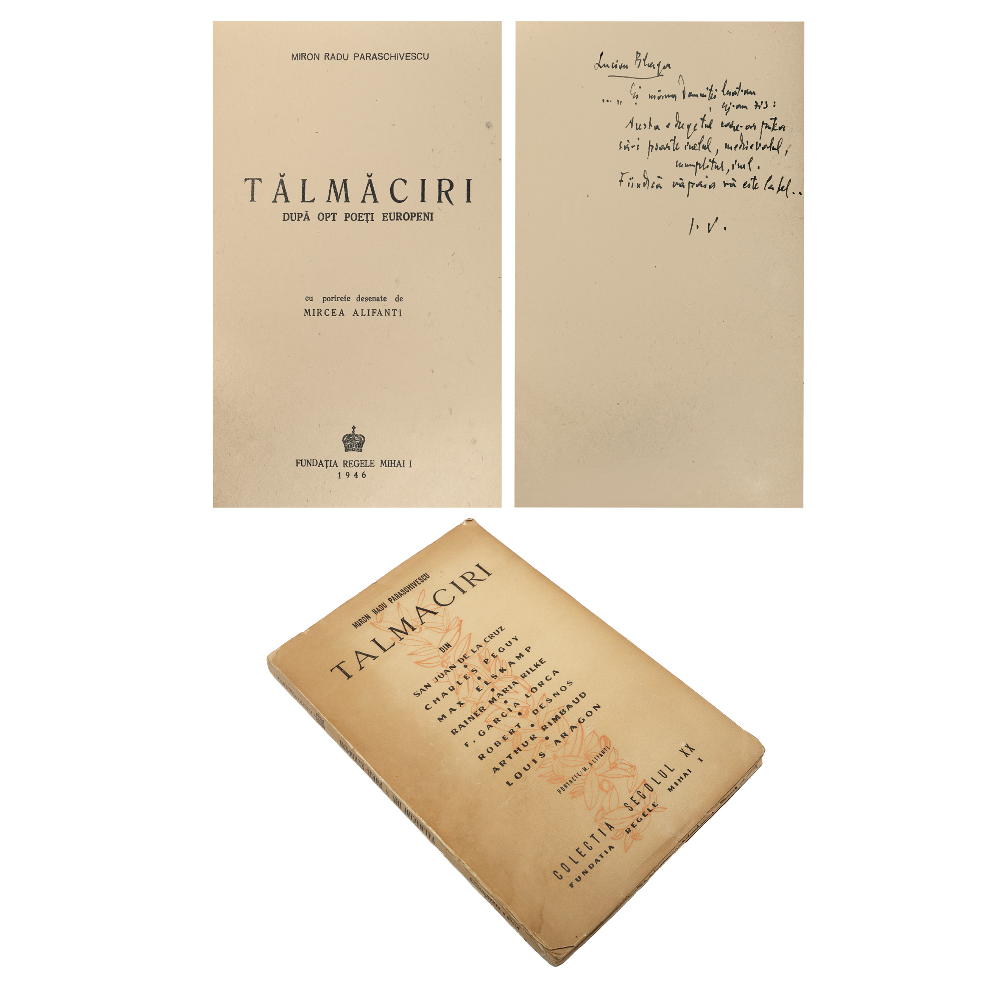 85. Lot format din ”Tălmăciri după opt poeți europeni”, de Miron Radu Paraschivescu, cu portrete de Mircea Alifanti, București, 1946, cu dedicație și semnătură olografă, și ”Opere”, de Mateiu Caragiale, București, 1936, cu ex-libris, provin din colecția scriitorului Vania Gherghinescu