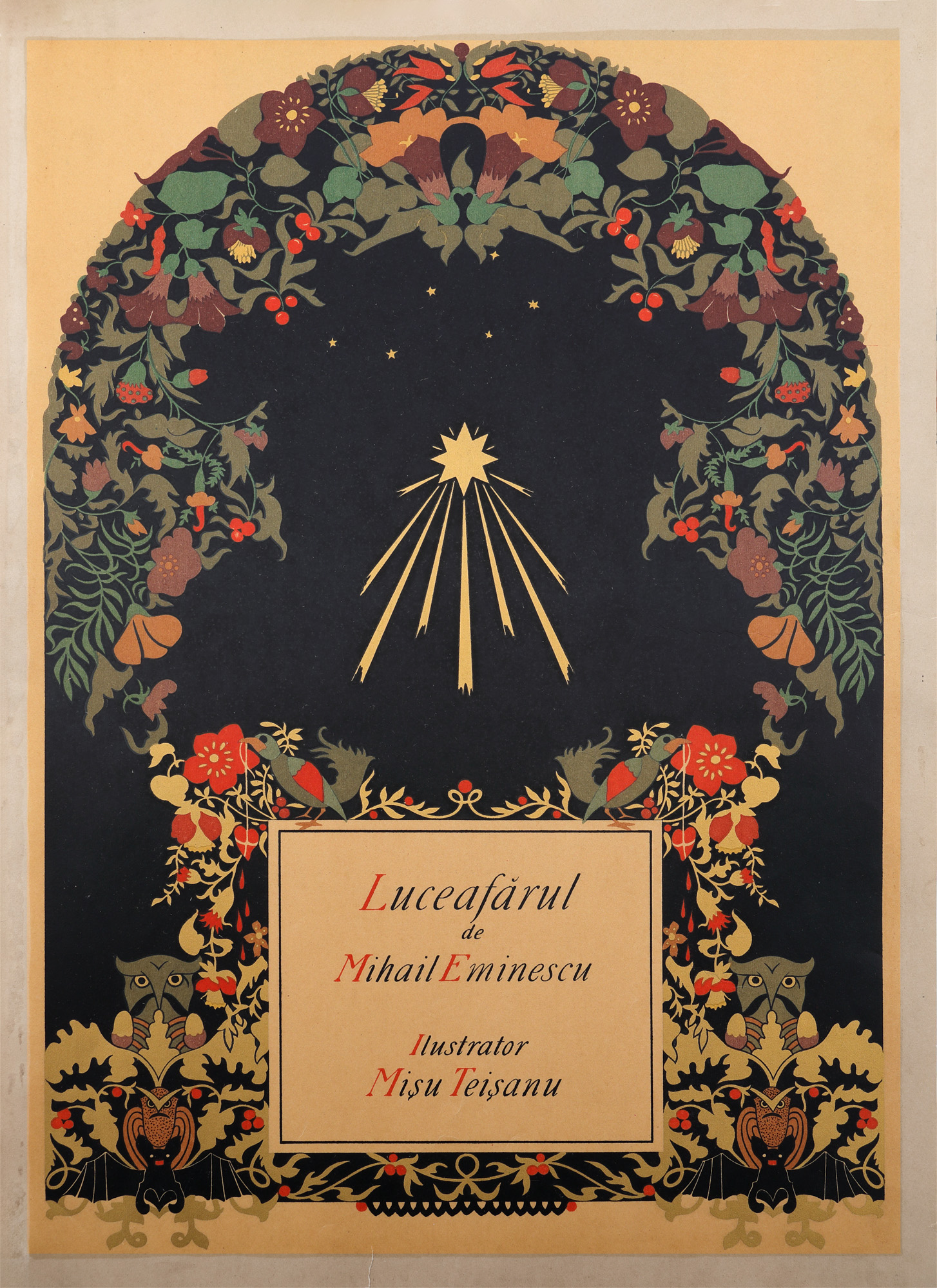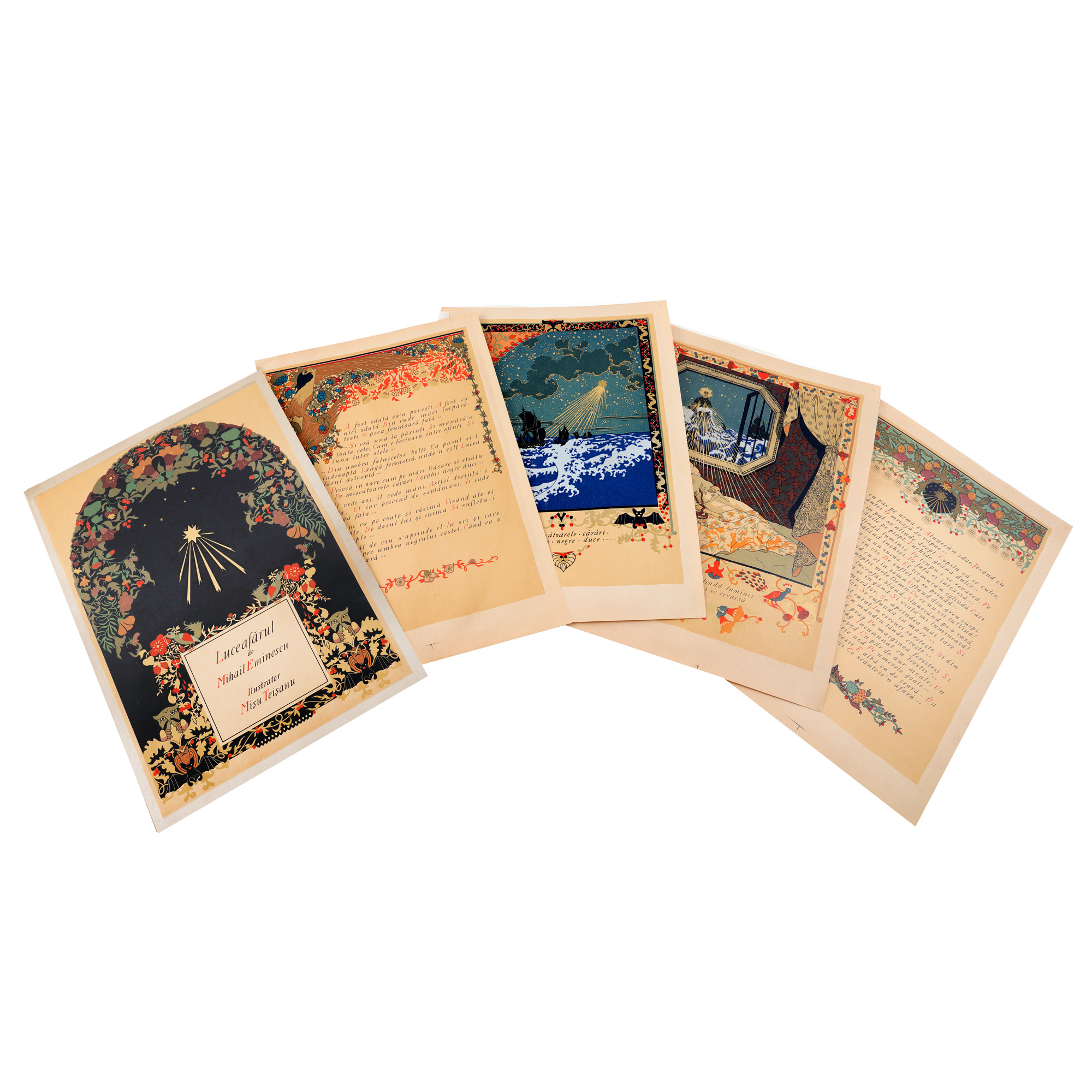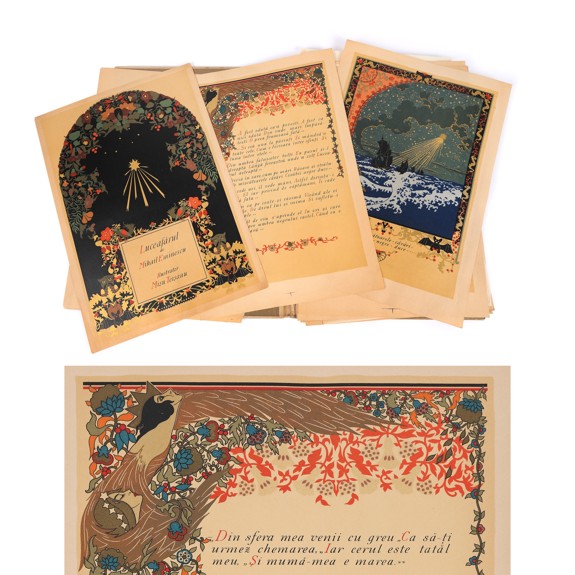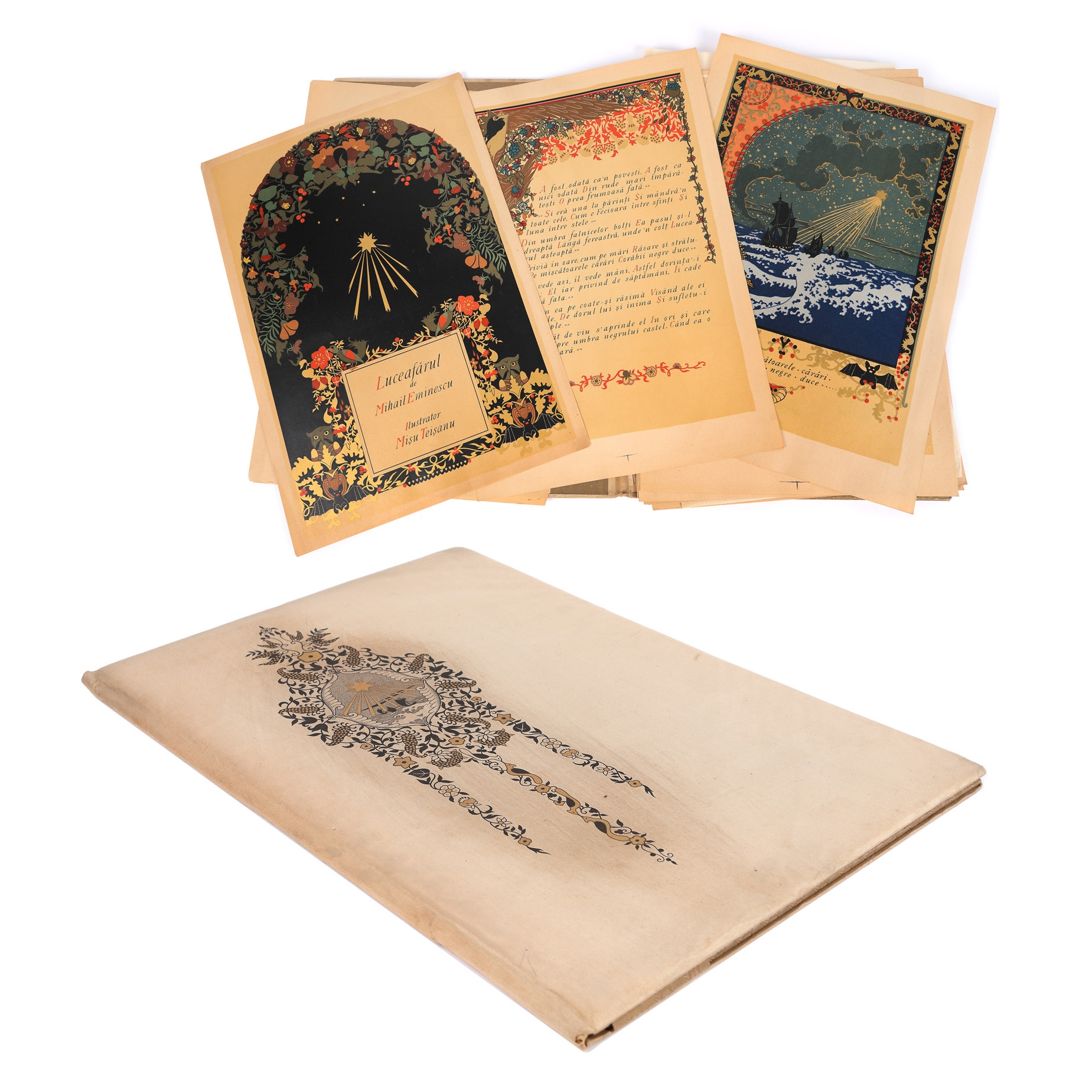 56. Mapă ”Luceafărul”, de Mihai Eminescu, București, 1921-1923, cu 22 de cromolitografii de Mișu Teișanu și semnătura olografă a acestuia, piesă rară (exemplarul 226/250), de colecție