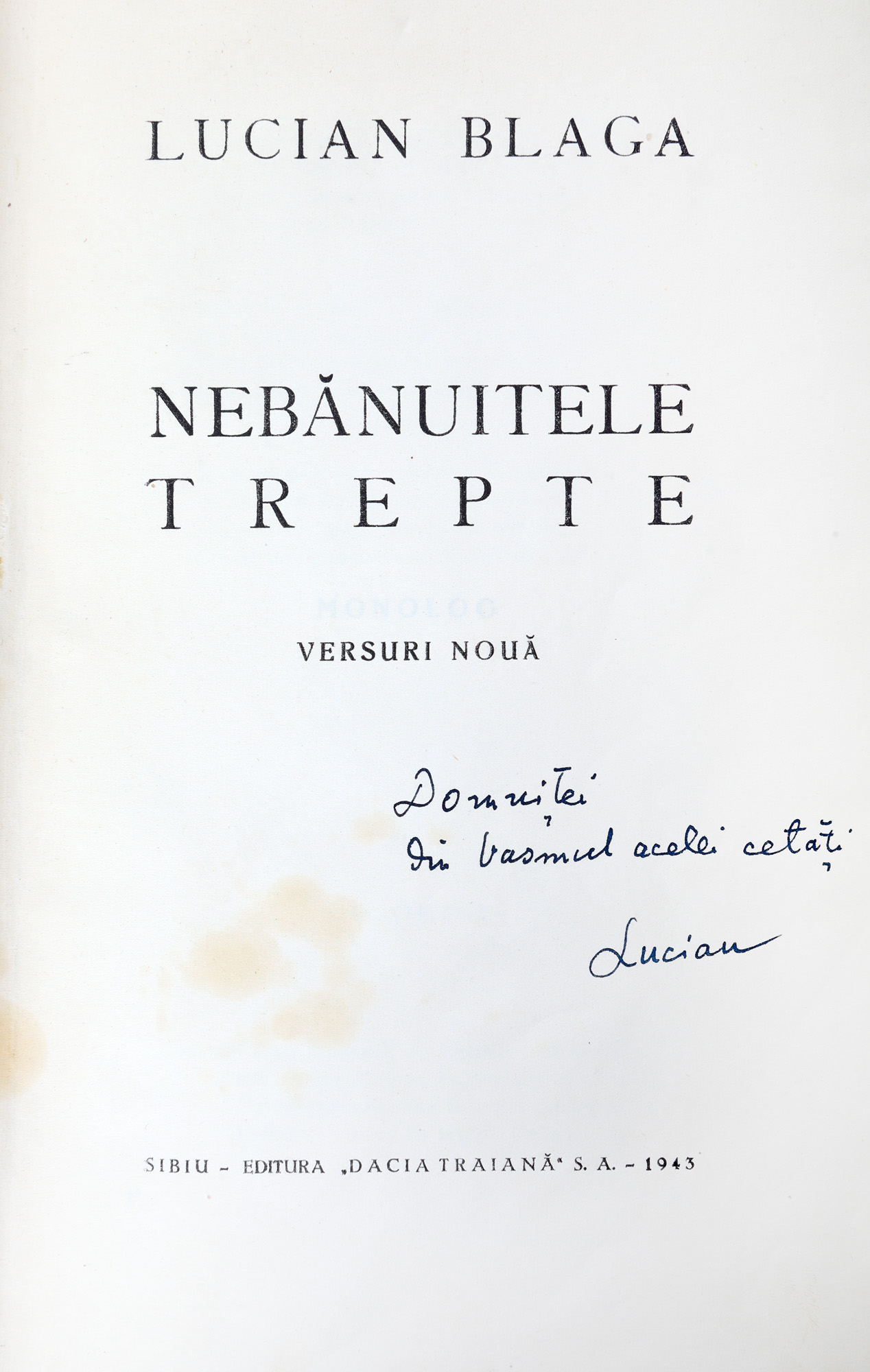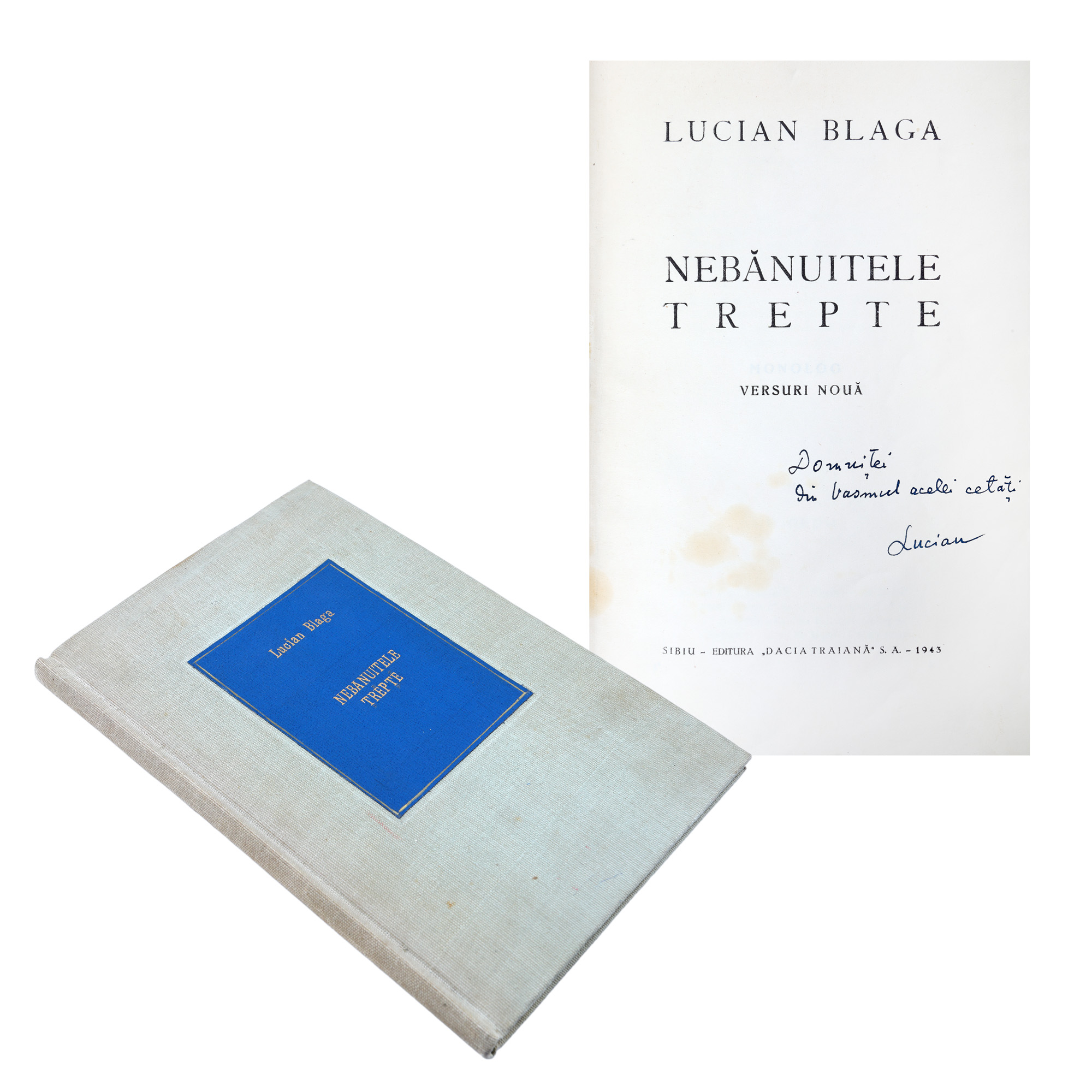 92. ”Nebănuitele trepte”, de Lucian Blaga, Sibiu, 1943, cu dedicația și semnătura olografă a autorului, provine din colecția scriitorului Vania Gherghinescu