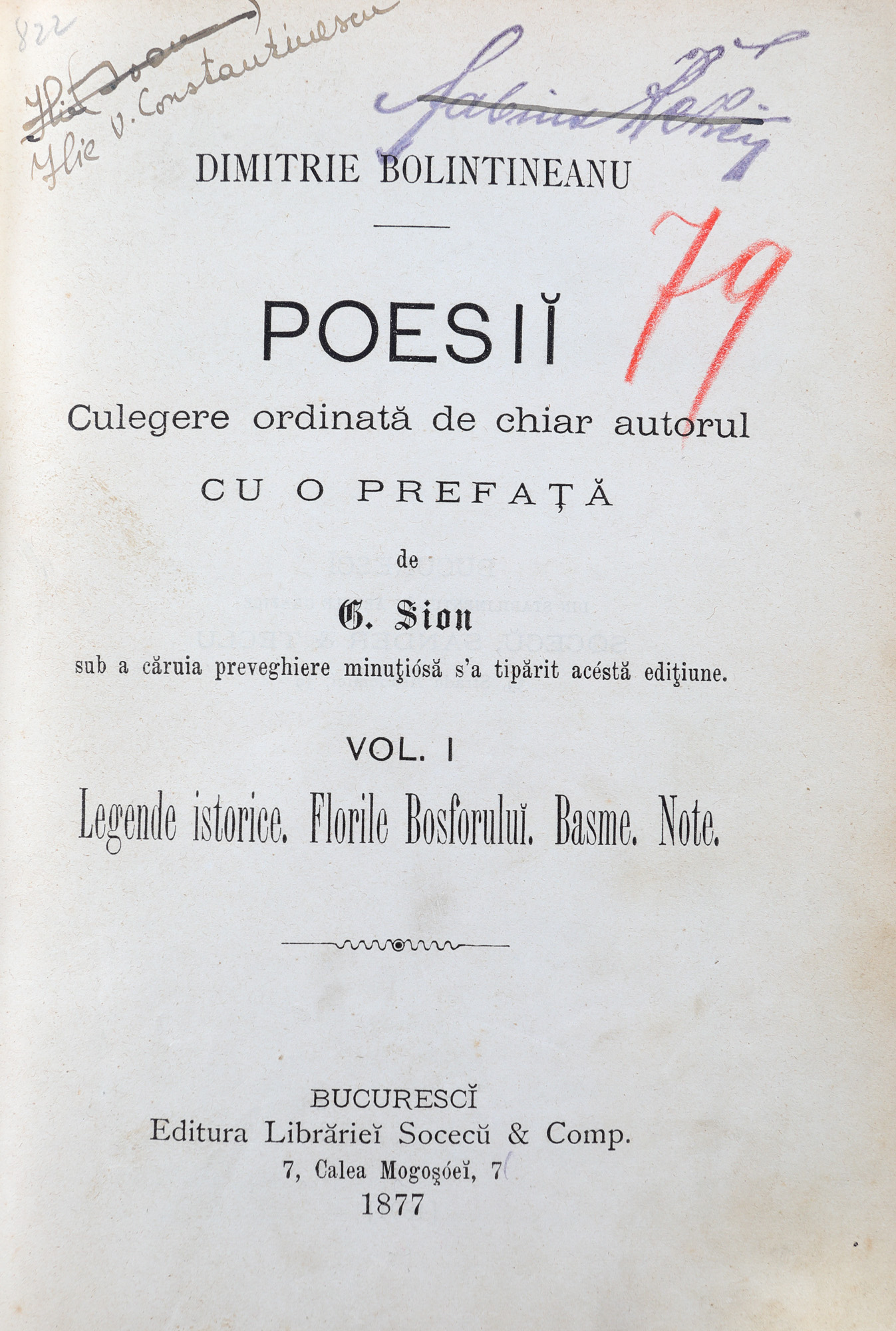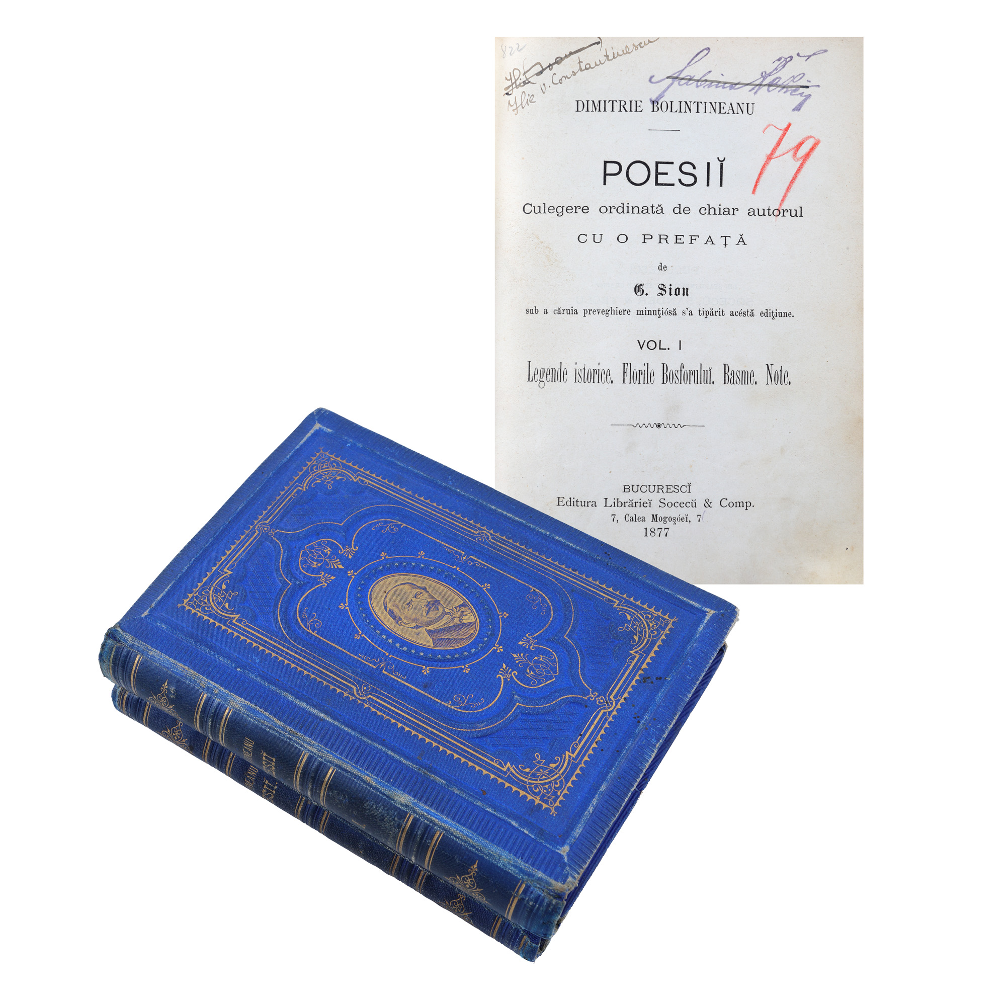 49. ”Poesii", de Dimitrie Bolintineanu, două volume prefațate de Gheorghe Sion, București, 1877, ediție princeps, exemplar bibliofil