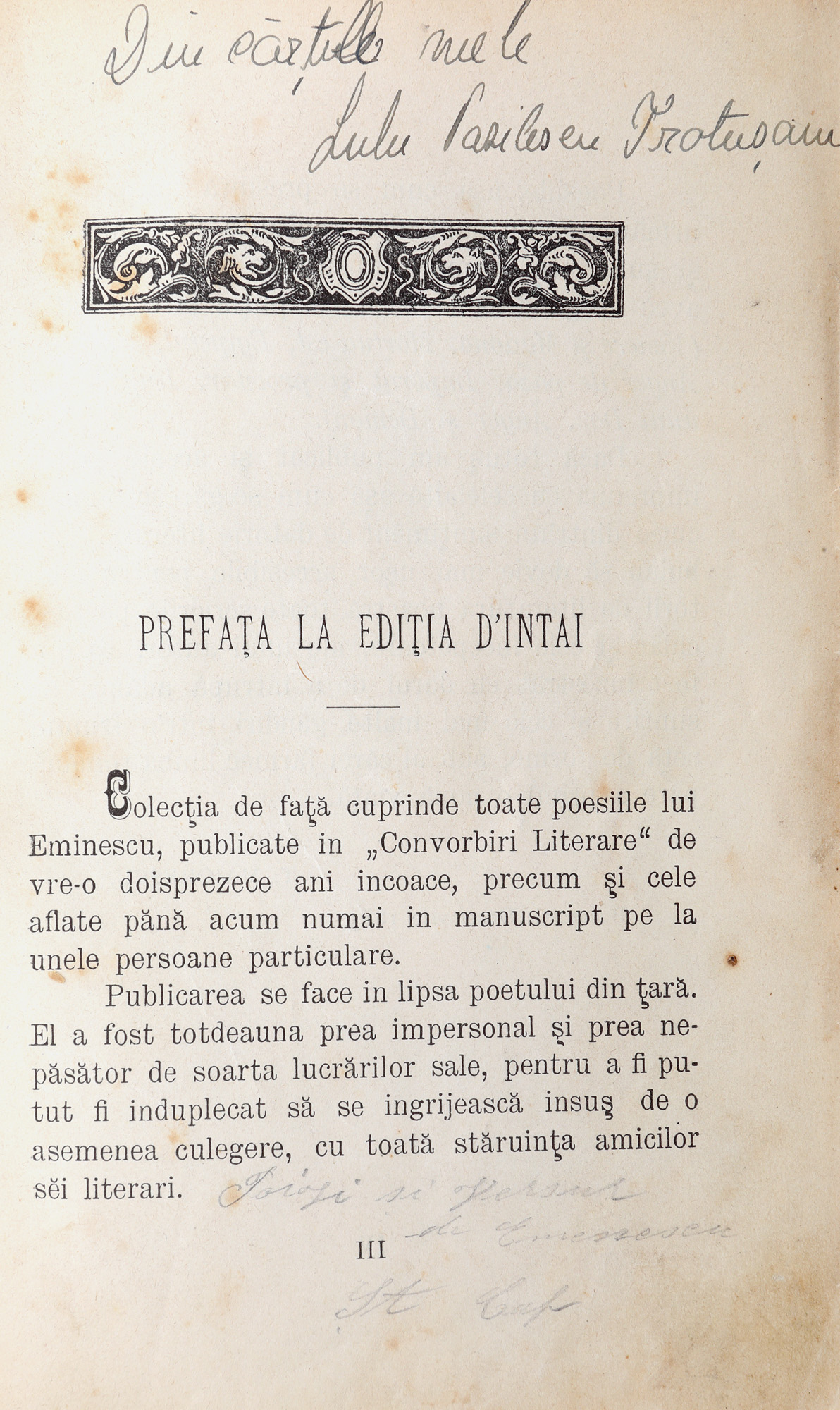 Cartea prezintă un ex-libris manuscris, cu cerneala albastra ”I.C. Frimu”.