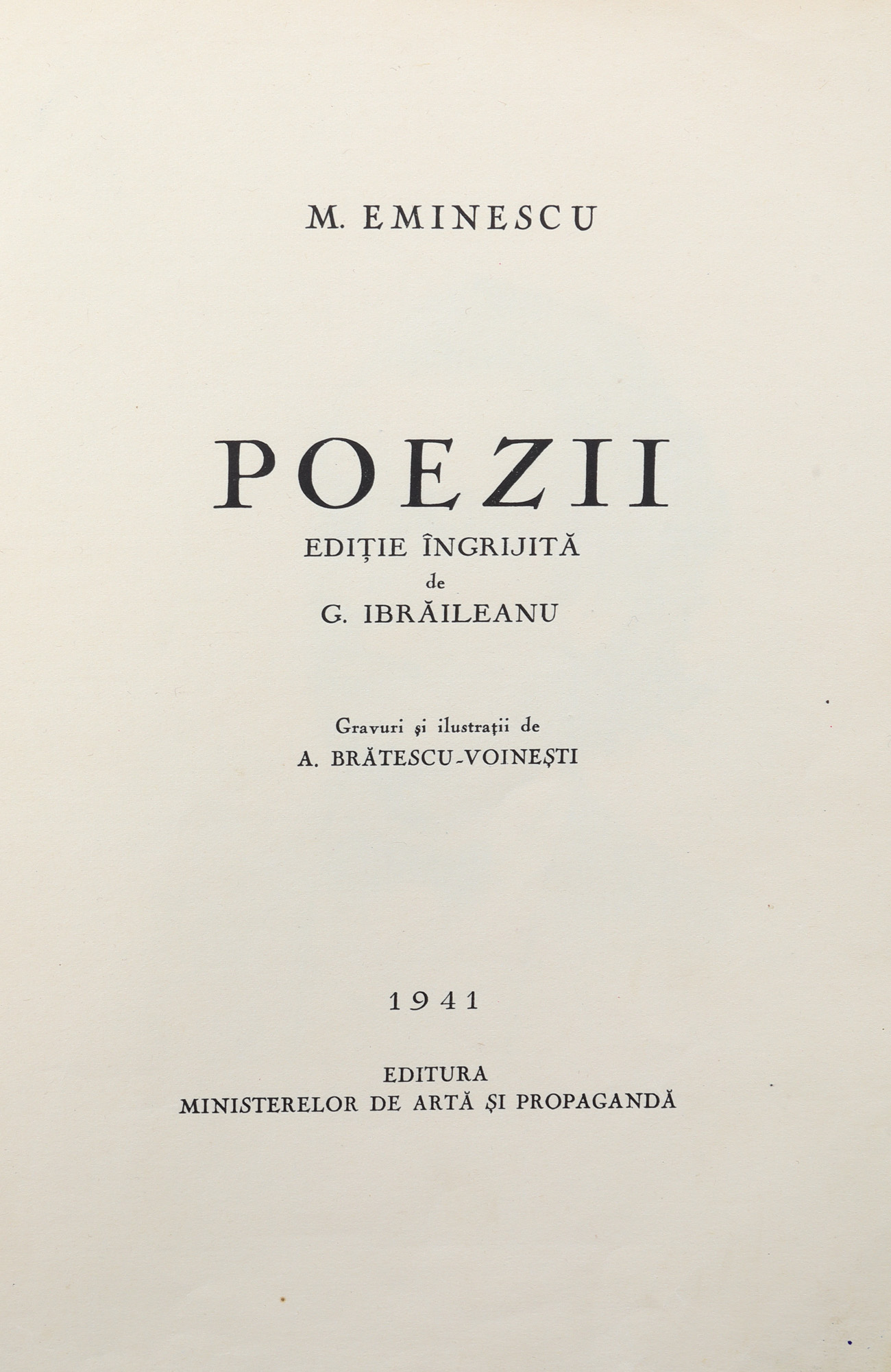 53. ”Poezii”, de Mihai Eminescu, ediție bibliofilă îngrijită de G. Ibrăileanu, cu ilustrații de Alexandru Brătescu-Voinești, Craiova, Ramuri, 1941