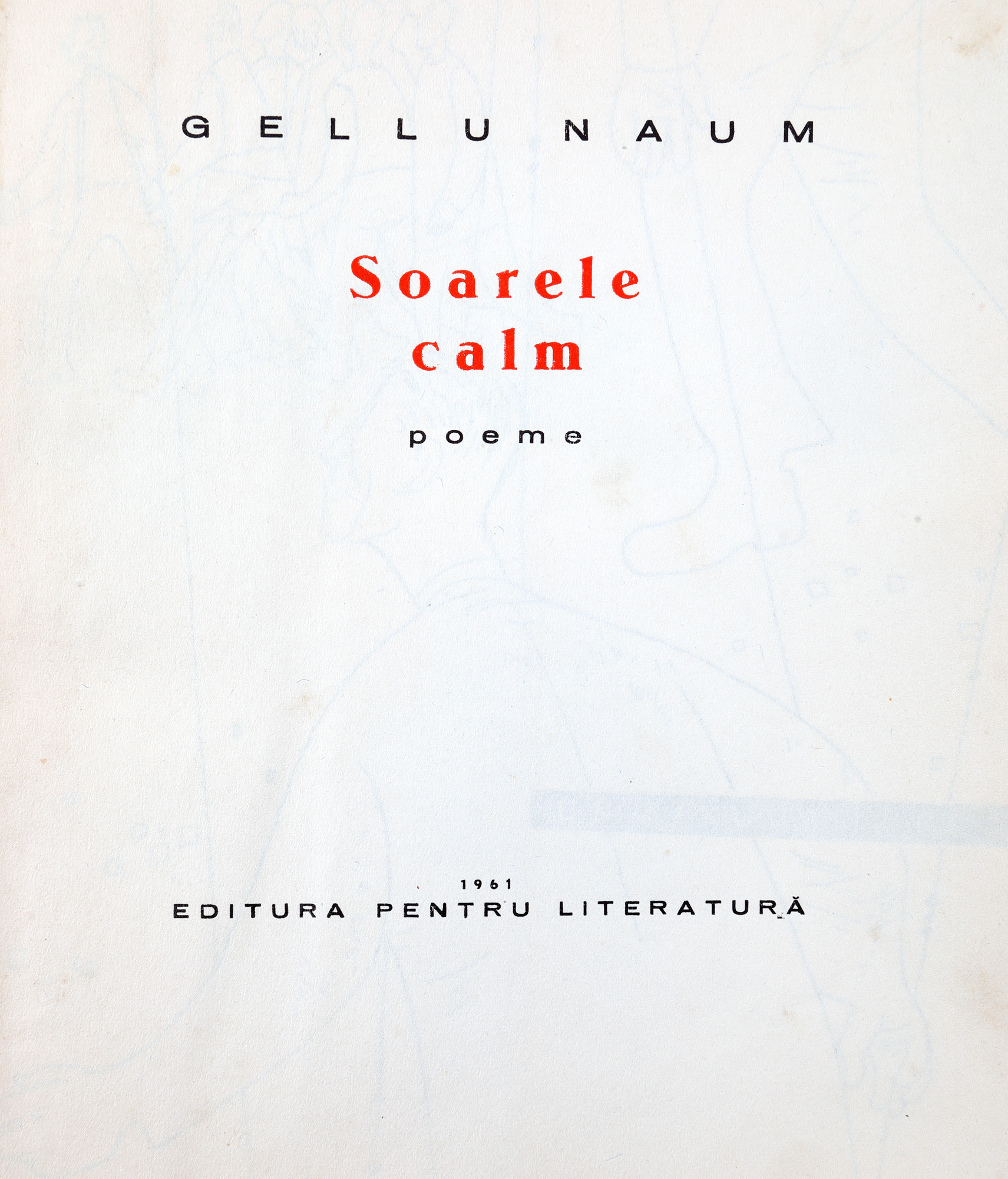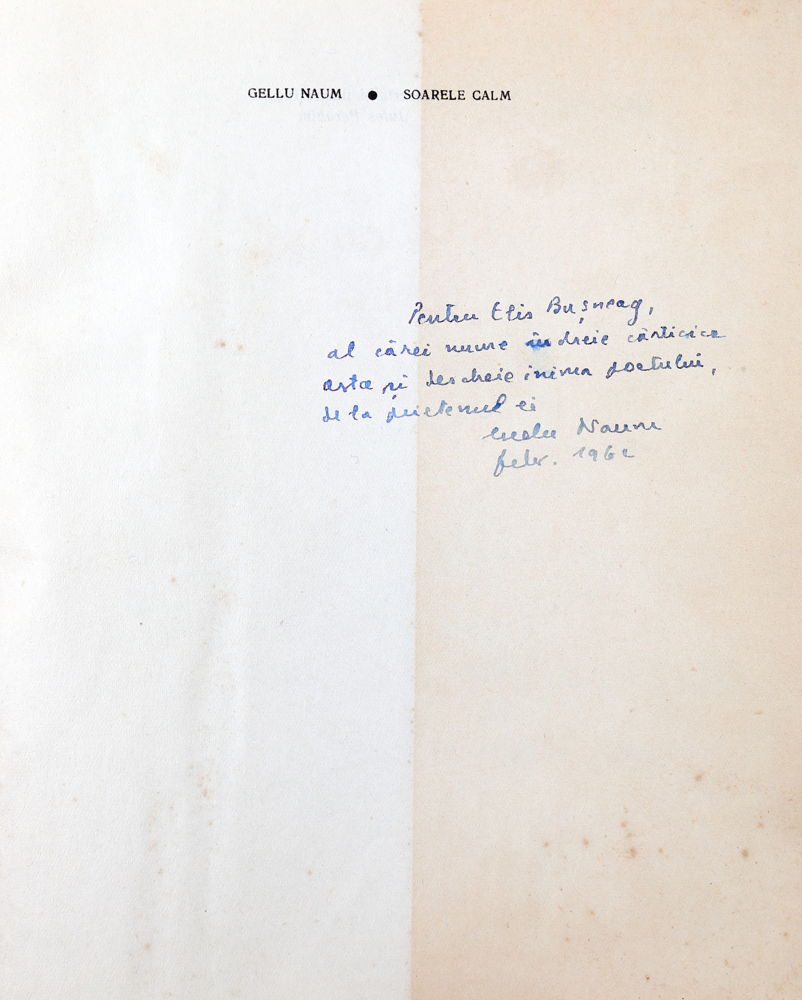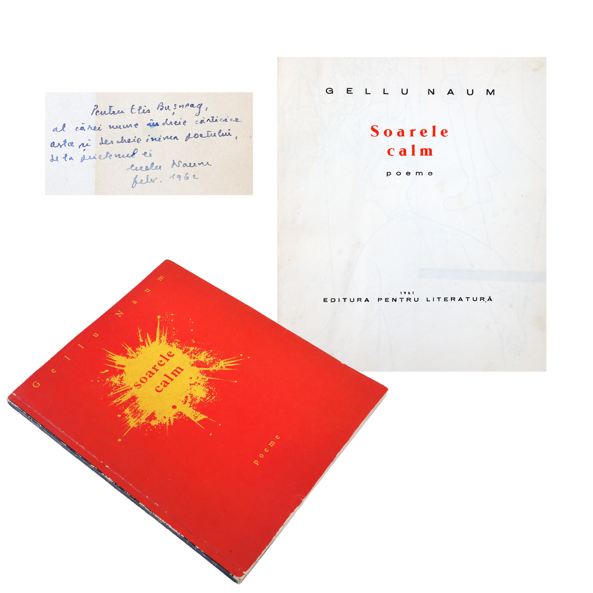 82. ”Soarele calm”, de Gellu Naum, București, 1961, cu o dedicație olografă pentru Elis Bușneag și semnătura autorului