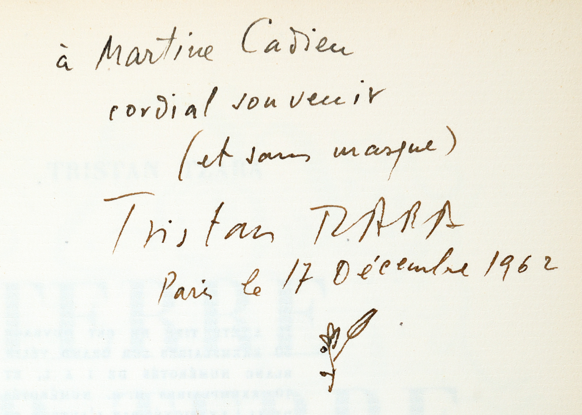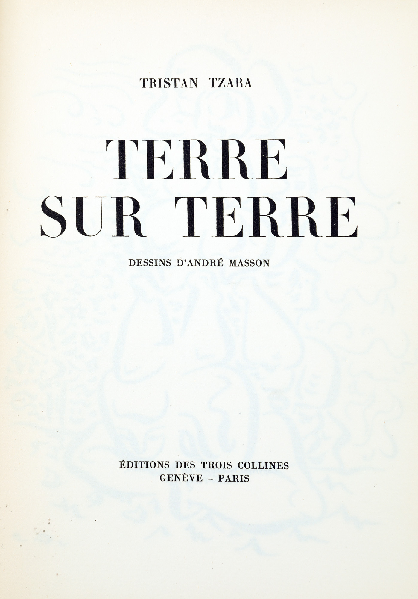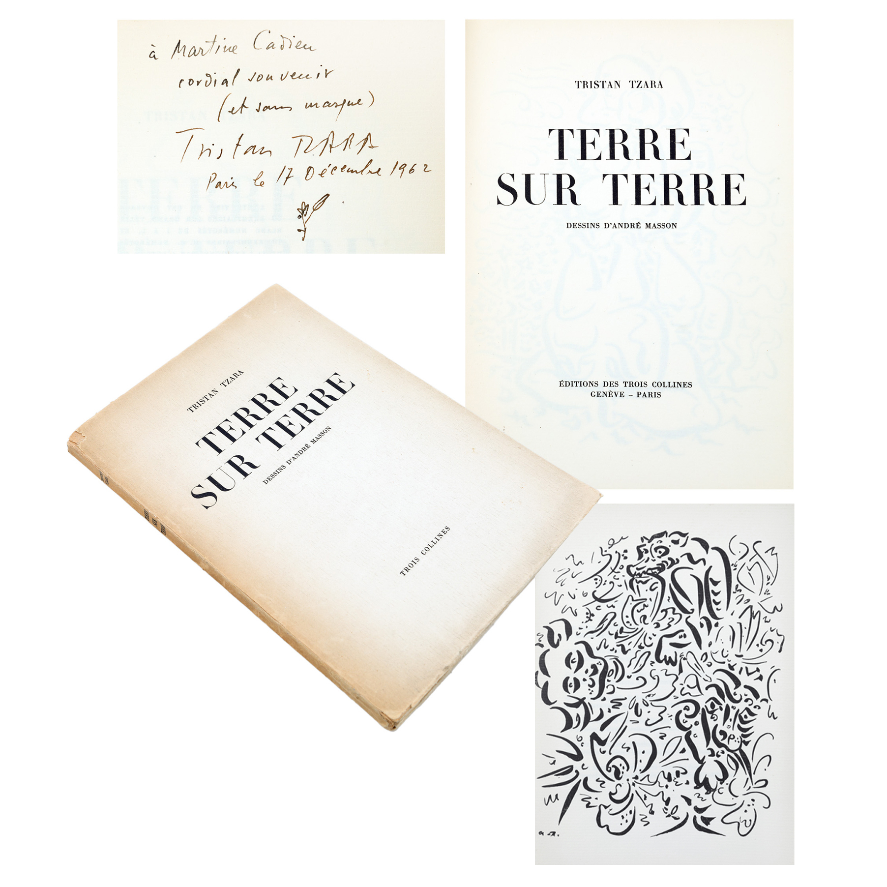 73. ”Terre sur terre”, de Tristan Tzara, franceză, Paris, 1946, cu desene de André Masson și dedicația cu semnătura olografă a autorului, exemplar 1583/3000