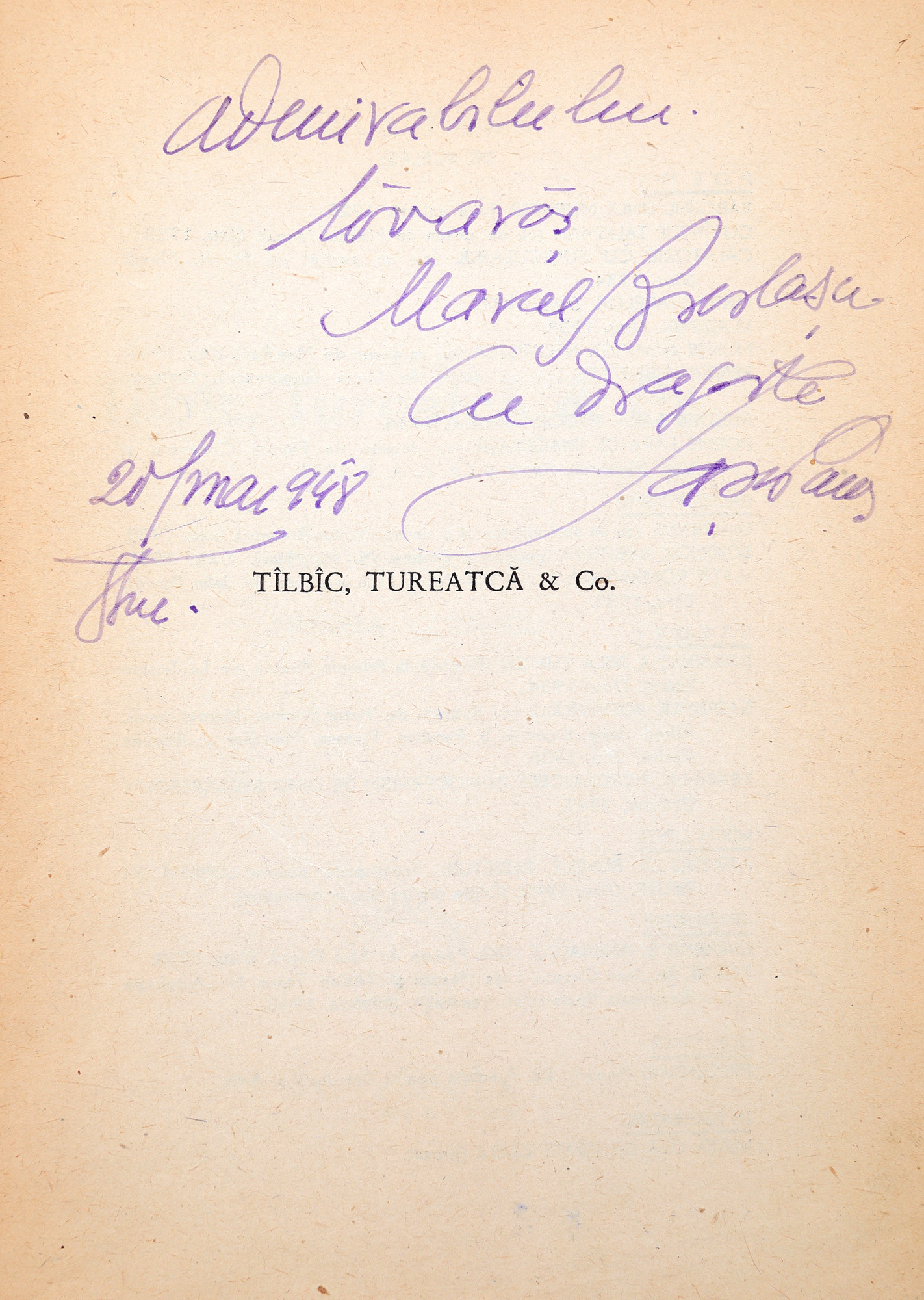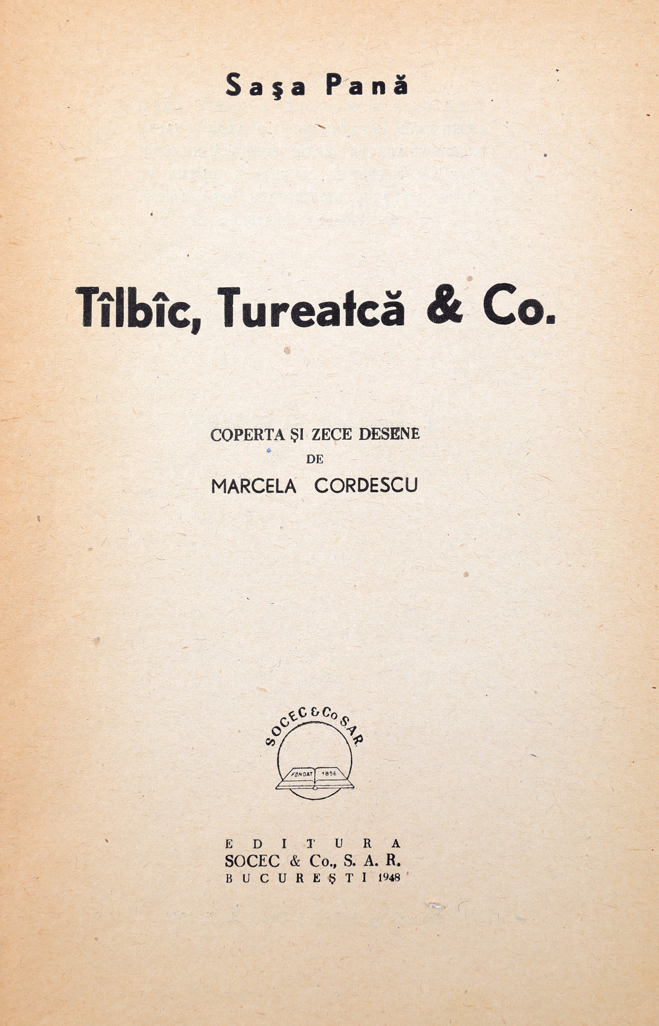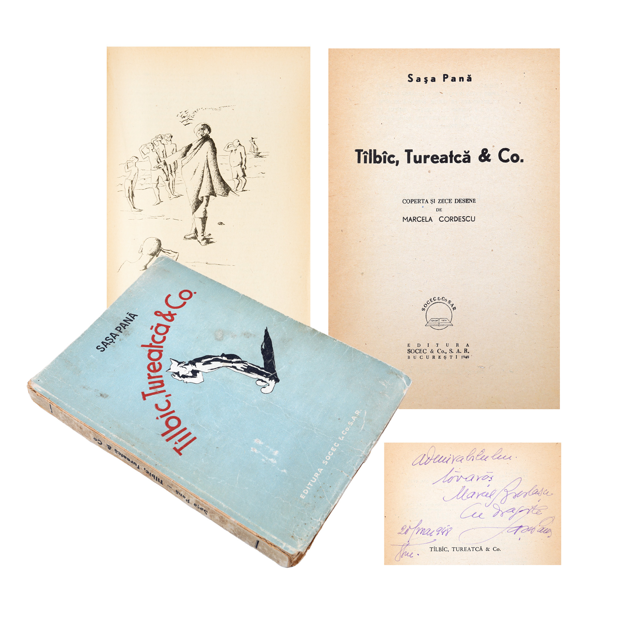 81. ”Tîlbîc, Tureatcă&Co.”, de Sașa Pană, ediție priceps, București, 1948, cu desene de Marcela Cordescu și o dedicație olografă către poetul Marcel Breslașu