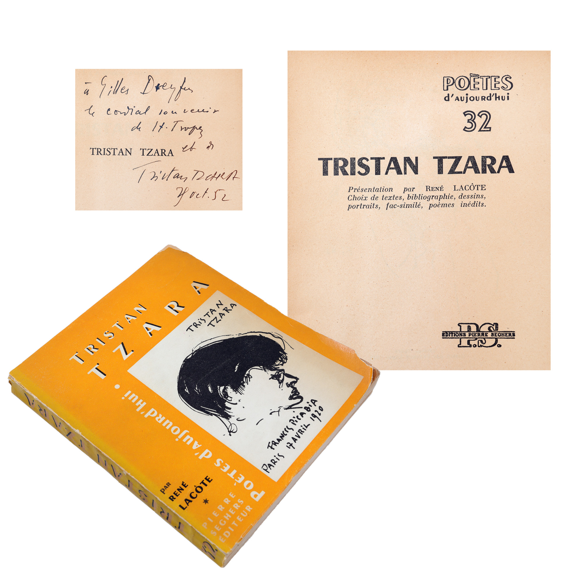 74. ”Tristan Tzara”, de René Lacòte, franceză, Paris, 1952, cu dedicația si semnătura lui Tristan Tzara, 28 octombrie 1952