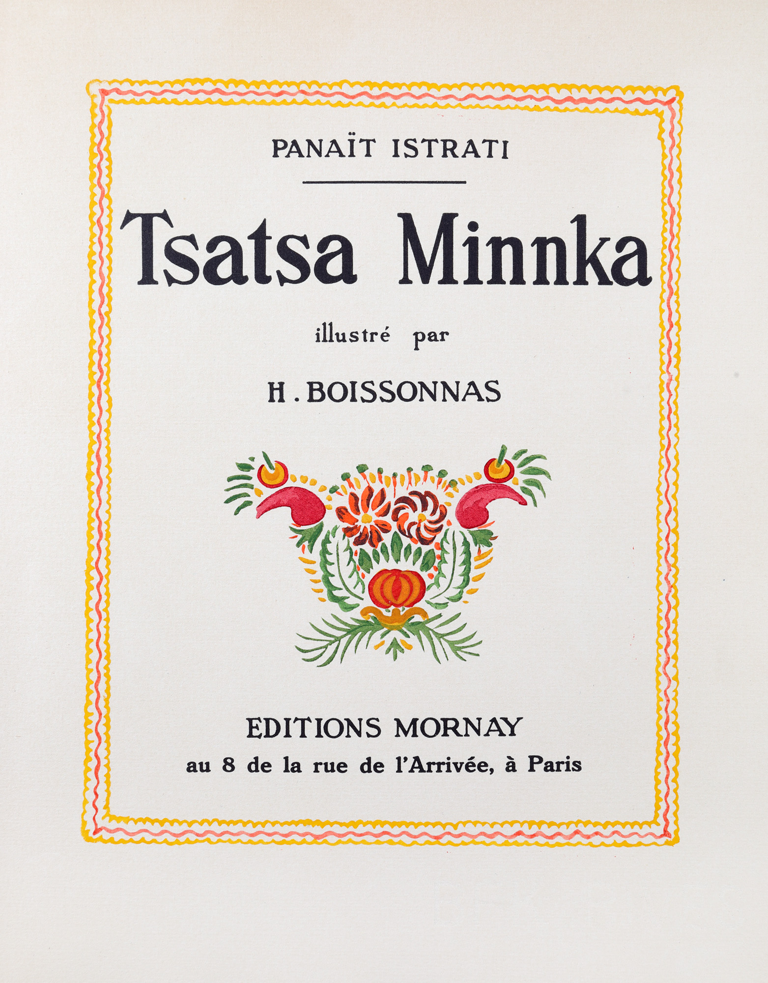 64. ”Tsatsa Minnka”, de Panait Istrati, cu ilustrații de H. Boissonnas, franceză, Paris, 1930, exemplar bibliofil, netăiat, numerotat 484/735