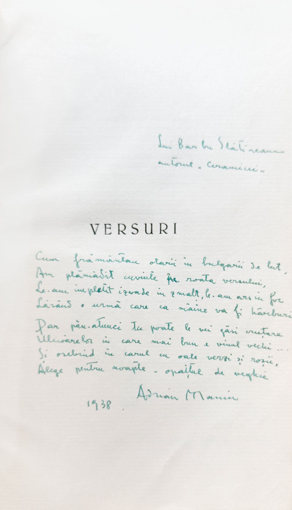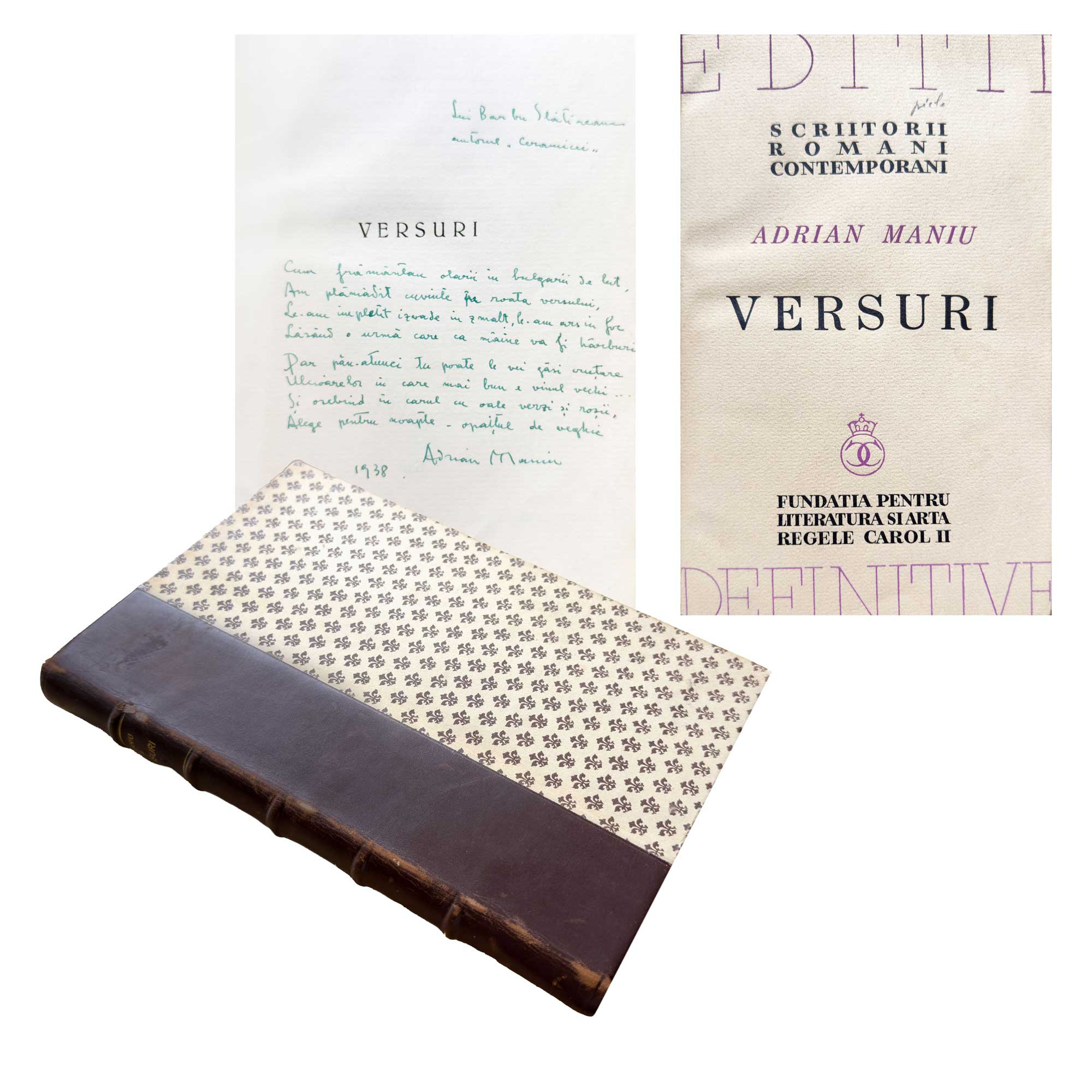 86. ”Versuri”, de Adrian Maniu, București, 1938, cu dedicație sub formă de poezie către colecționarul Barbu Slătineanu și semnătura olografă a autorului, exemplar 60/1200