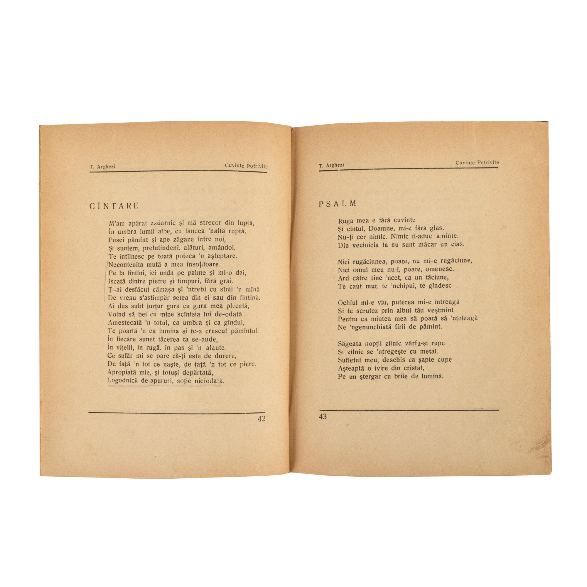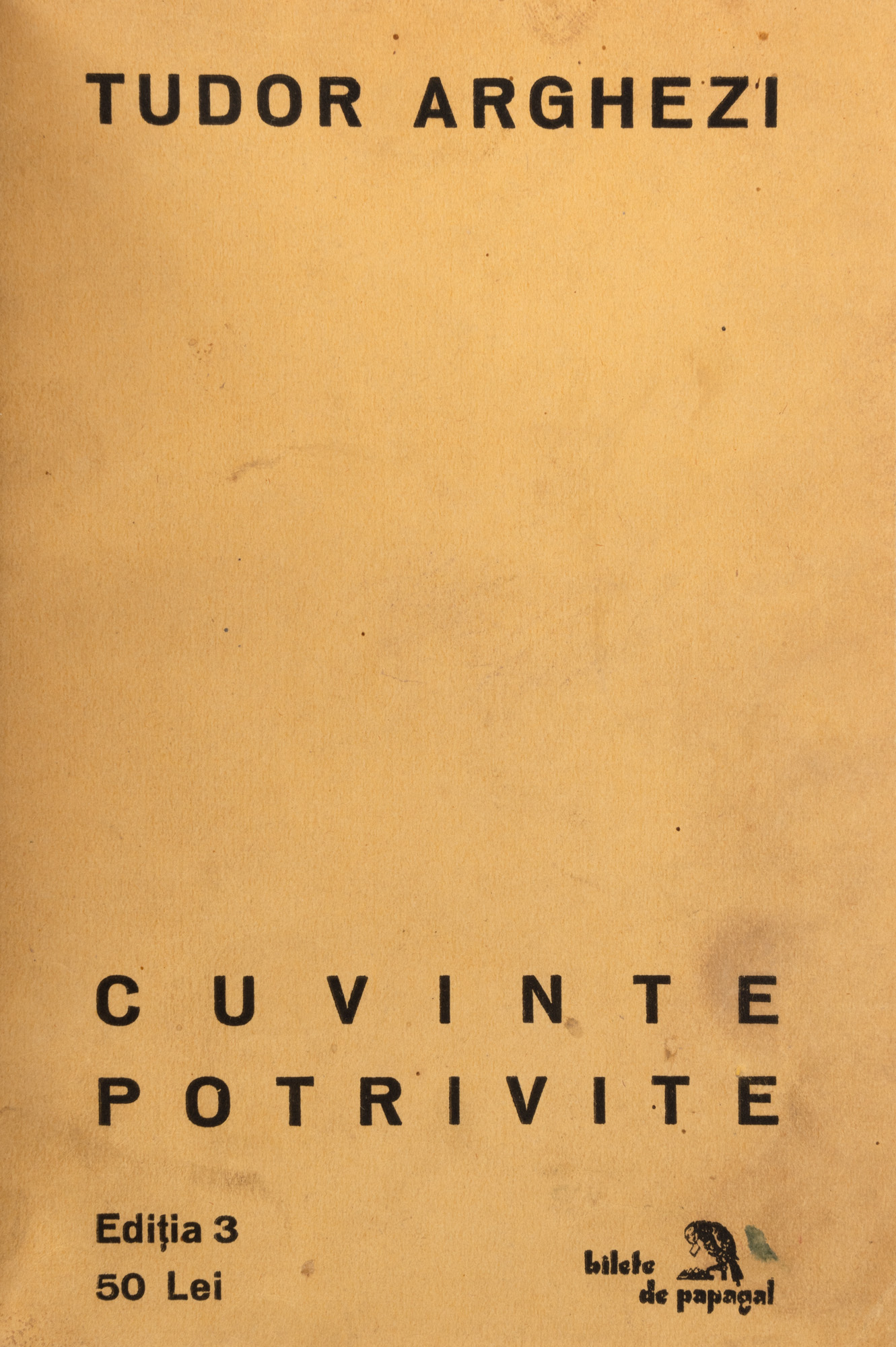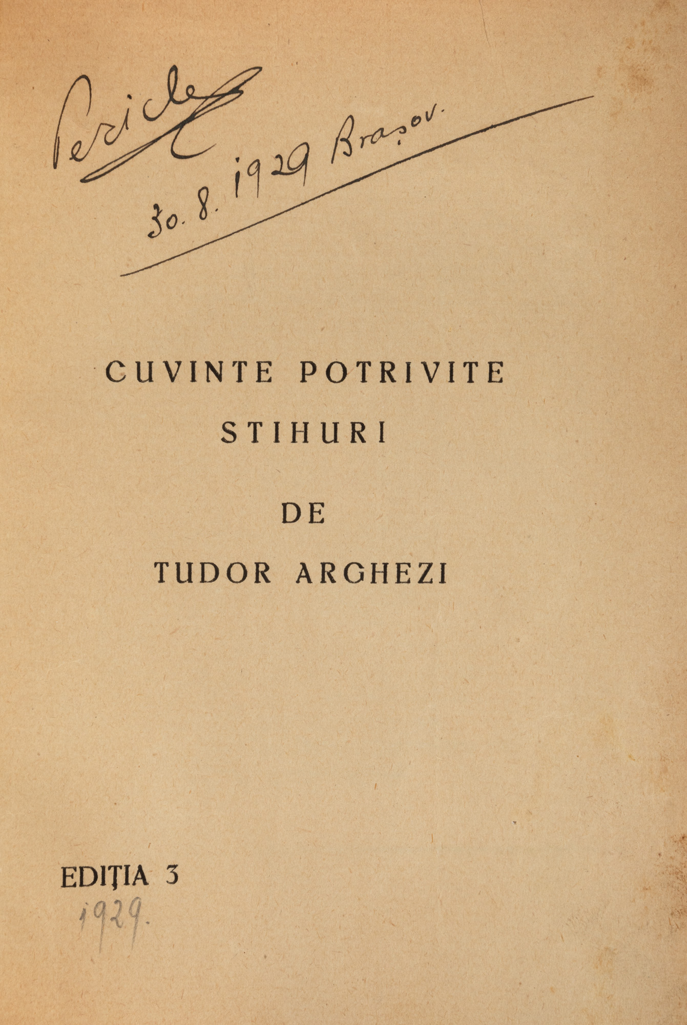 12. ”Cuvinte Potrivite”, de Tudor Arghezi, București, 1929, cu dedicație și semnătură olografe ale autorului, provin din colecția scriitorului Pericle Martinescu