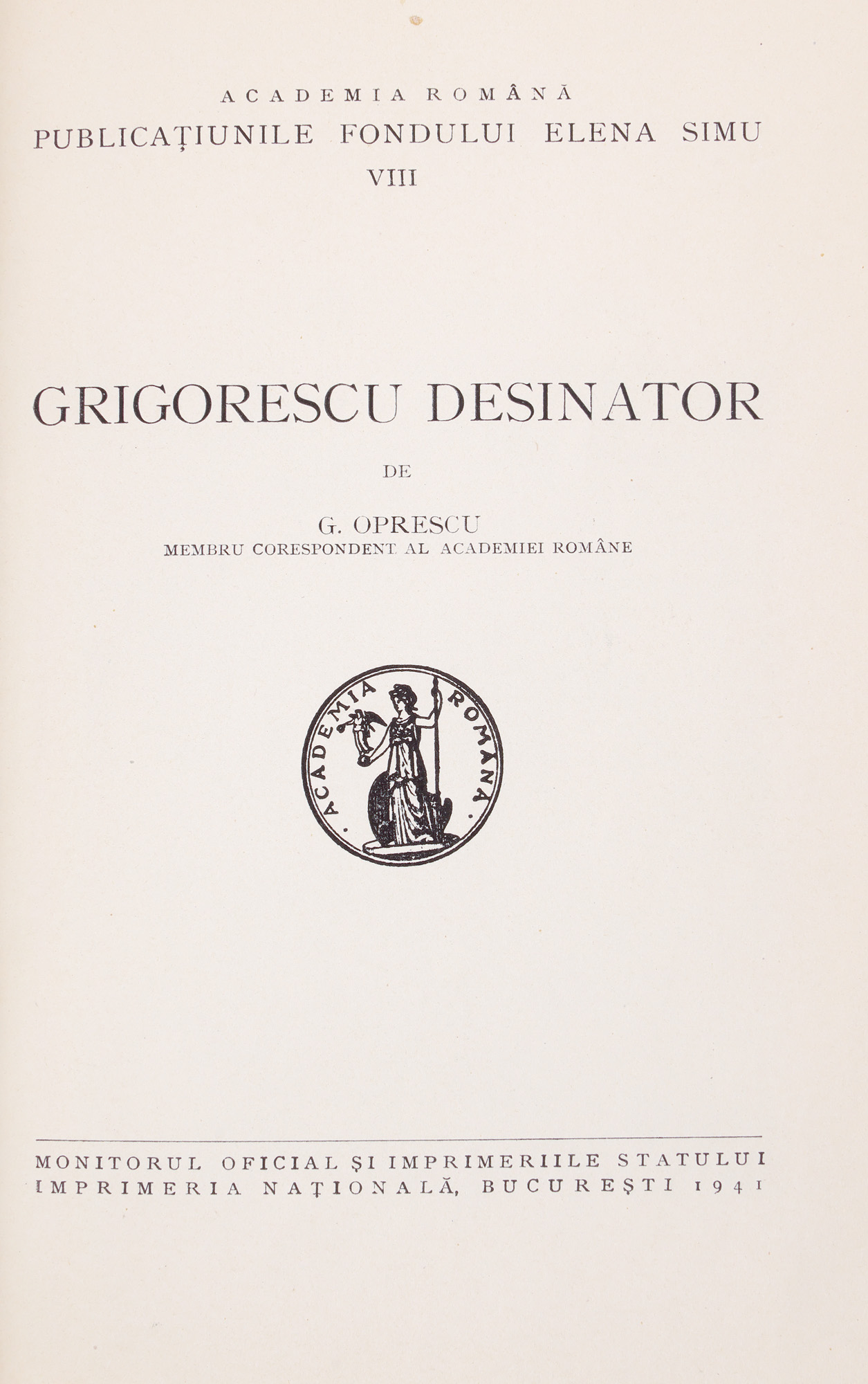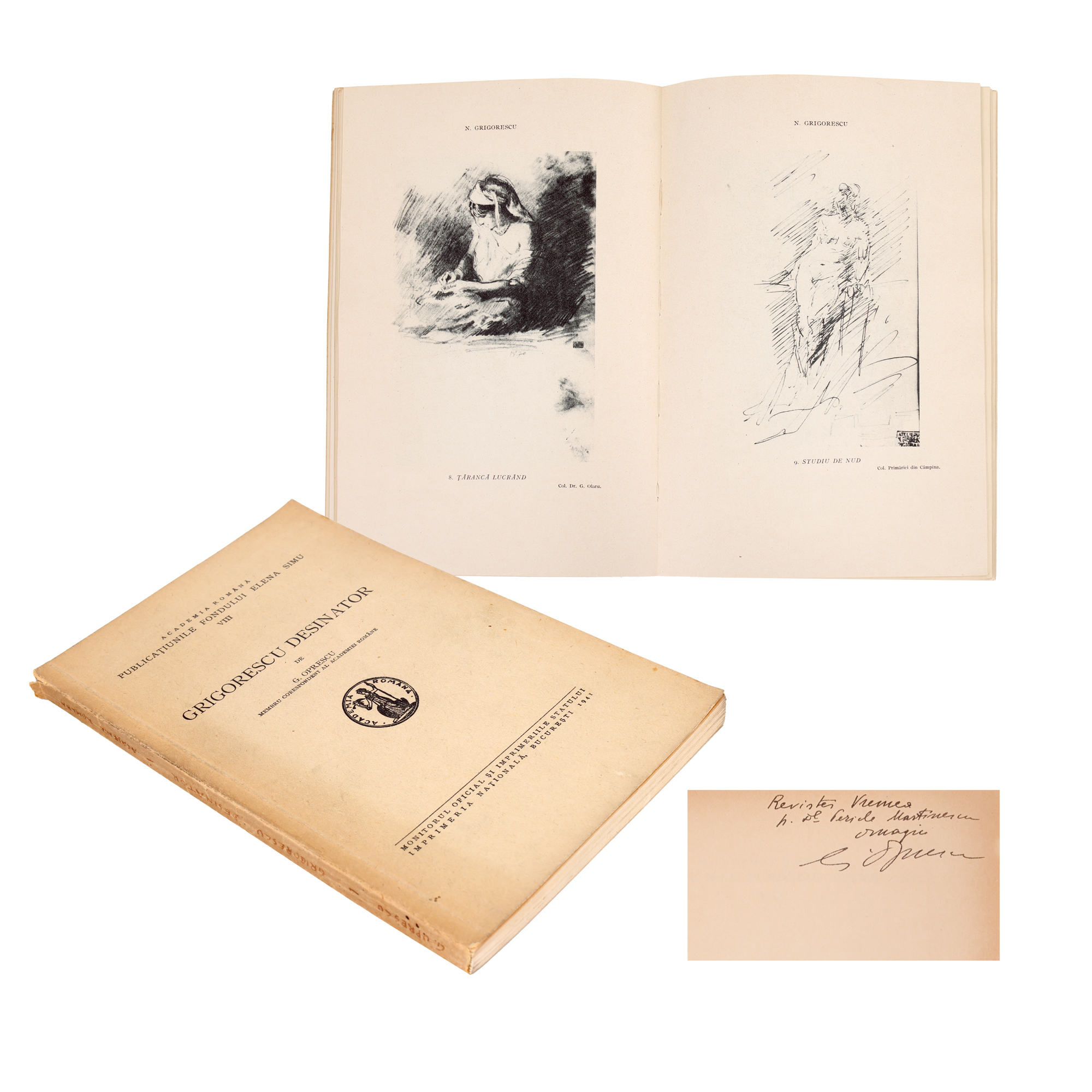70. ”Grigorescu desinator”, de George Oprescu, București, 1941, cu dedicația olografă a autorului, provine din colecția scriitorului Pericle Martinescu