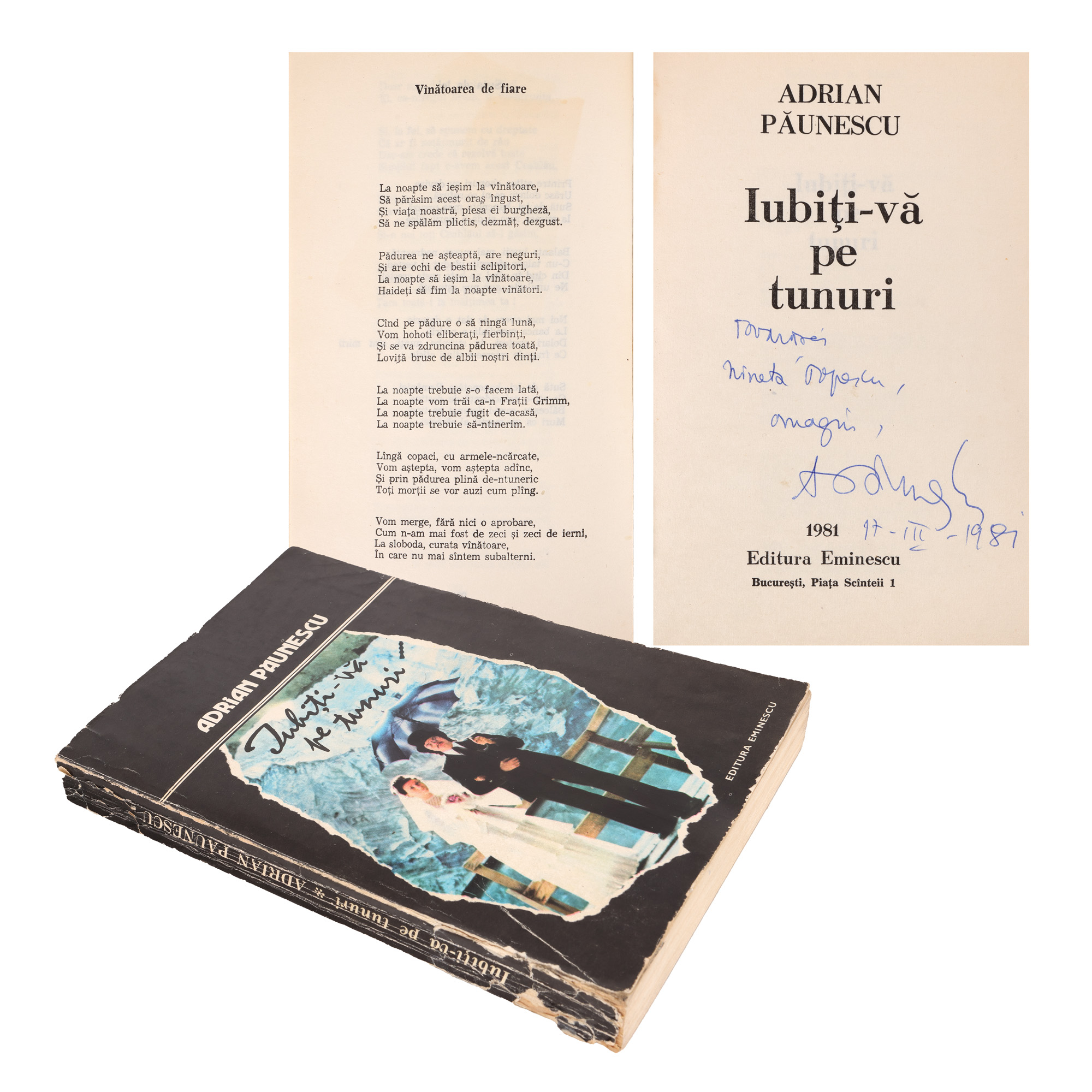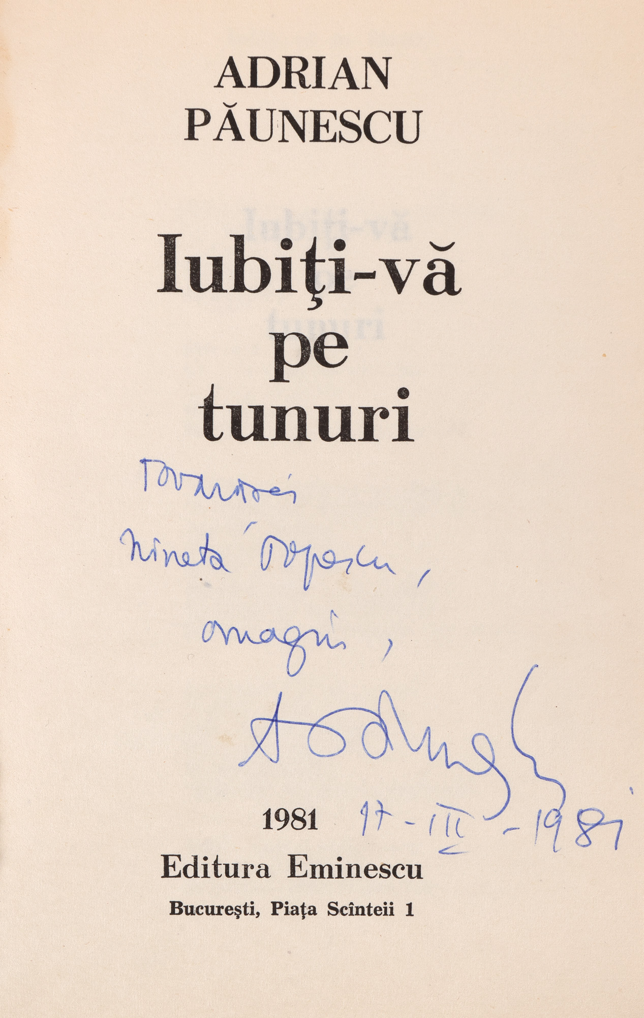 50. ”Iubiți-vă pe tunuri”, de Adrian Păunescu, București, 1981, cu dedicația și semnătura olografă a autorului