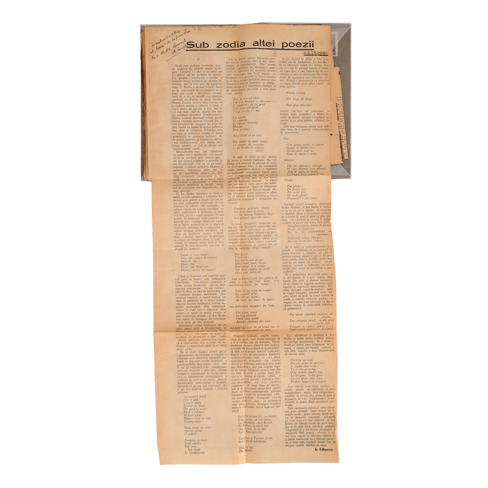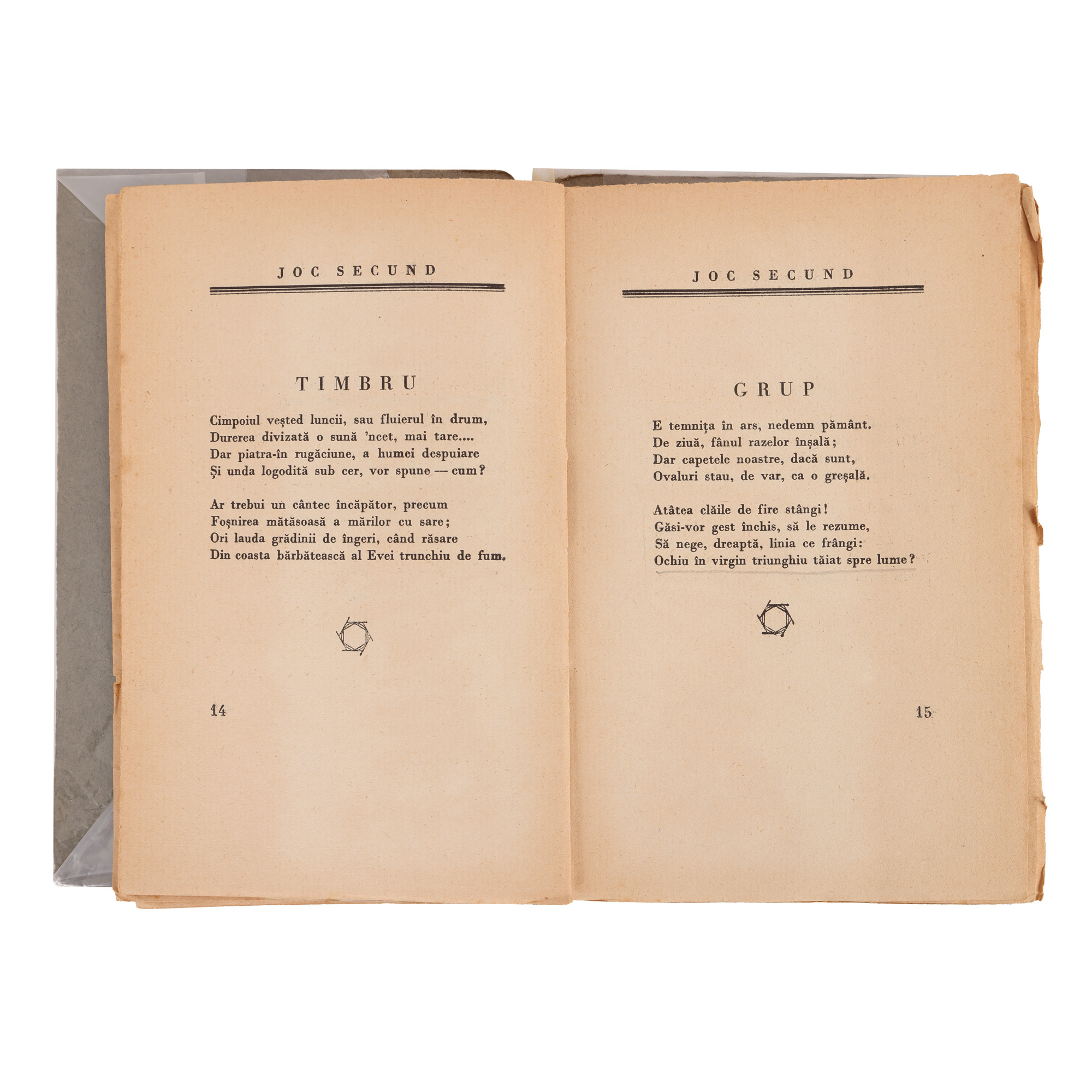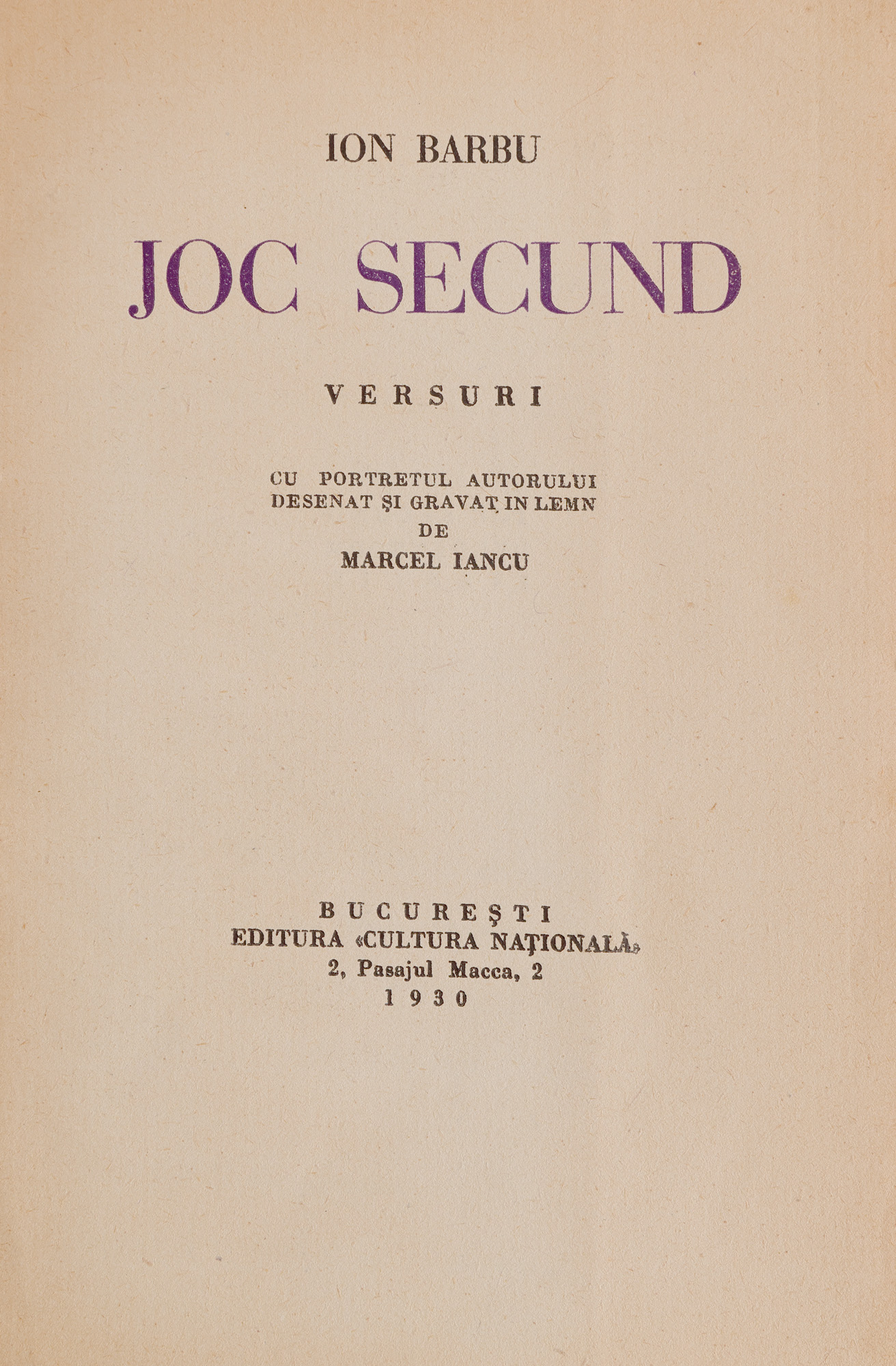 28. ”Joc Secund”, de Ion Barbu, ediție princeps, București, 1930, cu un portret de Marcel Iancu, cu ex-librisul scriitorului Pericle Martinescu, din a cărui colecție provine, cu însemnările acestuia și tăieturi din reviste literare