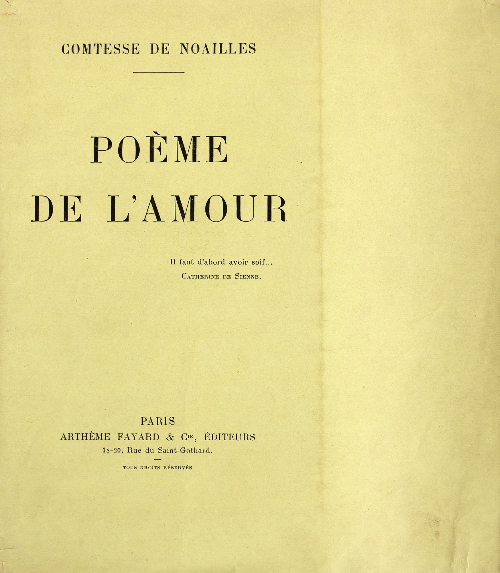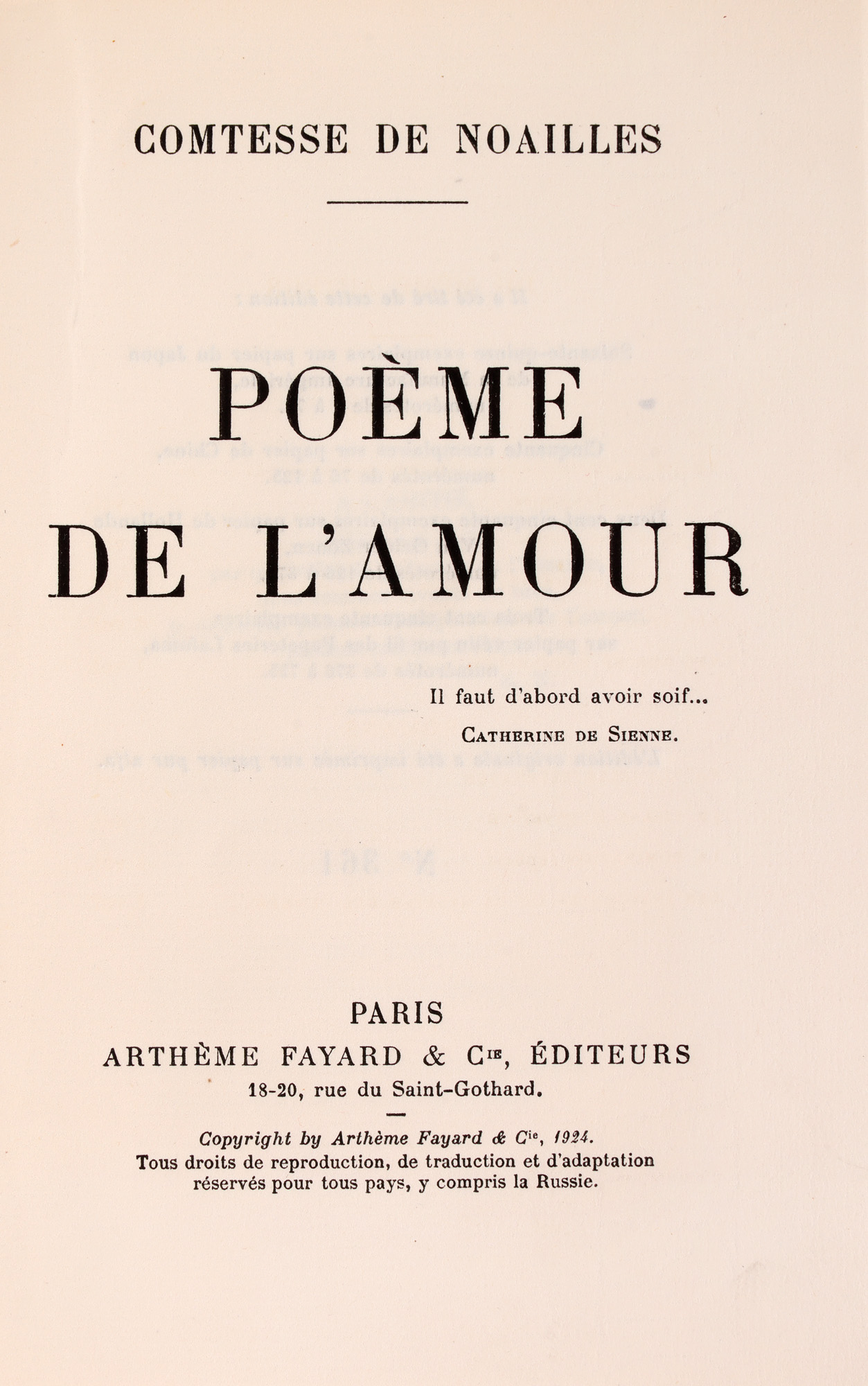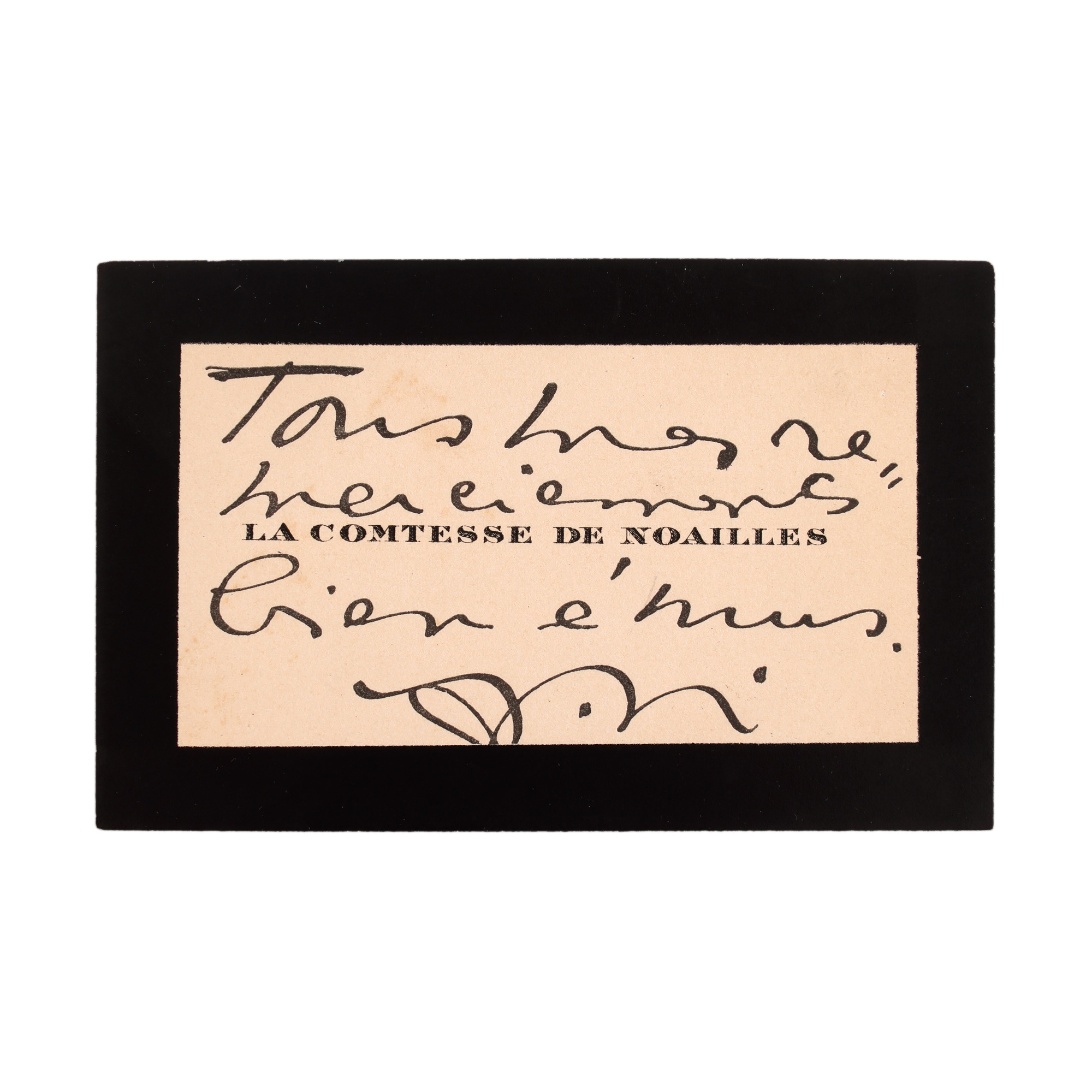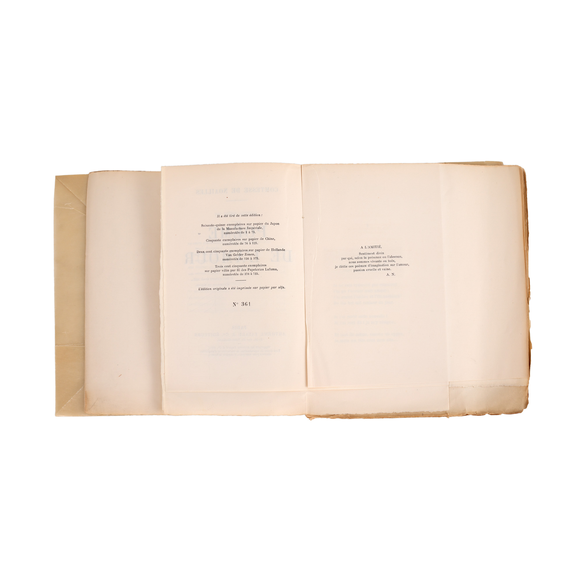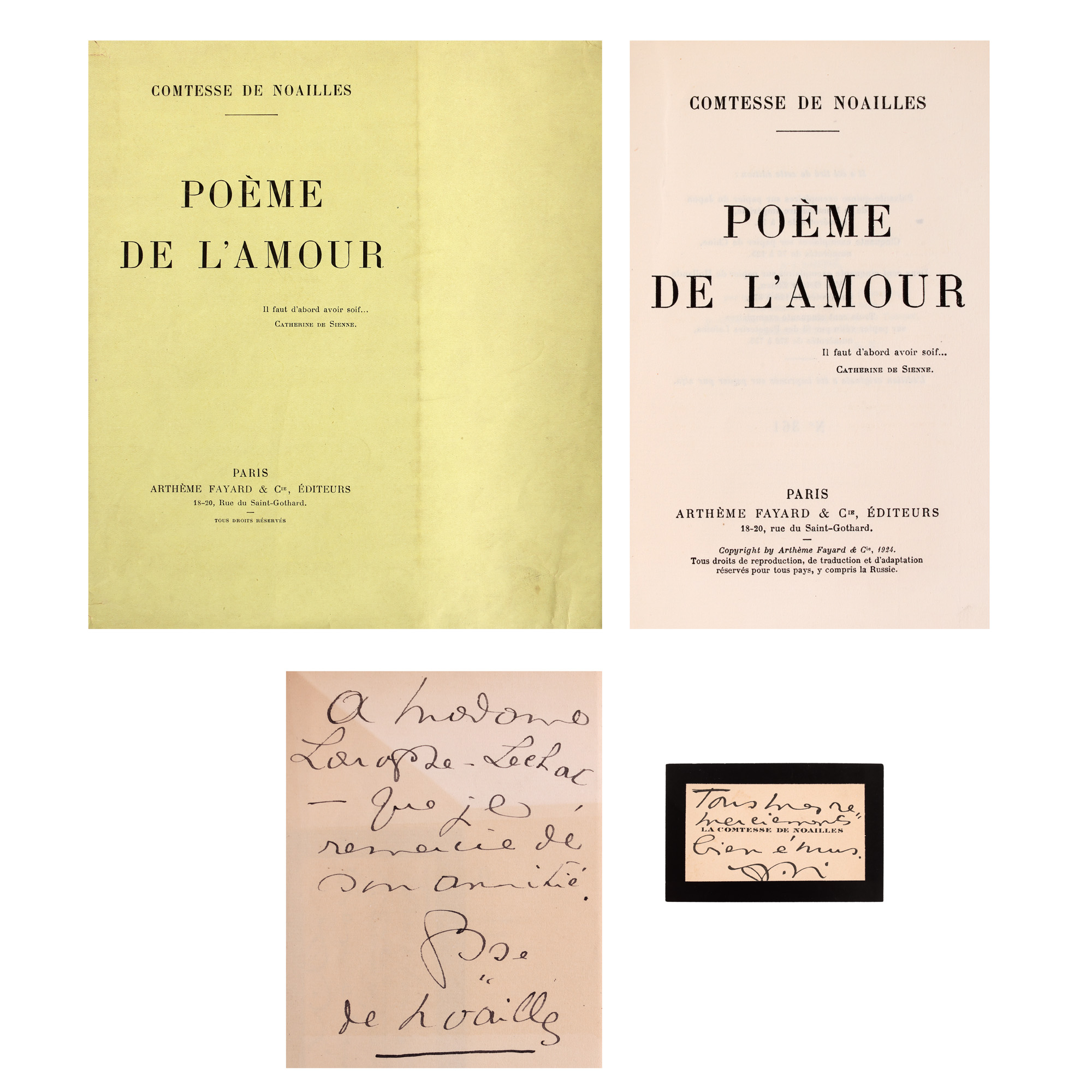 68. Lot format din carte de vizită și ”Poèmes de l'amour”, de Ana Brâncoveanu, contesă de Noailles, franceză, Paris, 1924, exemplar editorial de probă, netăiat, cu dedicația autorului